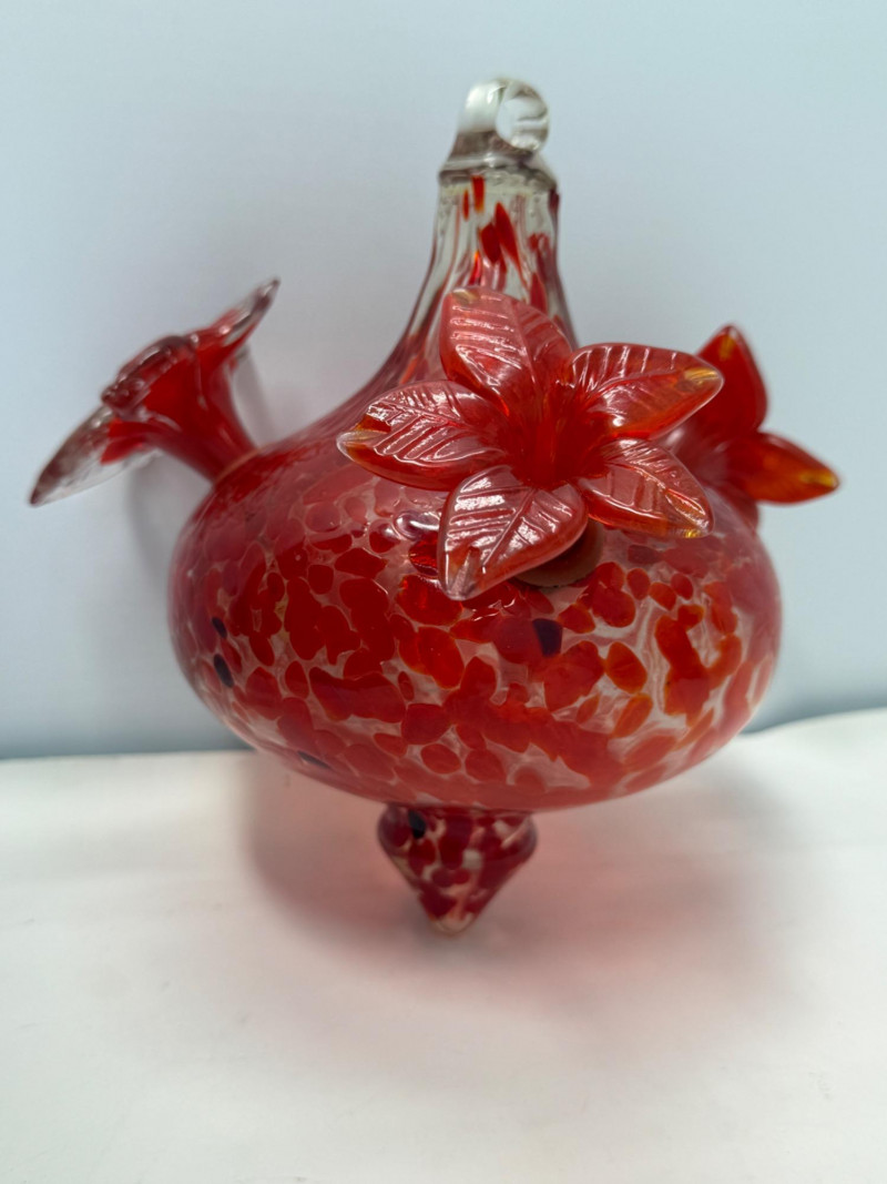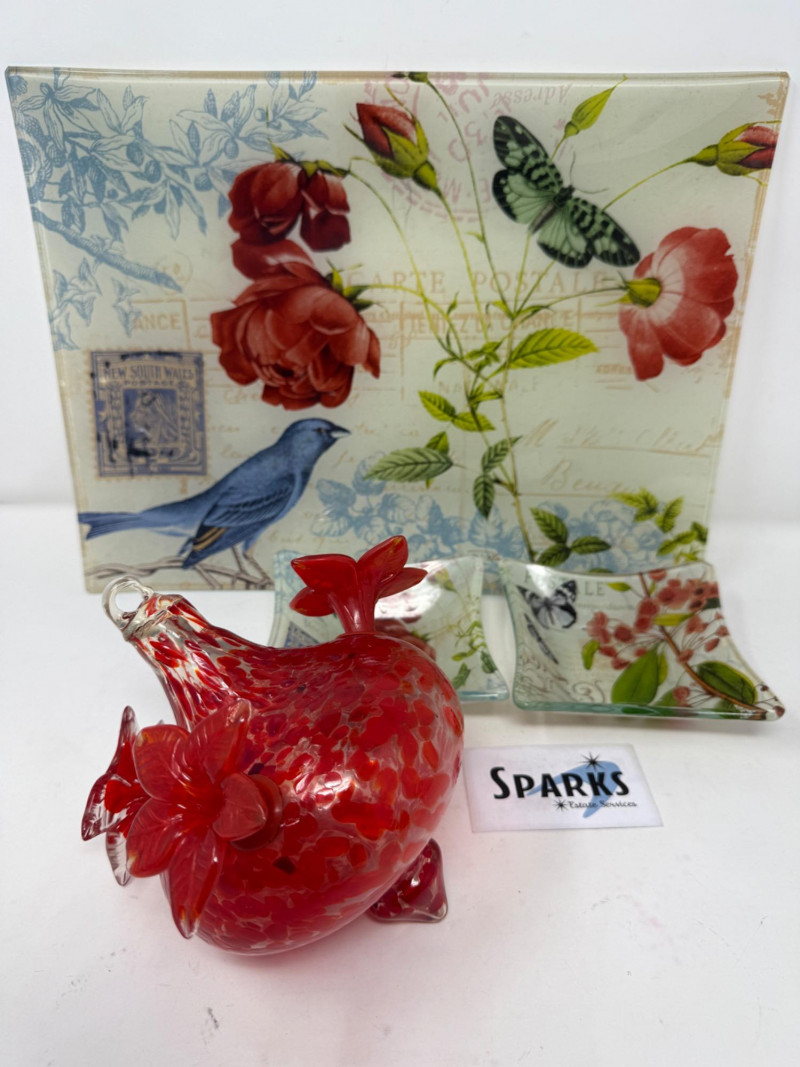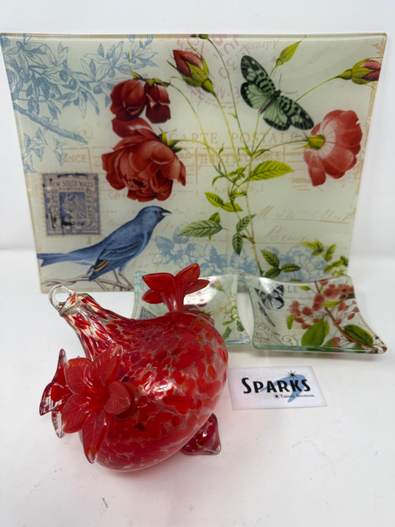 Lot # 28 - Glass Tray & Dishes & Handblown Hummingbird Feeder