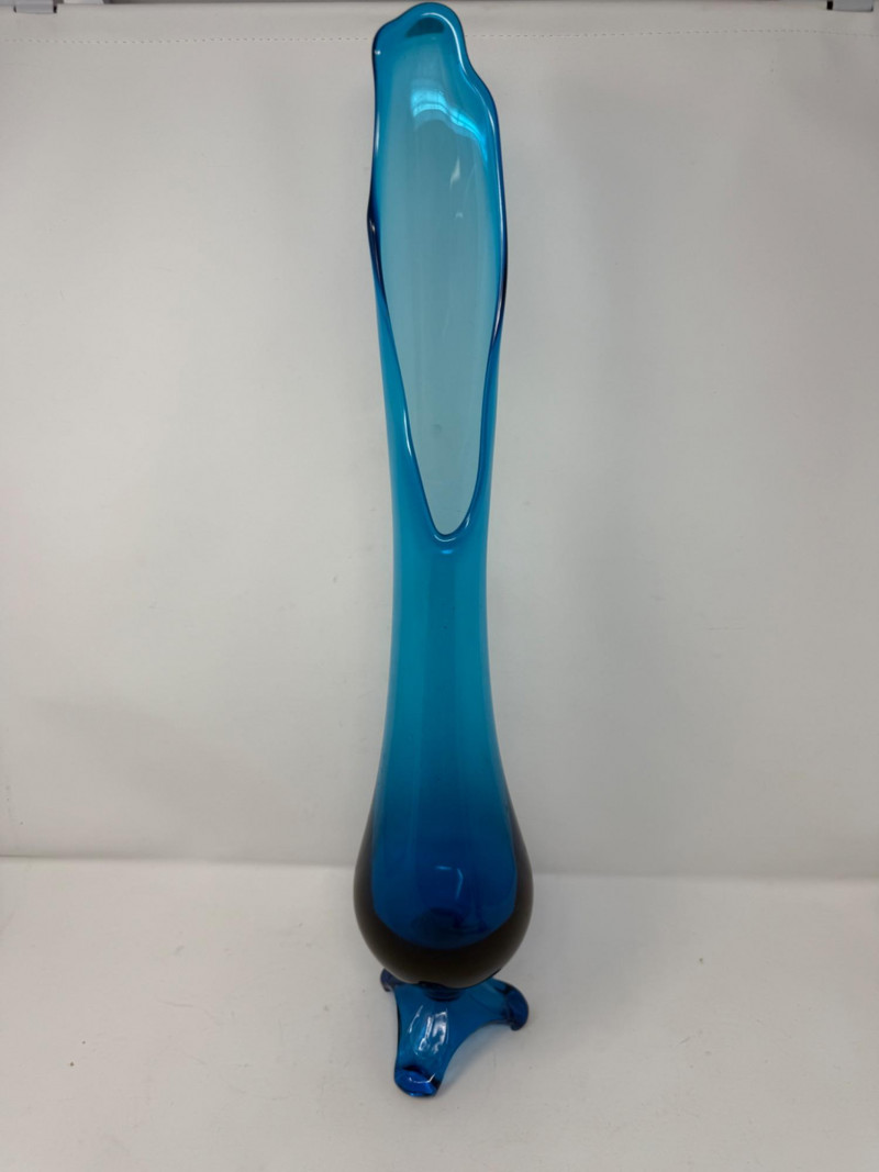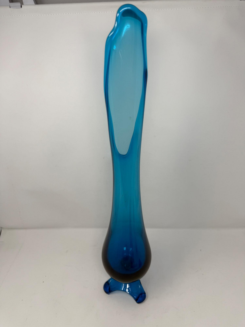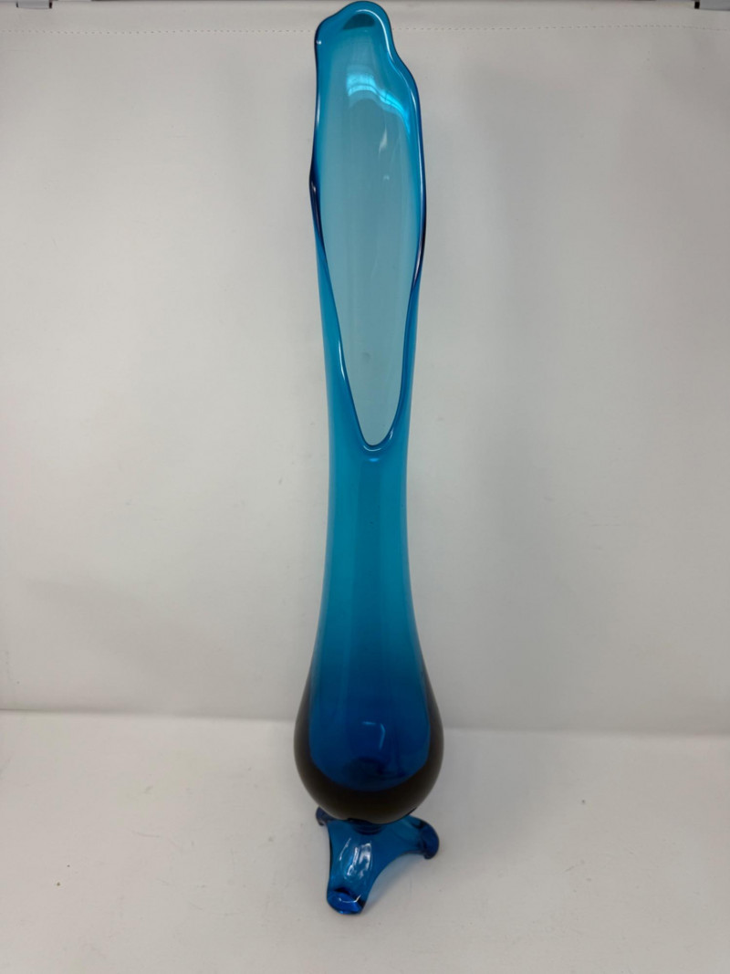 Mid-Century Peacock Blue Swung Glass Vase is 4.5x22”