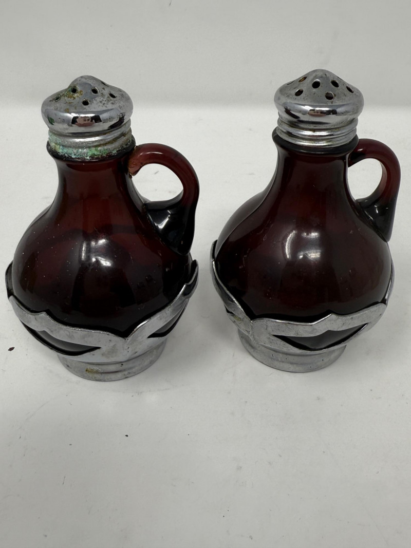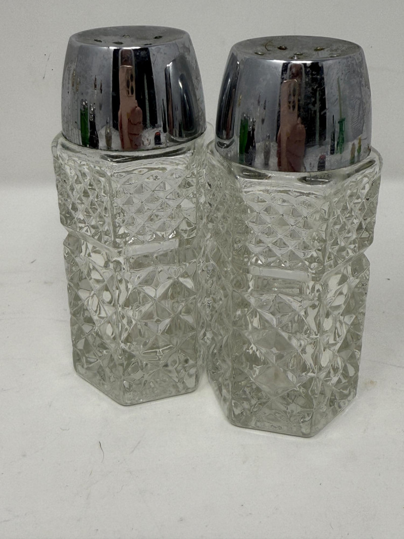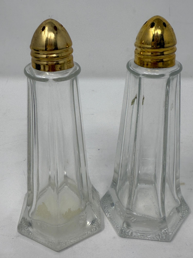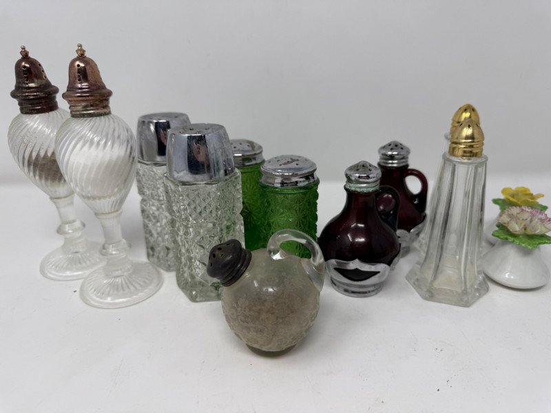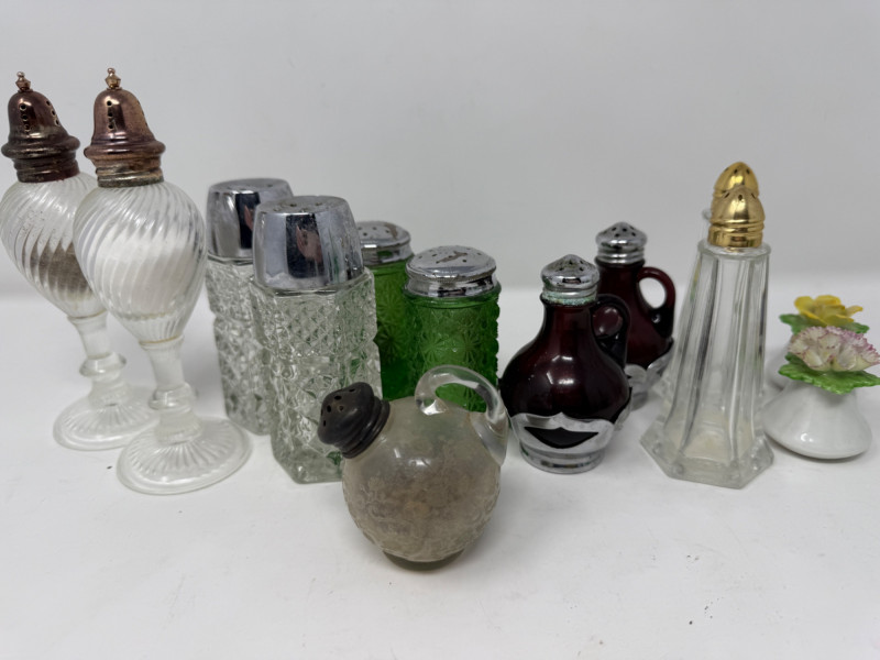 (6) Salt and Pepper Sets and one extra. Halco Anchor Hocking Farber Bros Tallest are 6” Smallest are 2”