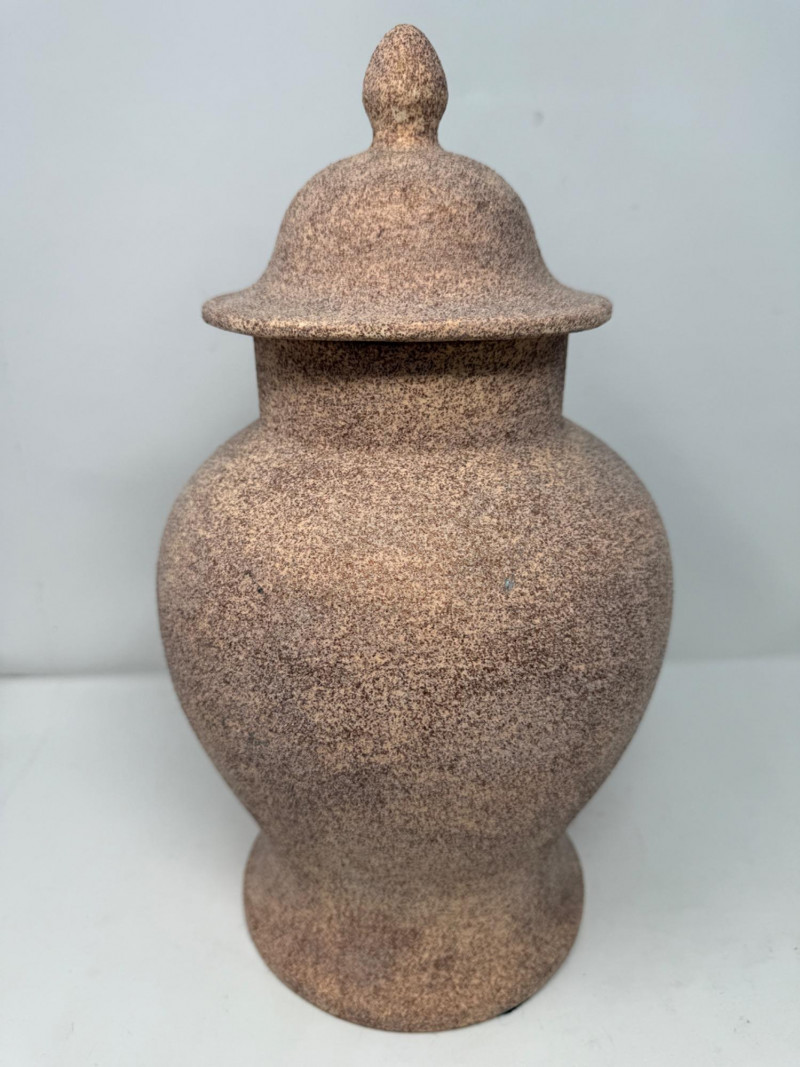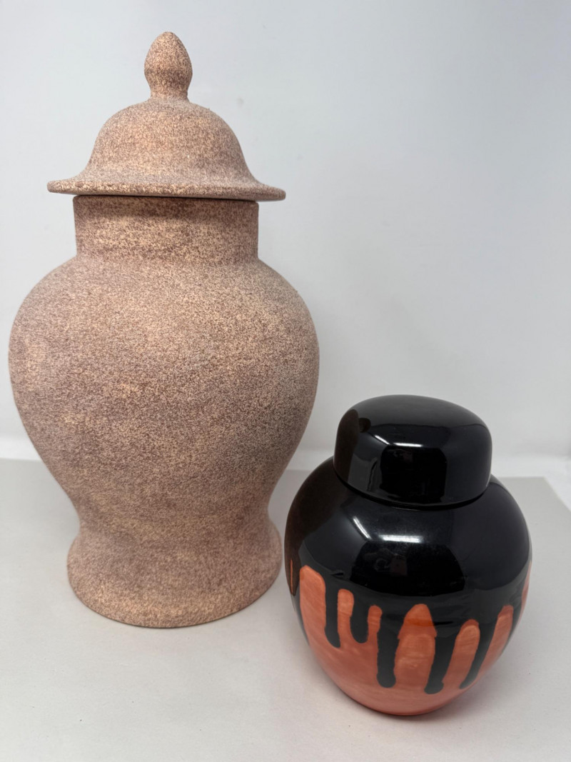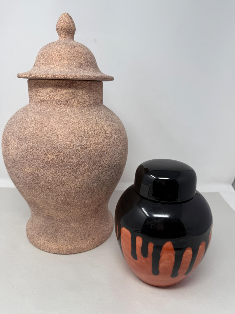 (2) Modern Ginger Jars 8.5x15 sanded texture lidded jar Drip glaze ginger jar by Holland Mold and painted by ND 5x7