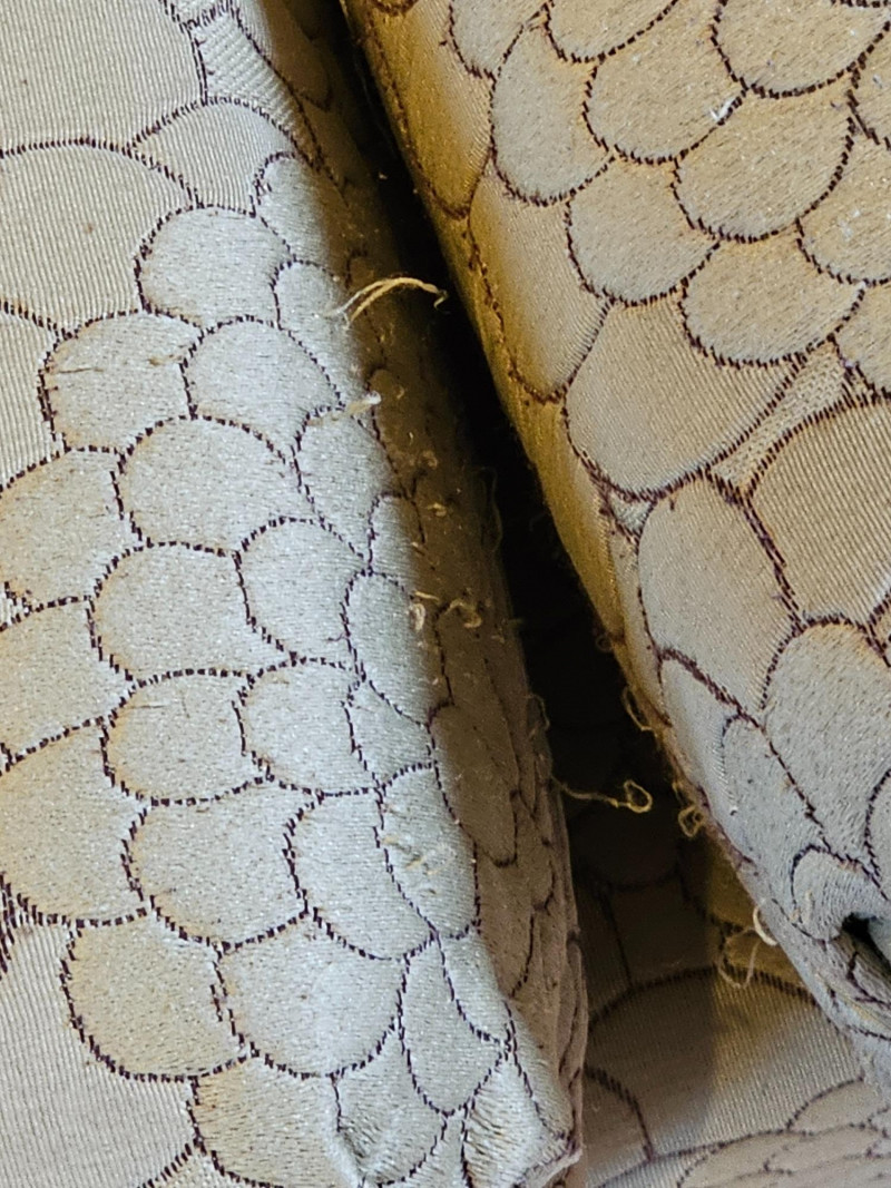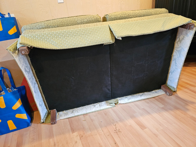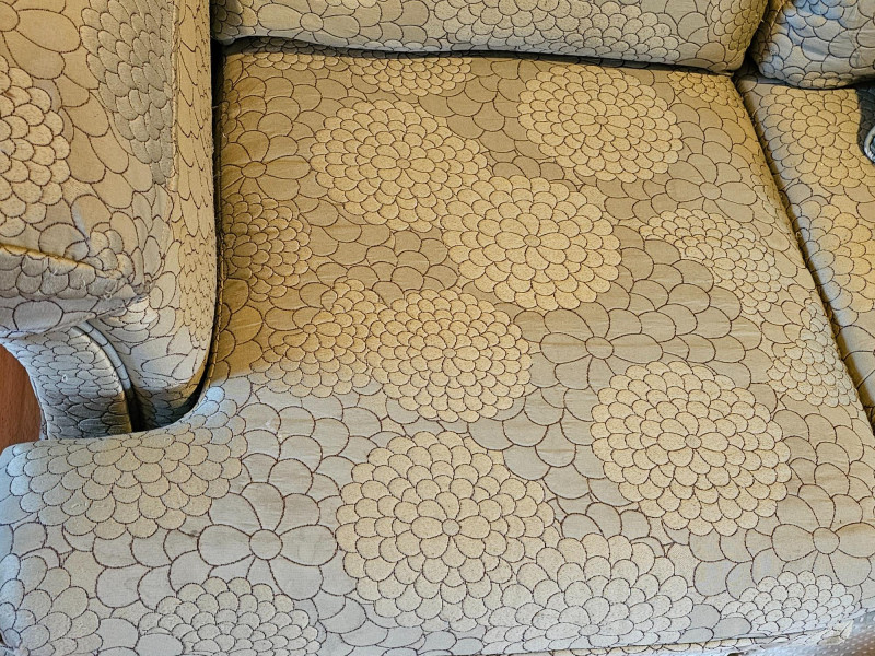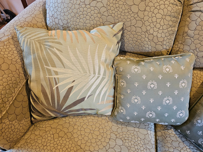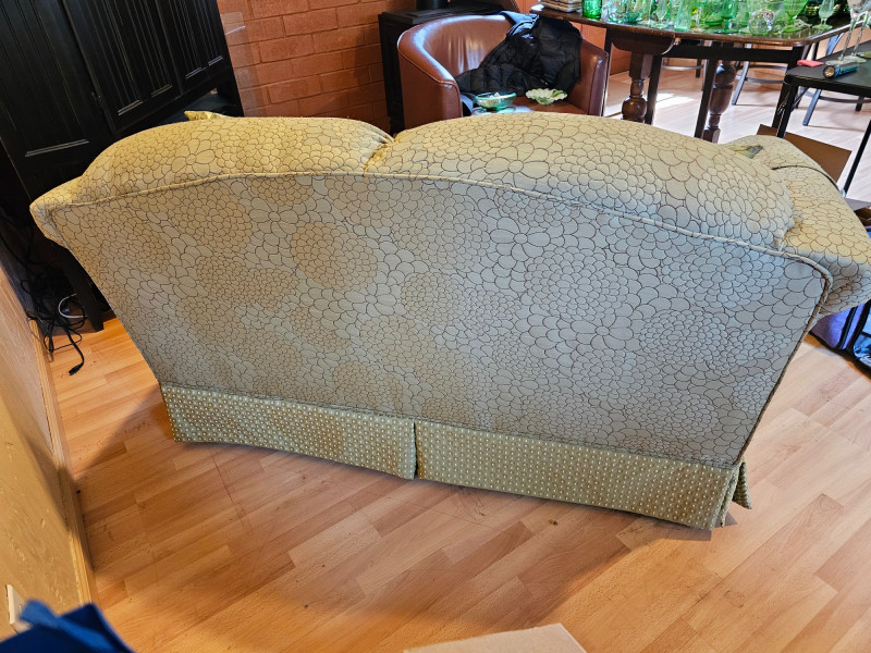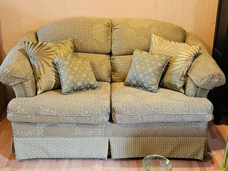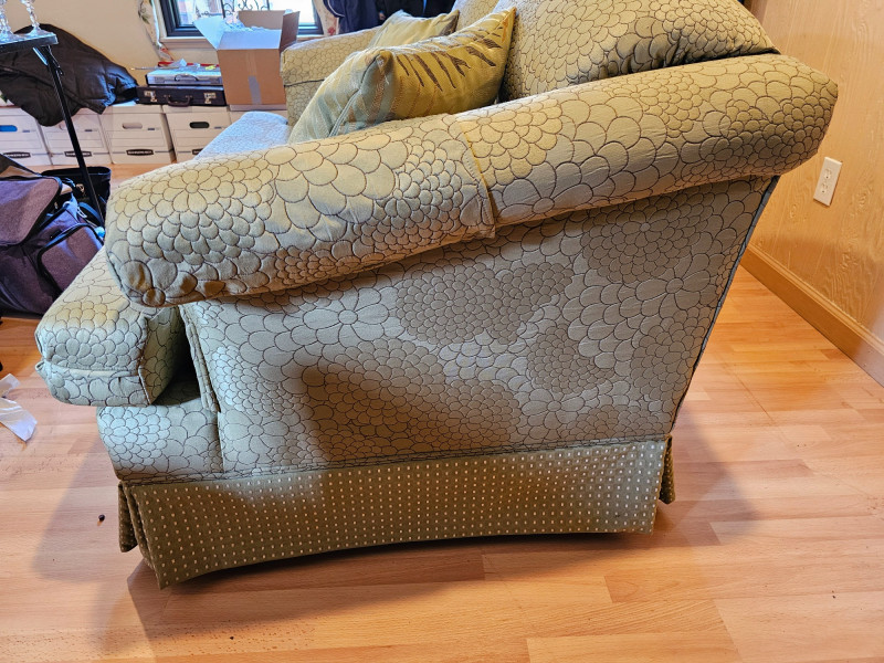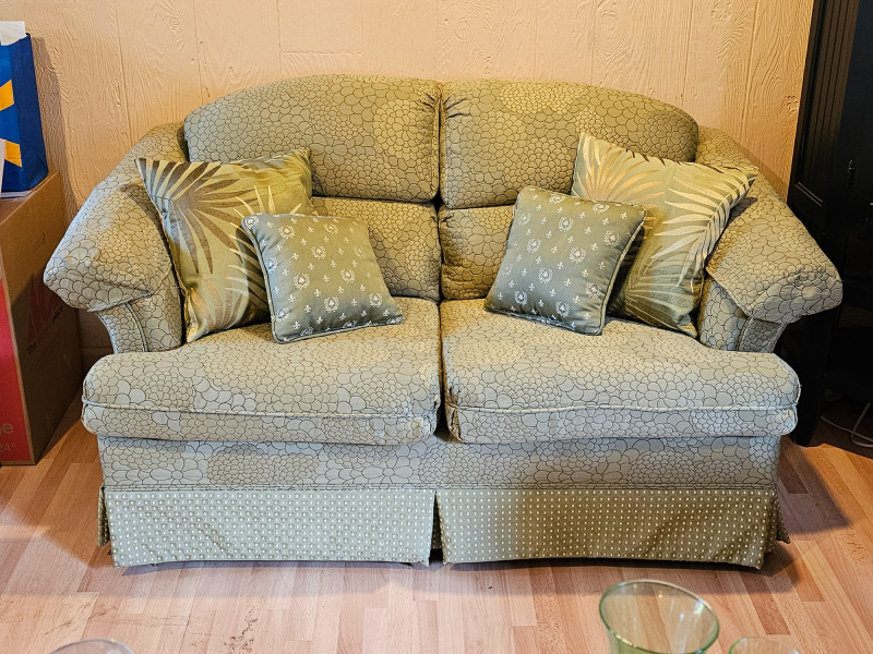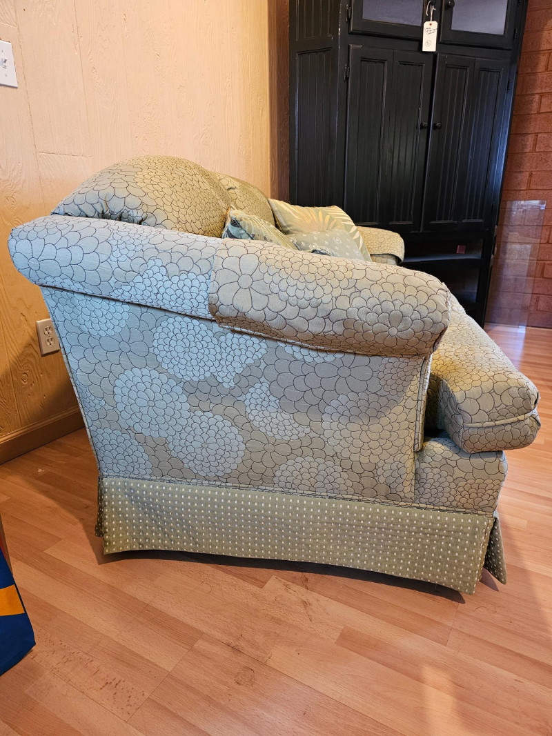 Green Floral Patterned Loveseat & 4 Green Pillows Nice soft green upholstery fabric. Extra of this fabric is available inthis auction. Includes 2 armrest covers & 4 pillows In good clean condition with a few loose threads on cushion 34"T x 60"W x 36"D