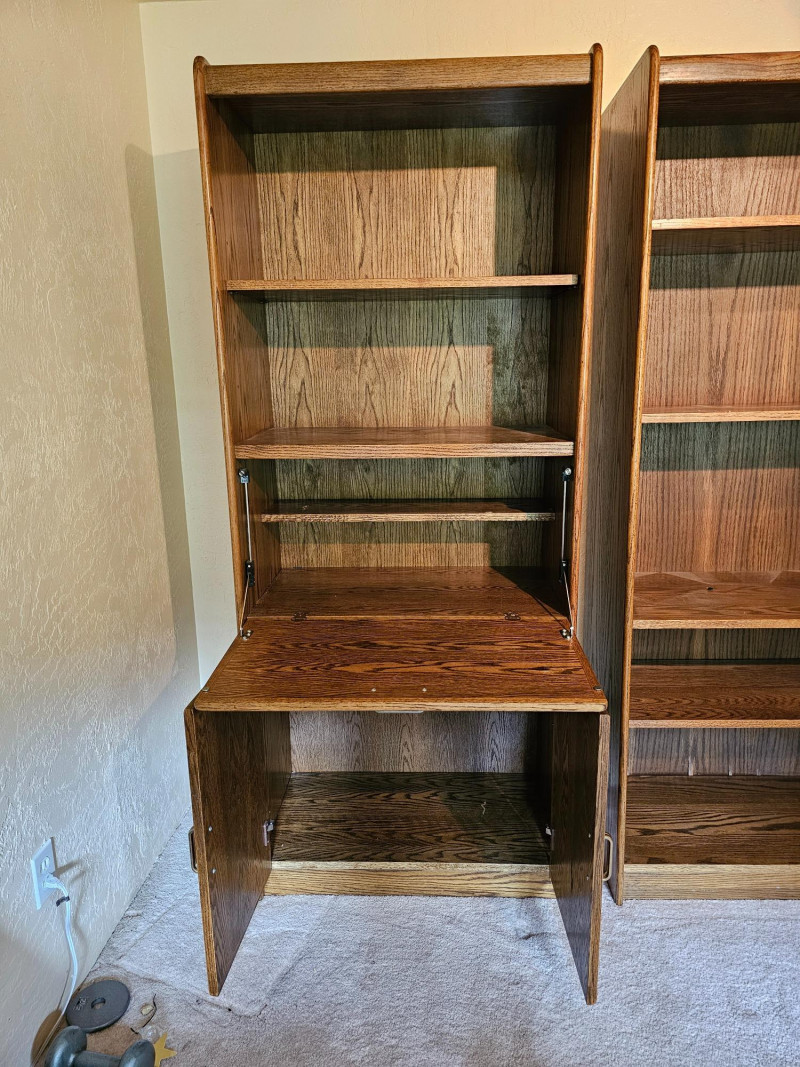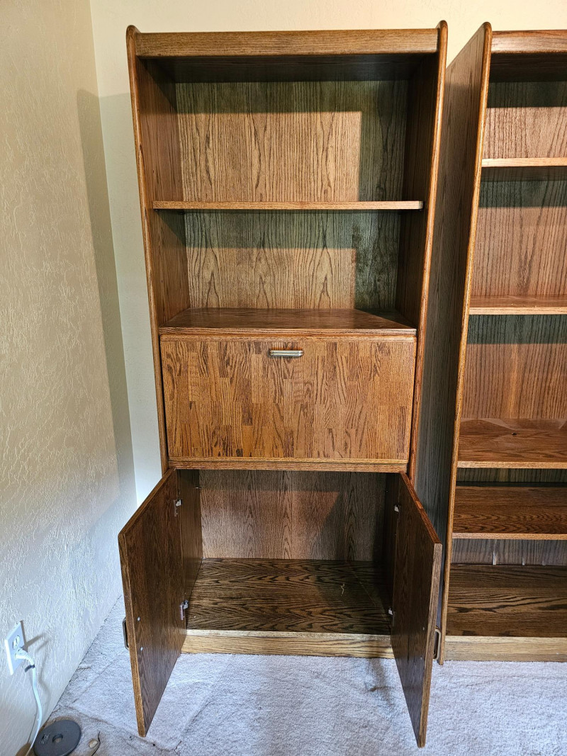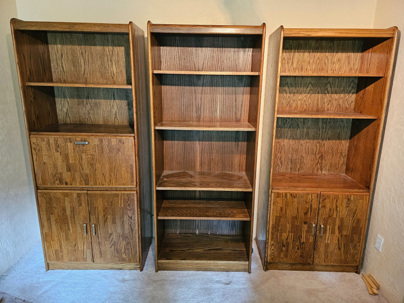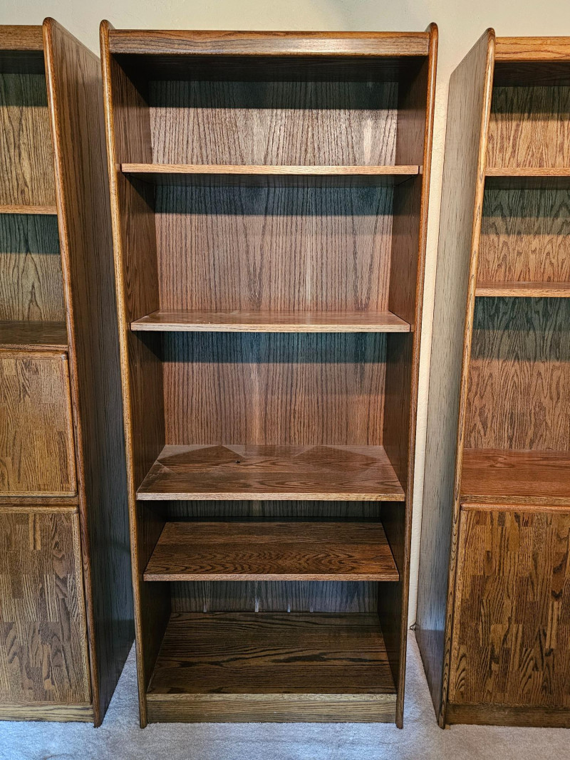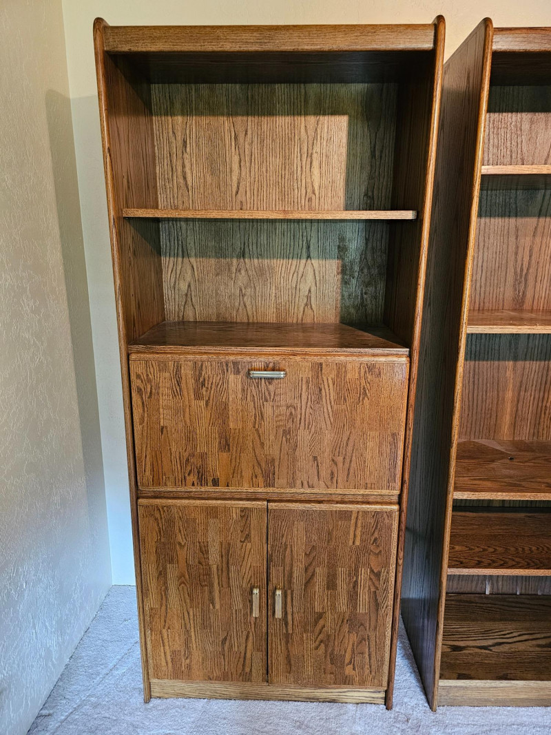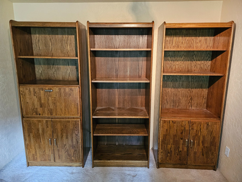 (3) Matching Dark Oak Finish Bookcase, Cabinet & Desk Units Bookcase unit has 1 fixed and 5 adjustable shelves Desk unit has pull-down desk with shelf, one adjustable shelf in upper, and 2-door cabinet on the bottom Pull-down desk is 15"T x 30"W x 32"D Bookcase & cabinet unit has 2 adjustable shelves above and a 2-door cabinet on the bottom Both lower cabinets are 24"T x 31"W x 16"D 76.5"T x 31.5"W x 17"D All are in good condition!