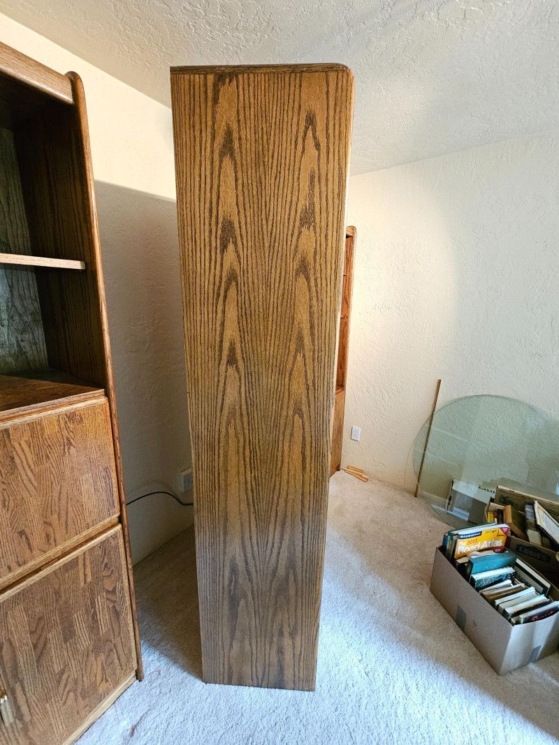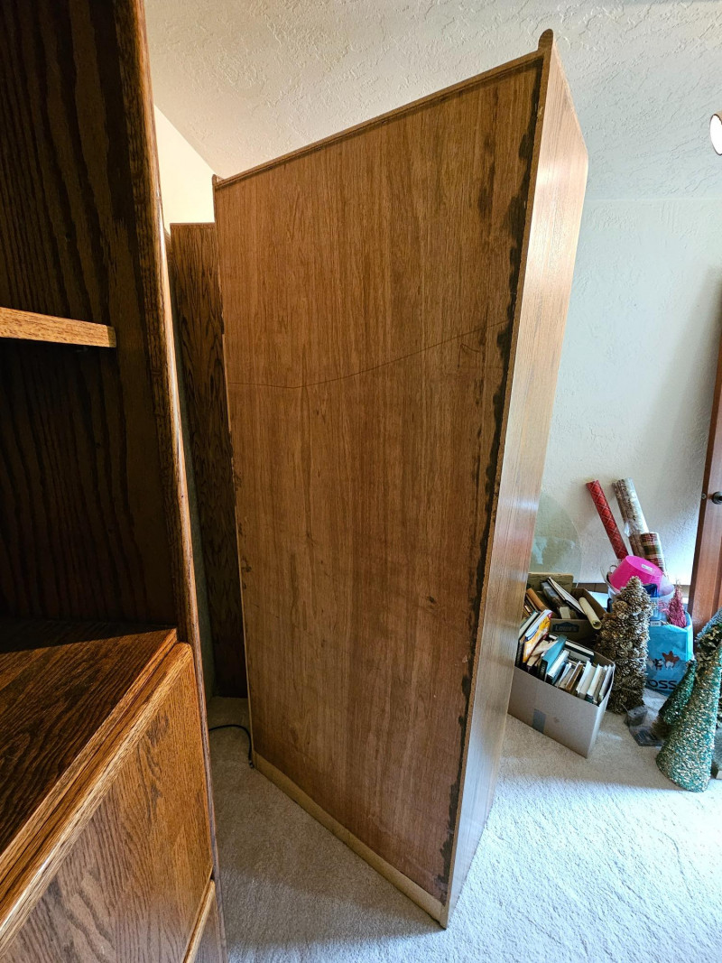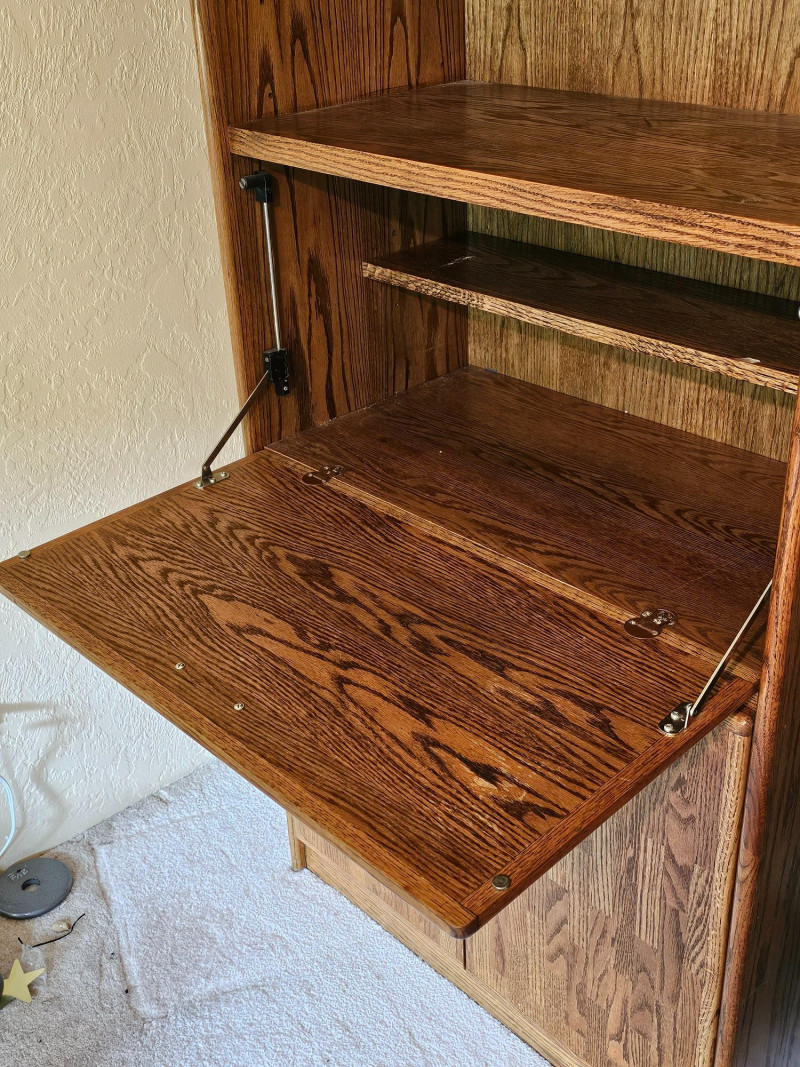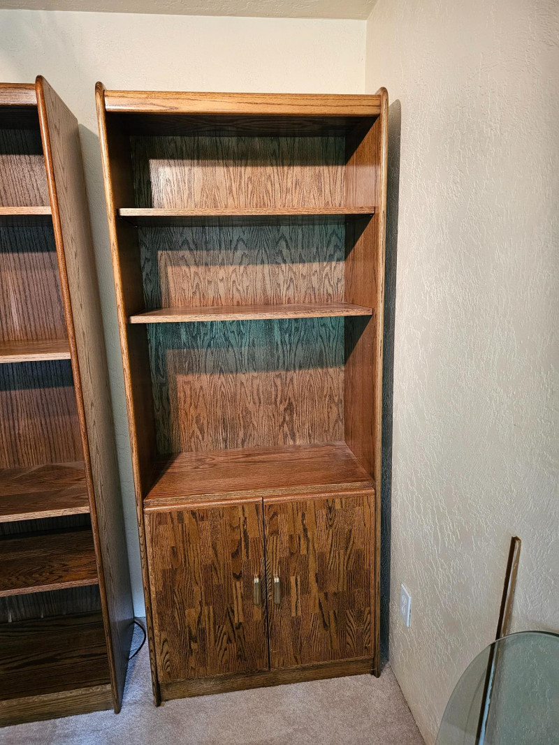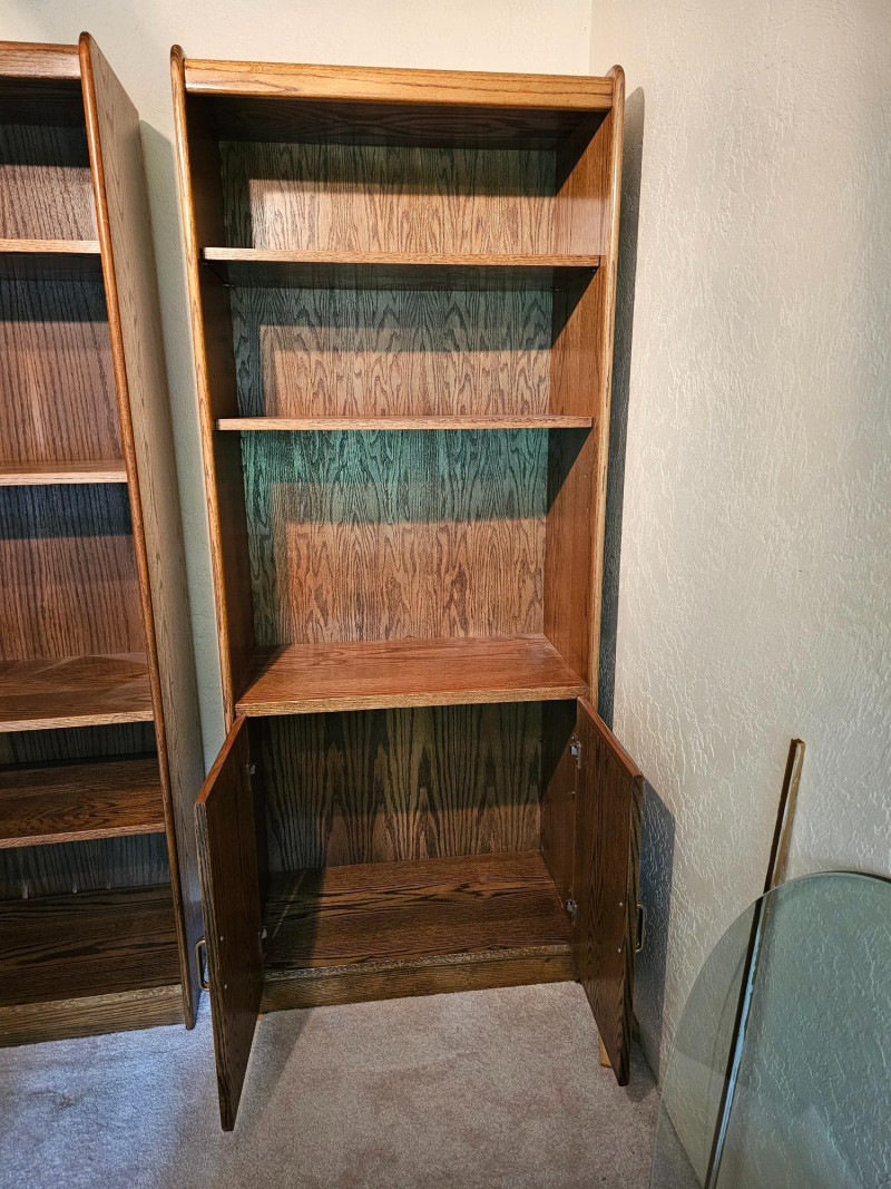 (3) Matching Dark Oak Finish Bookcase, Cabinet & Desk Units Bookcase unit has 1 fixed and 5 adjustable shelves Desk unit has pull-down desk with shelf, one adjustable shelf in upper, and 2-door cabinet on the bottom Pull-down desk is 15"T x 30"W x 32"D Bookcase & cabinet unit has 2 adjustable shelves above and a 2-door cabinet on the bottom Both lower cabinets are 24"T x 31"W x 16"D 76.5"T x 31.5"W x 17"D All are in good condition!