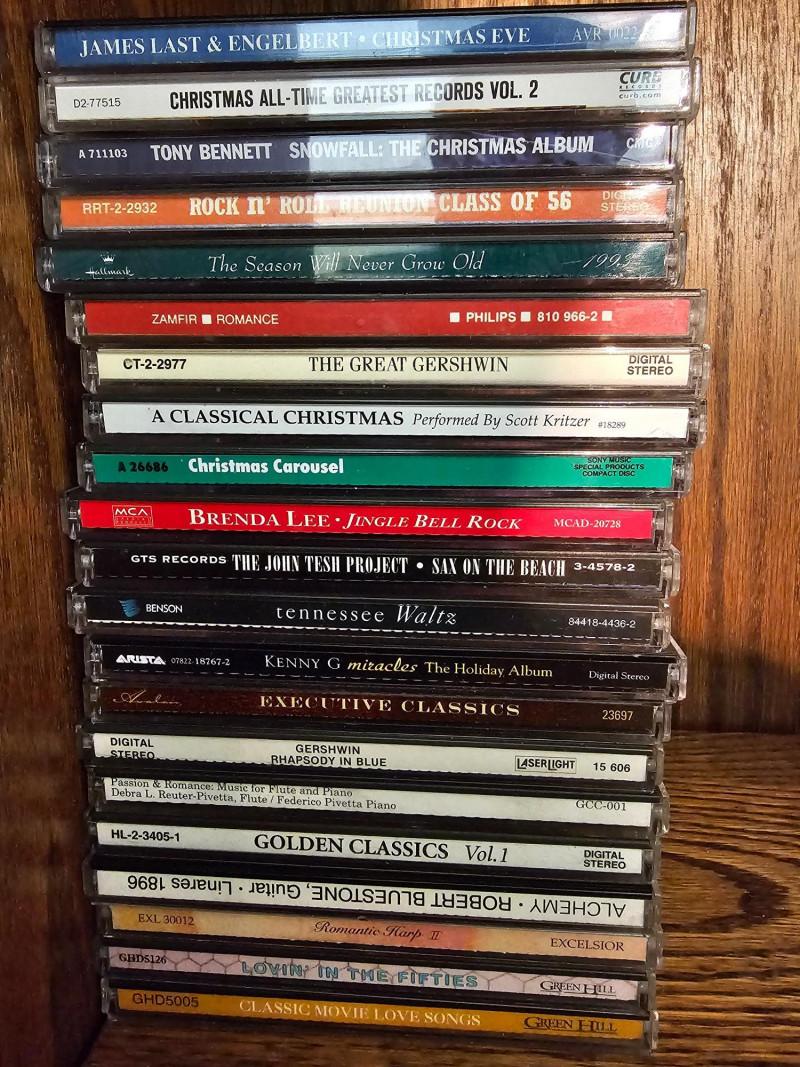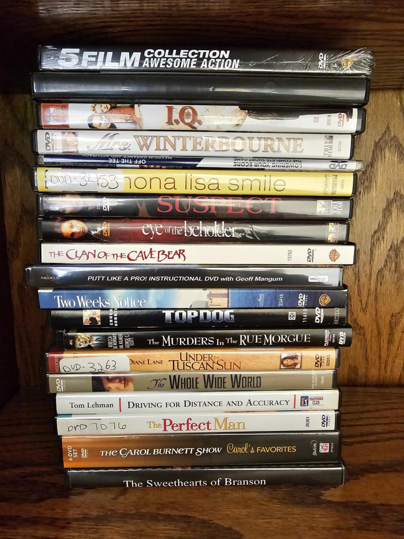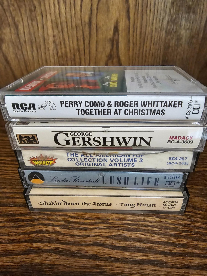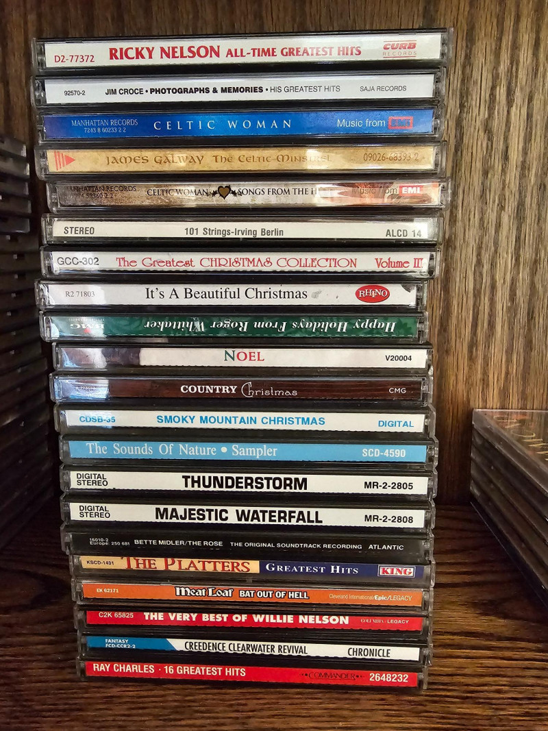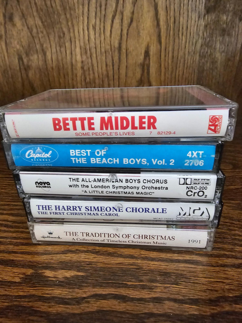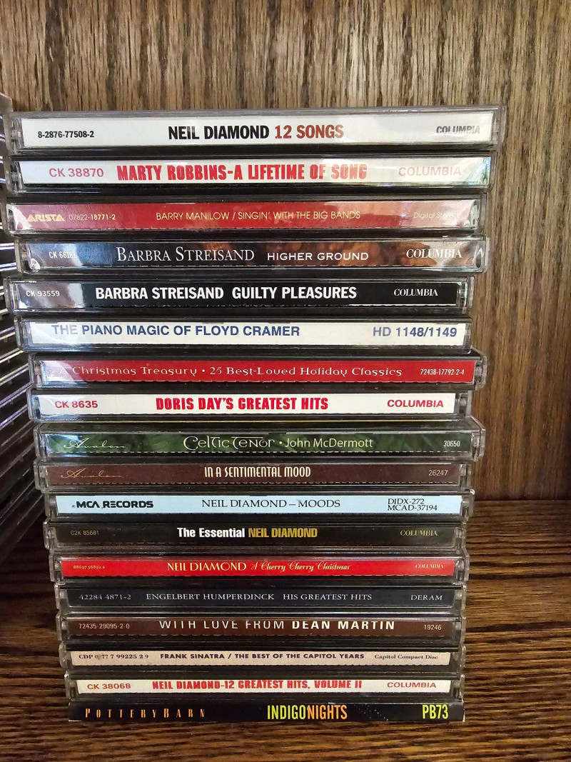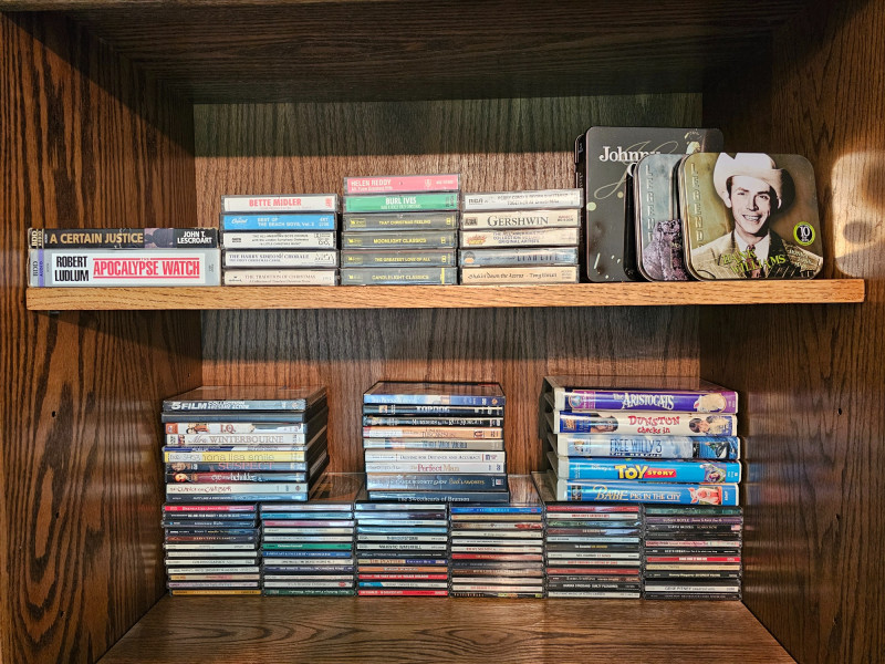 Complete Media Collection - Cassettes, CDs, VHS, DVDs 77 CDs: Neil Diamond, Barbra Streisand, Kenny Rogers, Garth Brooks, Christmas Music, Bette Midler, 50s Music, Dean Martin, CCR, Meat Loaf, Willie Nelson, Johnny Cash and much more! 20 DVDs: Two Weeks Notice, Tango & Cash, Clan Of The Cave Bear, Mina Lisa Smile, The Carol Burnett Show, The Perfect Man, Under Siege, The Last Boyscout, Suspect and more! 5 VHS: Toy Story, Free Willy 3, Babe Pig In The City, The Aristocrats, & Dunston Checks In 2 Audiobooks: The Apocalypse Watch & A Certain Justice 41 Cassettes: Bette Midler, Beach Boys, George Gershwin, Burl Ives, Helen Reddy, Debby Boone, John Denver, Anne Murray and much more Some of the cassettes are loose or in blank cases