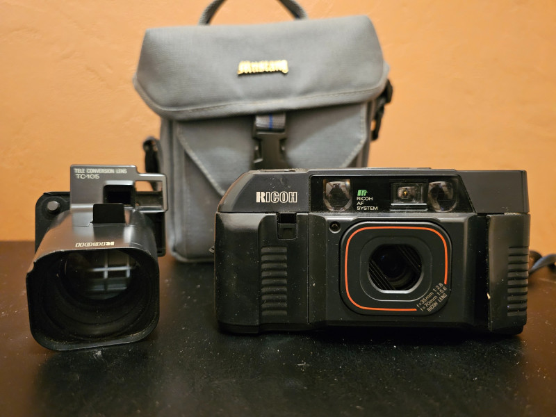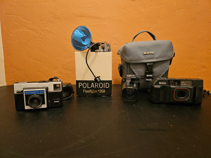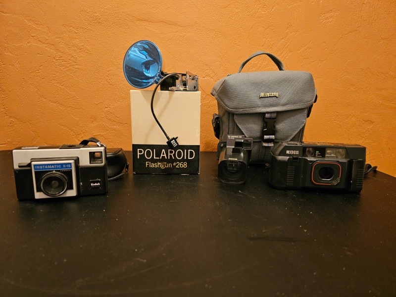 Vintage Cameras, Cases & Poloroid Flashgun 1970s Kodak Instamatic X-15 1980s Ricoh TF-500 Automatic with Tele Conversion Lens TC-105 1970s Poloroid Flashgun #268 (in original box) (2) Camera cases