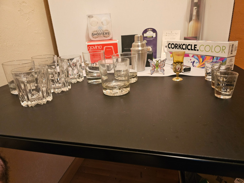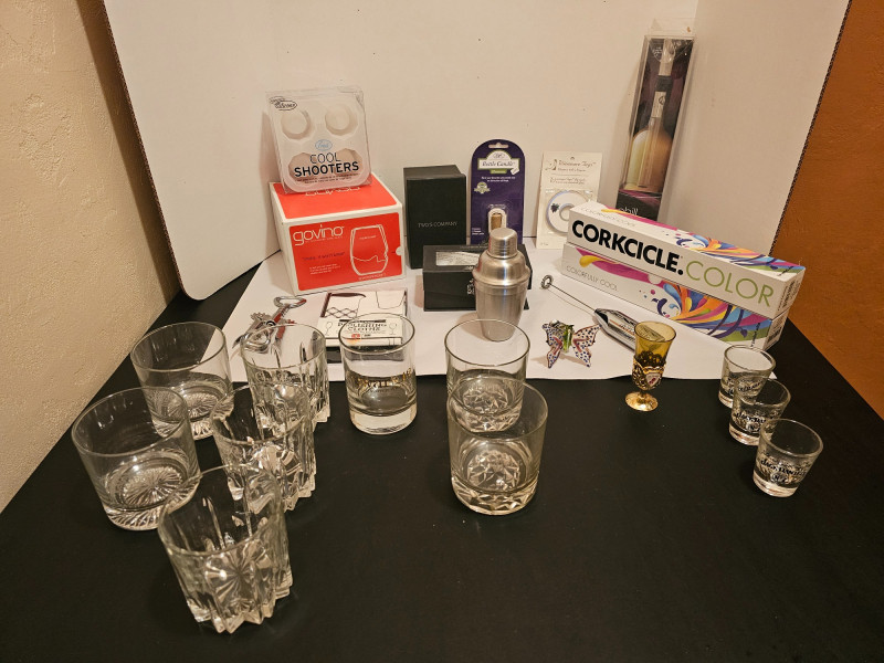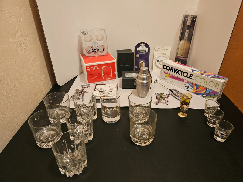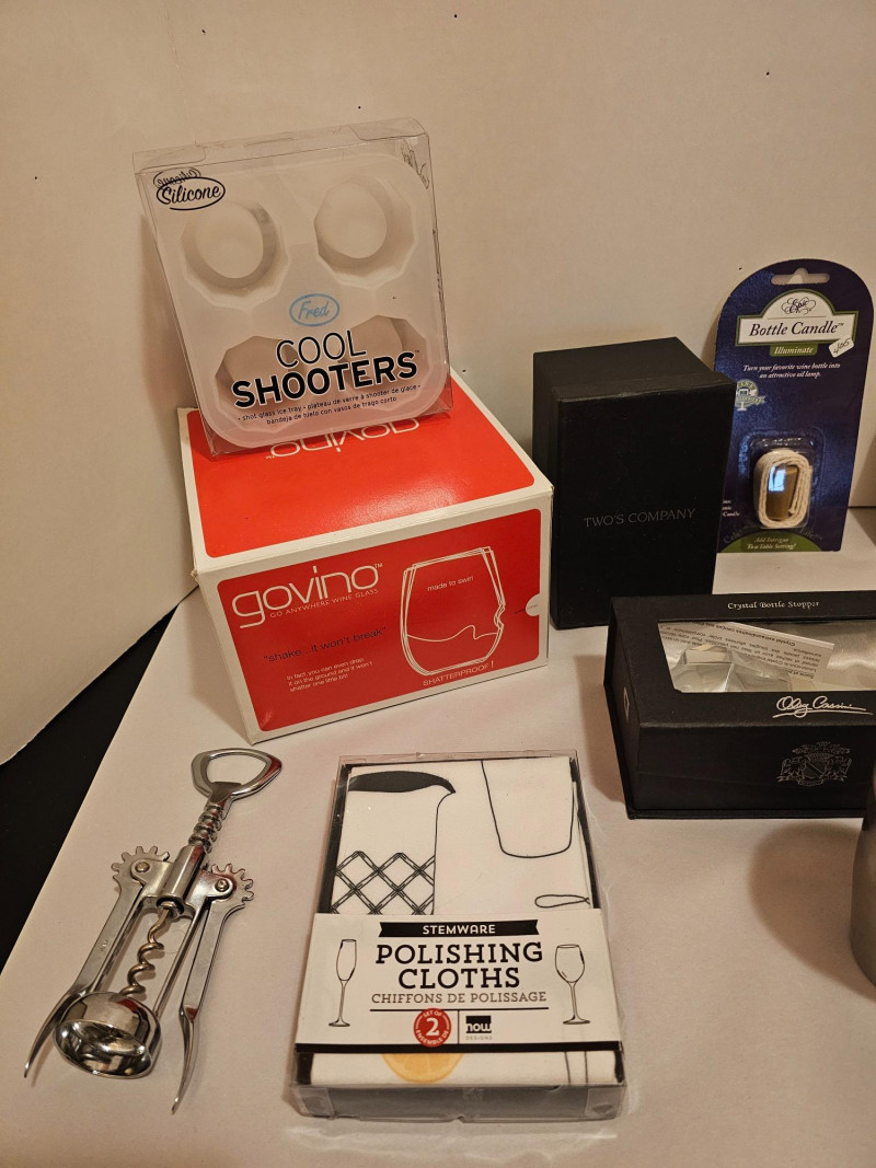 Bar Ware Lot! (4) Shatterproof GoVino Wine Glasses (2) Corkcicle Color (1) Cool Shooters Shot Glass Ice Mold Wine stoppers, corner, cloth, glasses from Chivas, Crown Royal Dewar's 12, Jack Daniels & more! (4) glass wine stoppers All of the useful little things needed to throw a party!