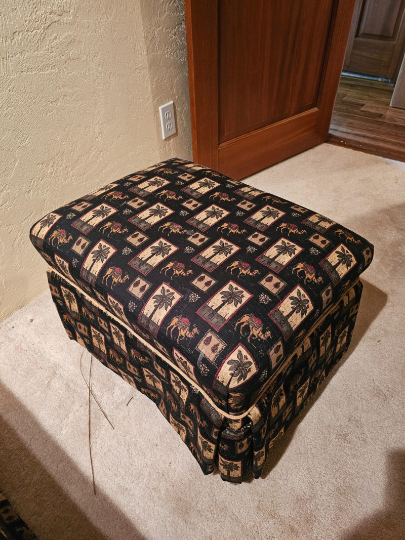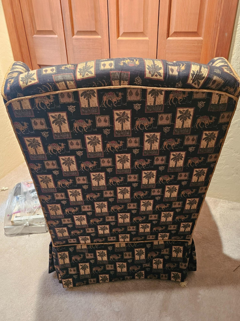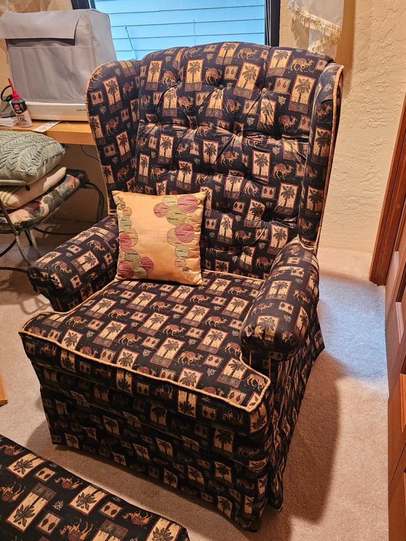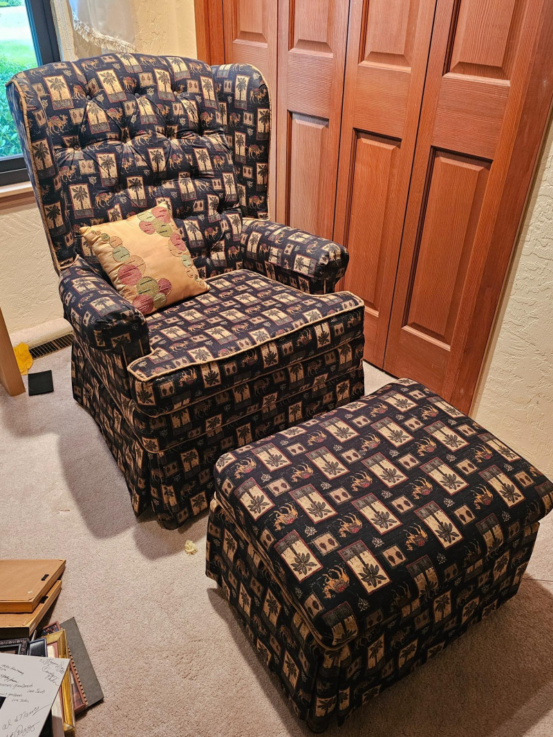 Palm Tree & Camel Upholstered Button-Tufted Chair & Ottoman Nice used condition chair is comfortable and includes a matching ottoman to put your feet up and relax Chair is 39"T x 31"W x 30"D Ottoman is 16"T x 24"W x 19"D Includes armrest covers & gold accent pillow Additional fabric for this set is availabe in this auction.