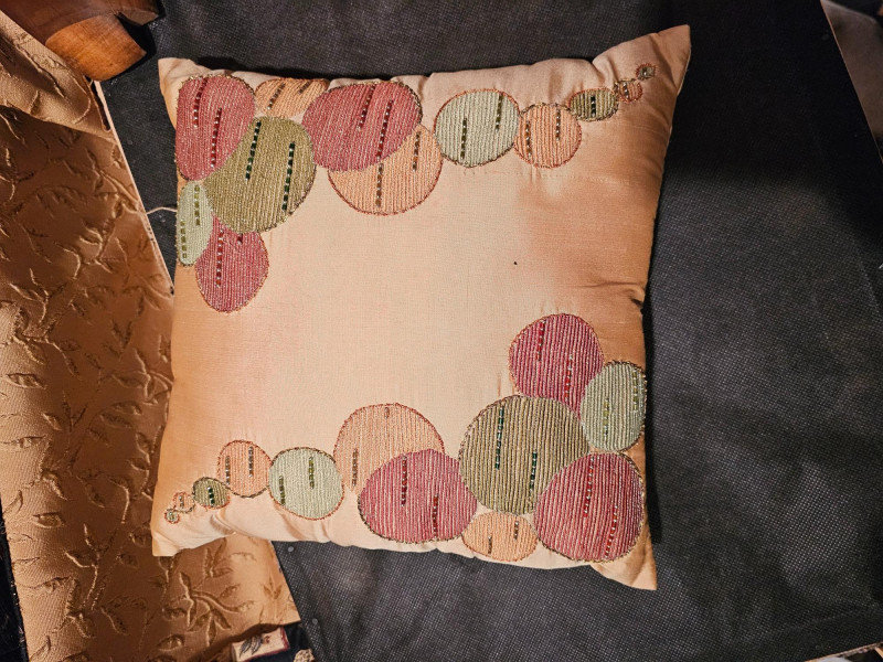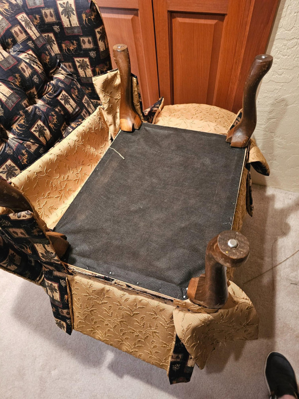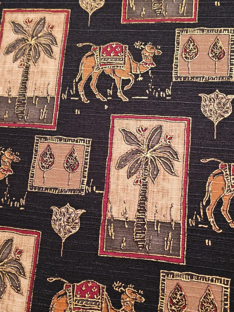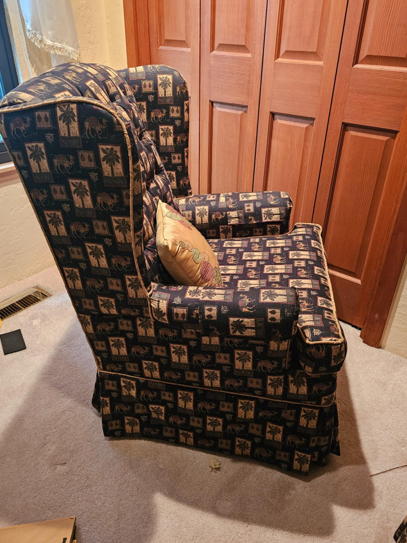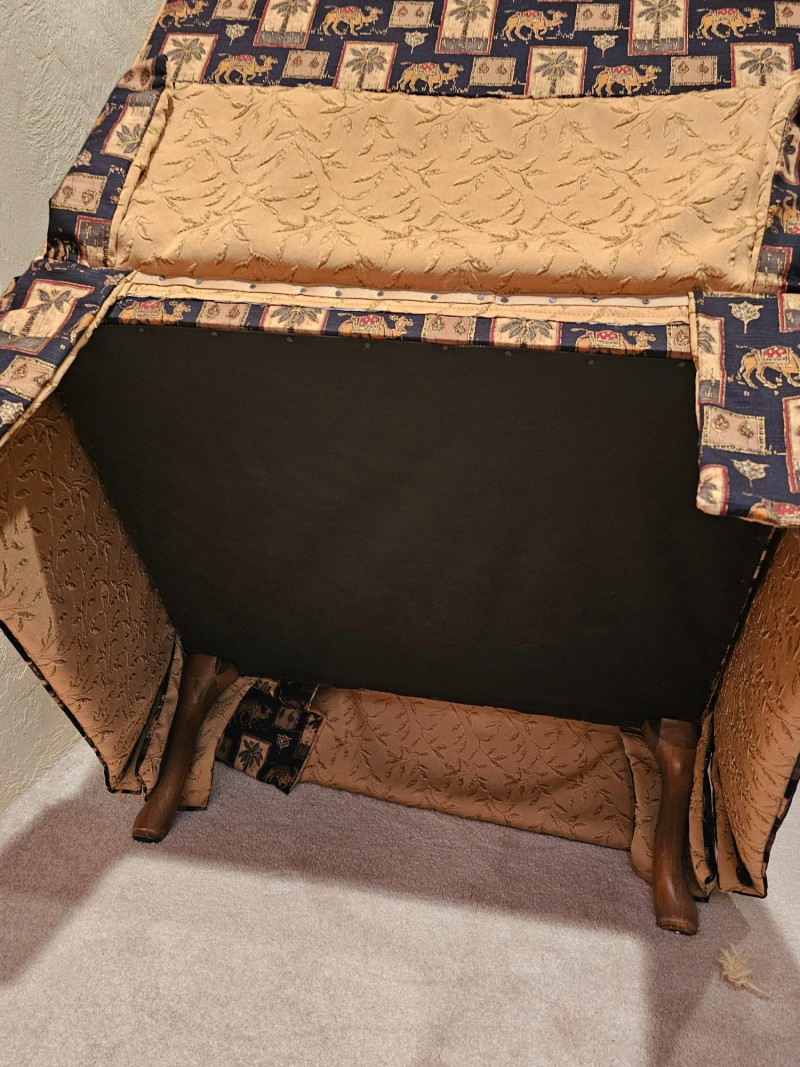 Palm Tree & Camel Upholstered Button-Tufted Chair & Ottoman Nice used condition chair is comfortable and includes a matching ottoman to put your feet up and relax Chair is 39"T x 31"W x 30"D Ottoman is 16"T x 24"W x 19"D Includes armrest covers & gold accent pillow Additional fabric for this set is availabe in this auction.