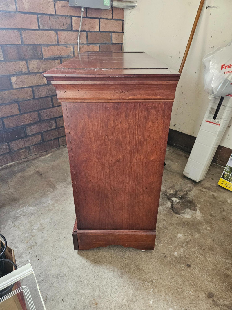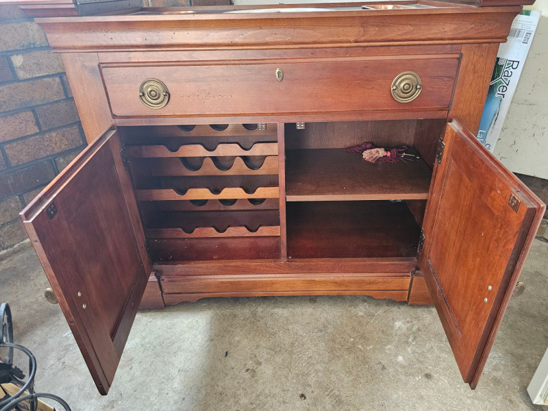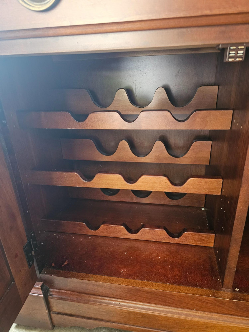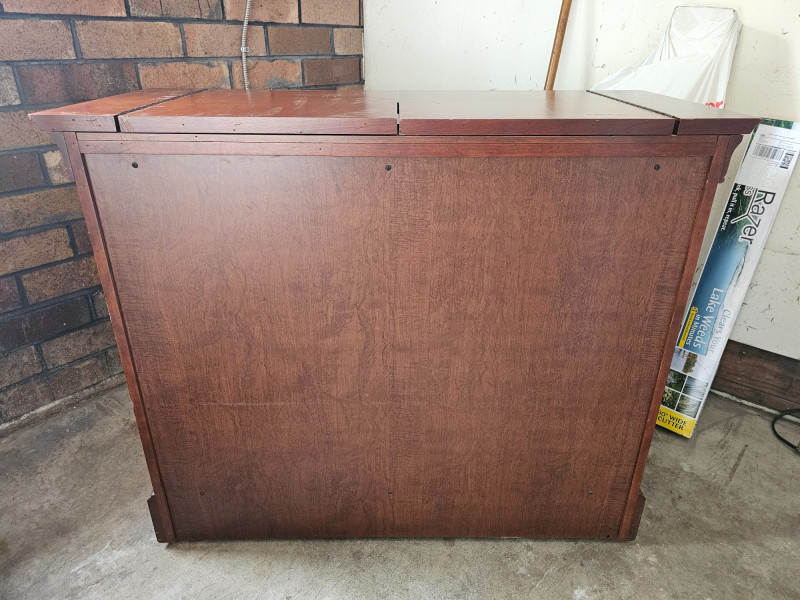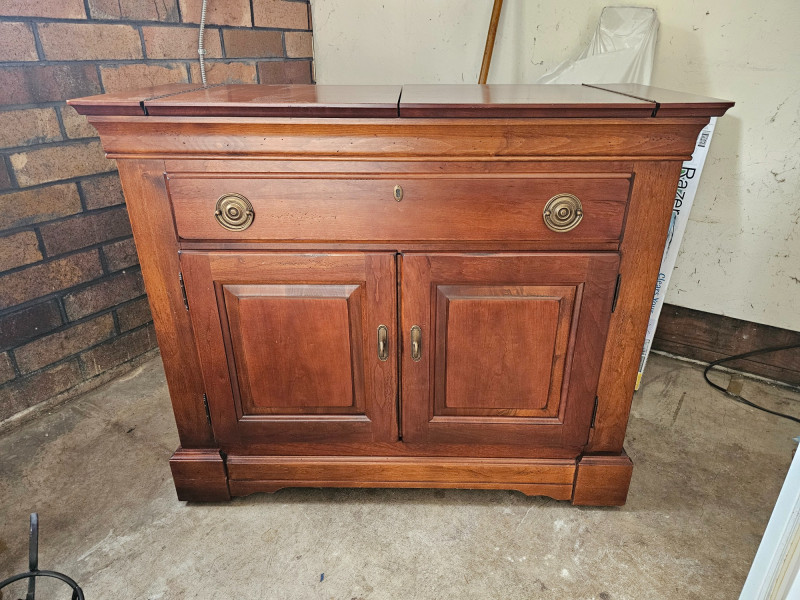 Mid-Century Modern Style Mahogany Flip Top Dry Bar Cabinet On Wheels Beautiful piece of furniture turns into a dry bar or server by lifting the top panels to access three compartments and large ice bucket 36.5"T x 44"W x 18"D Once opened up to bar or server, top is 67.5"W Could use a wipe down, but in good used condition!