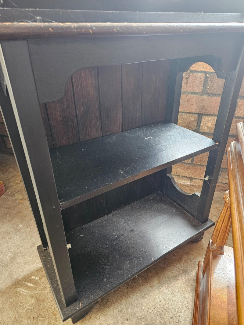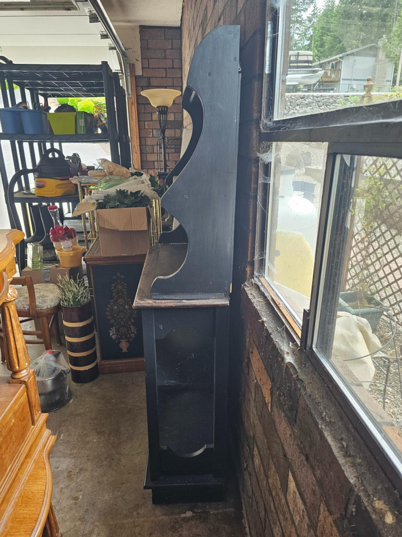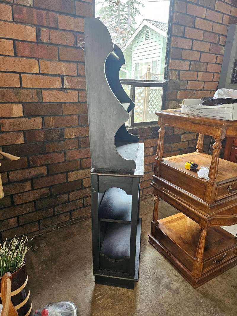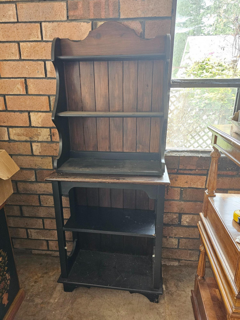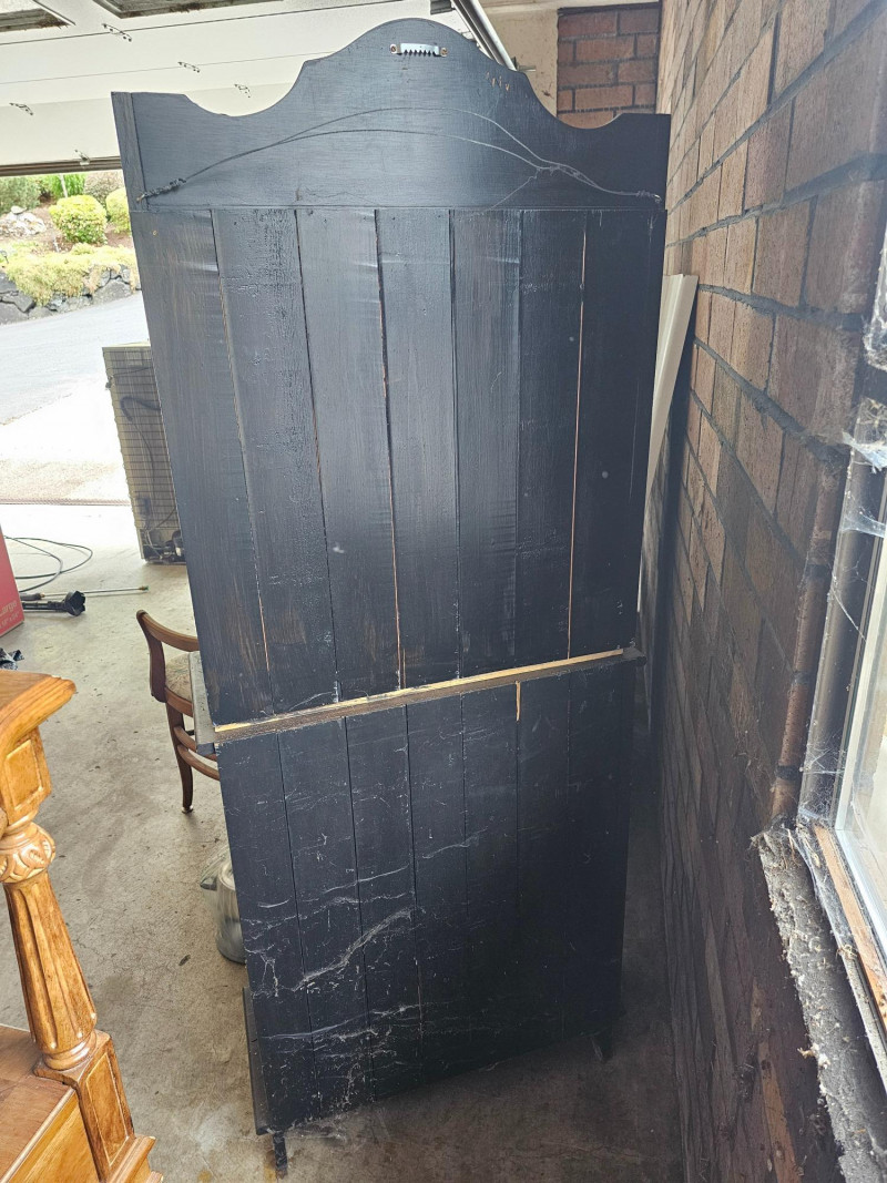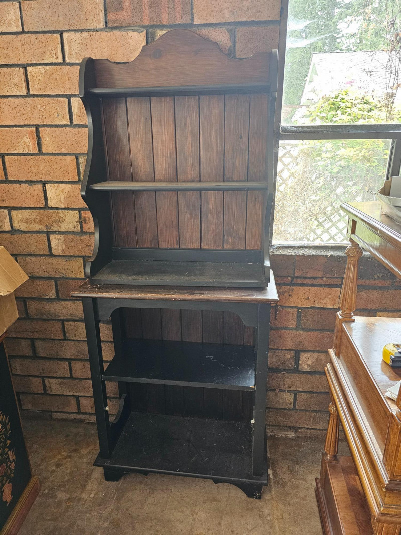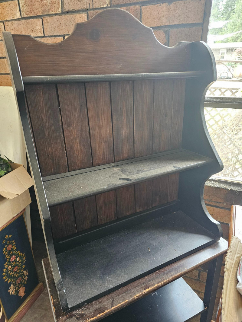 Farmhouse-Style Open Hutch Or Baker's Cabinet The top half can be wall mounted and has a plate rail on the upper 2 shelves to display your fancy dishes Bottom half appears to be a repurposed cabinet that once had lower doors Or, as pictured here stach them for a rustic farmhouse hutch Both pieces are dark stained wood Top half: 33"T x 25.5"W x10.5"D Bottom half: 34"T x 27.5"W x 12"D Plenty of character in this piece!