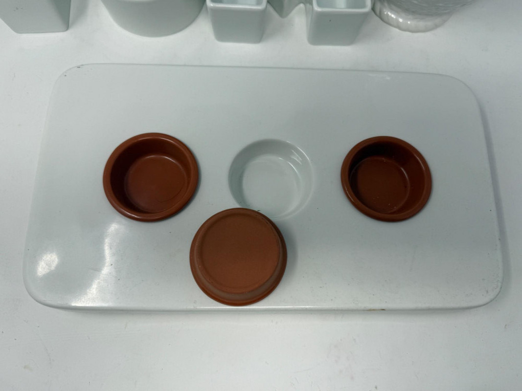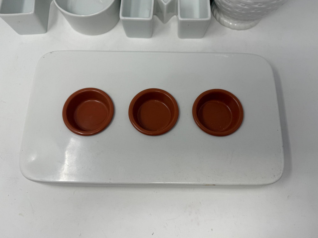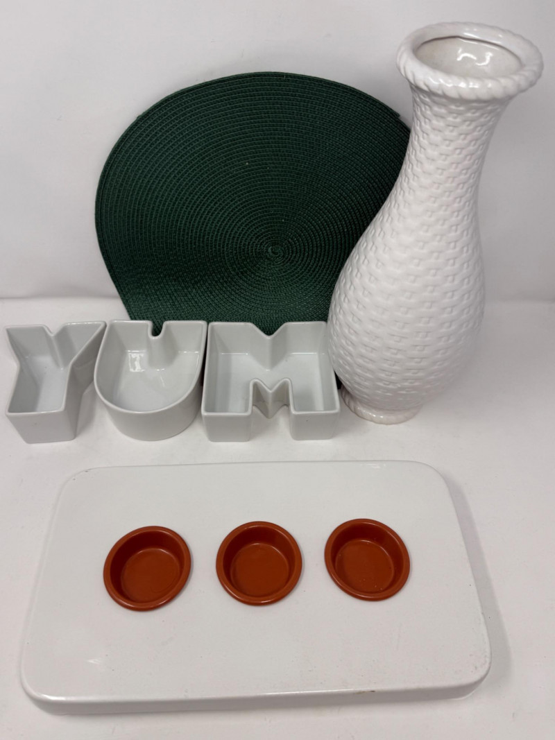 Ceramic Pier One Vase with woven texture5.5“ x 14“ Michael Graves Chilling Dish with removable ramekins 13.5“ x 7.5“ YUM candy and nut dishes 5 inches tall