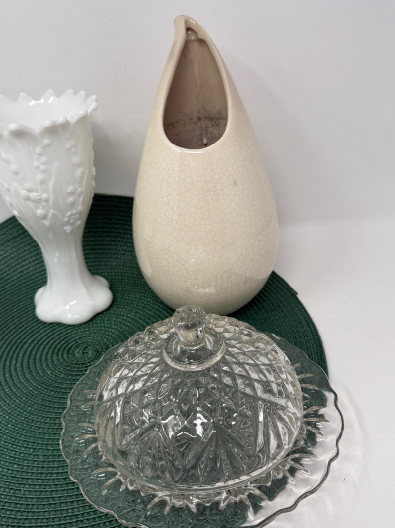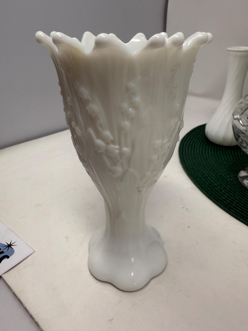 Westmoreland Lily of the Valley milk glass 7x4 Crystal candy dishes Ivory ceramic modern vase 5x9 Hoosier Glass milk glass twisted vase