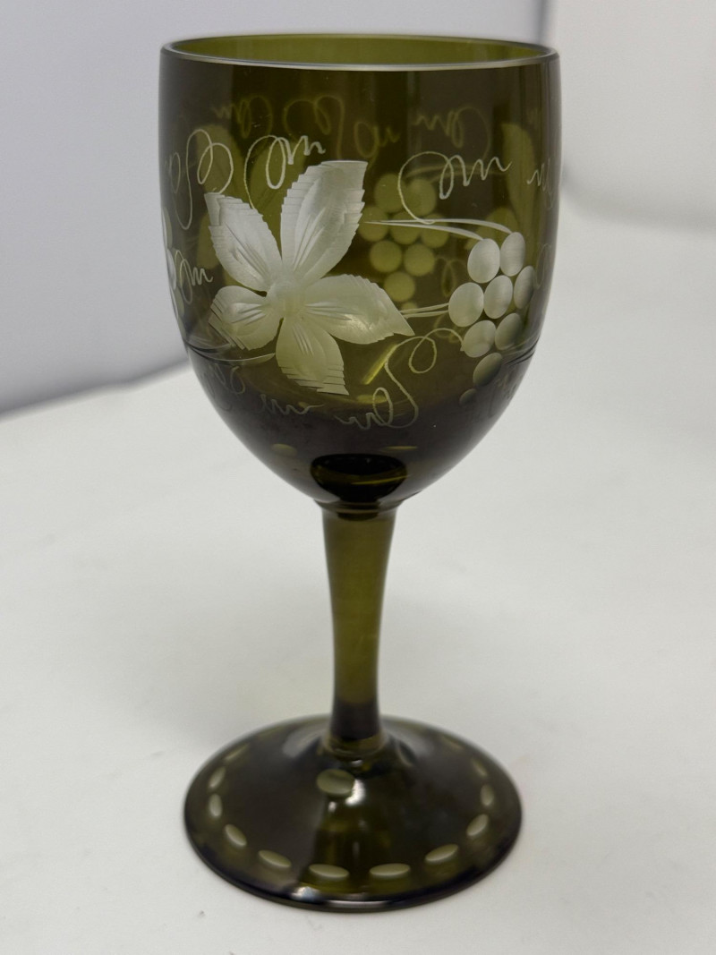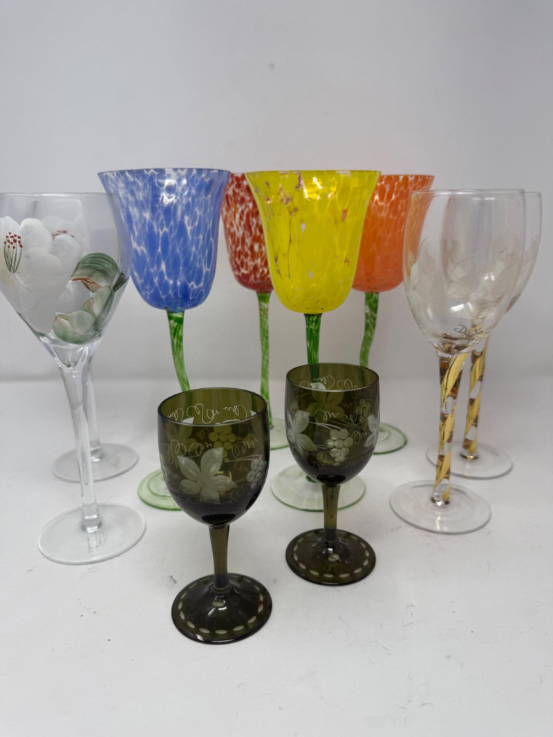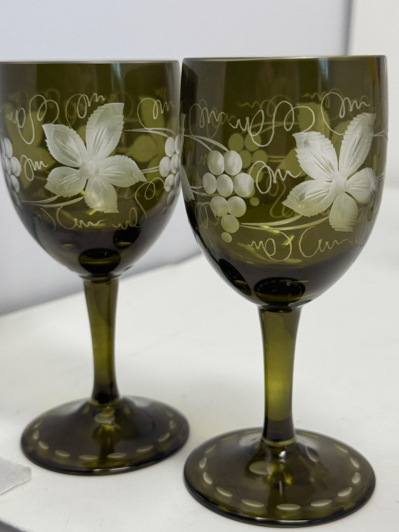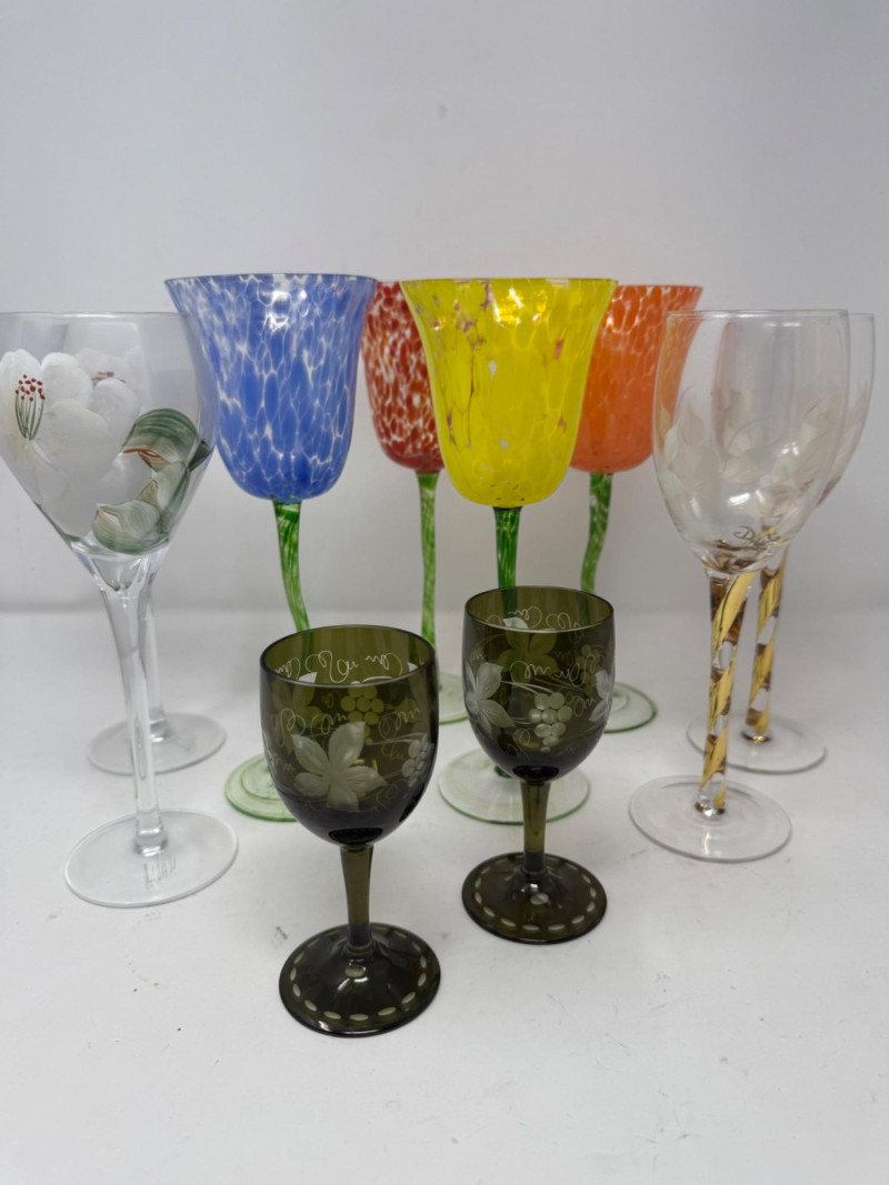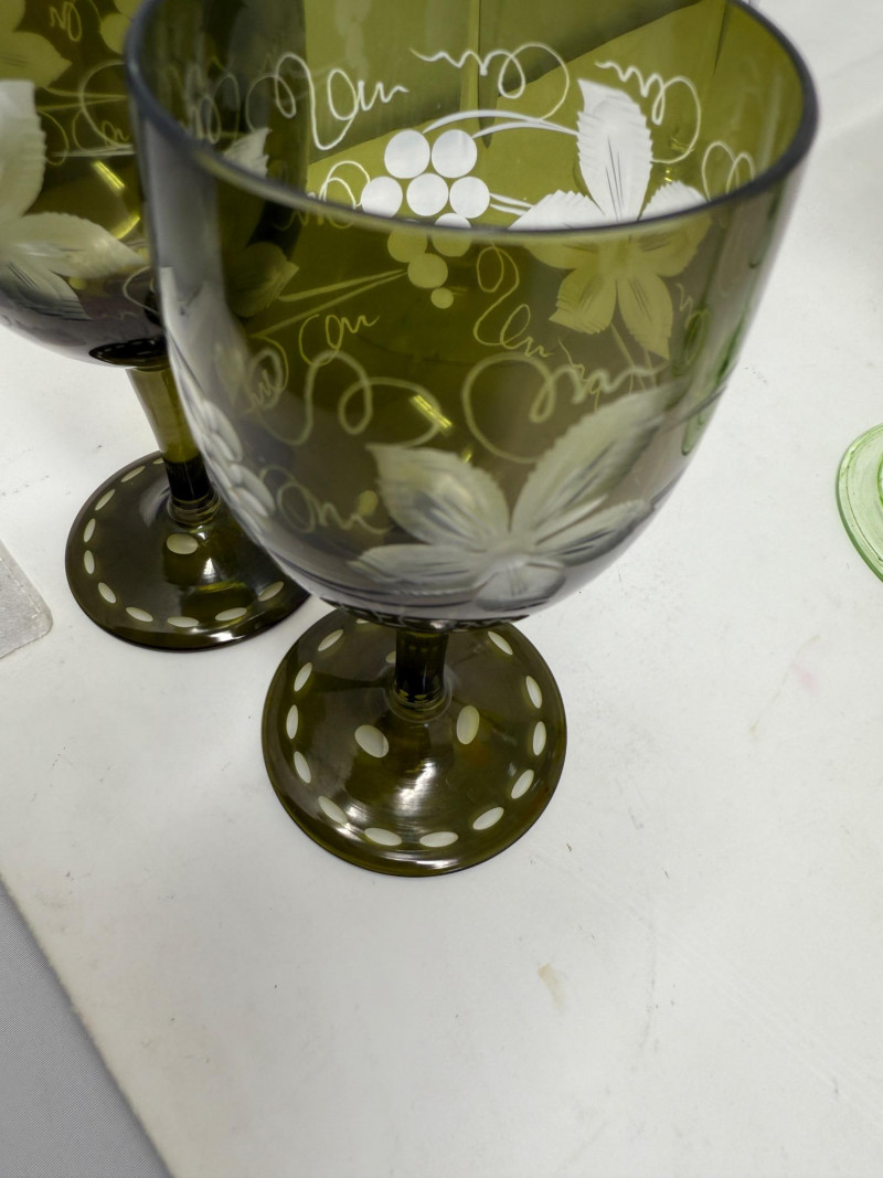 10 pc Fancy Stemware -Blown, Hand Painted & Etched Colored glass tulip stems are 9” Vintage olive green grape leaf and vine small etched stems are 5”