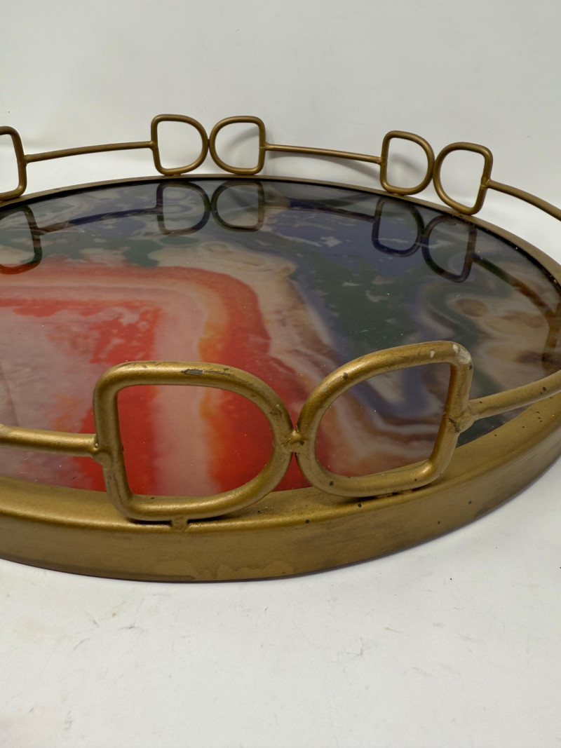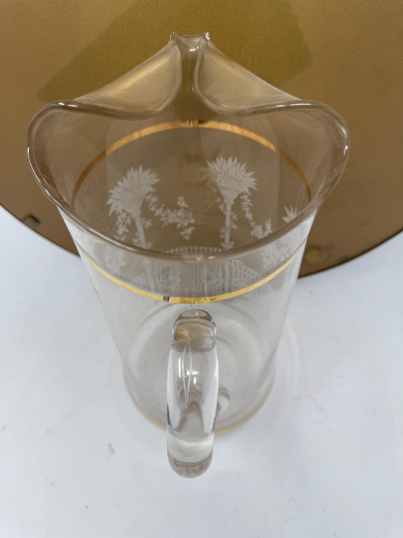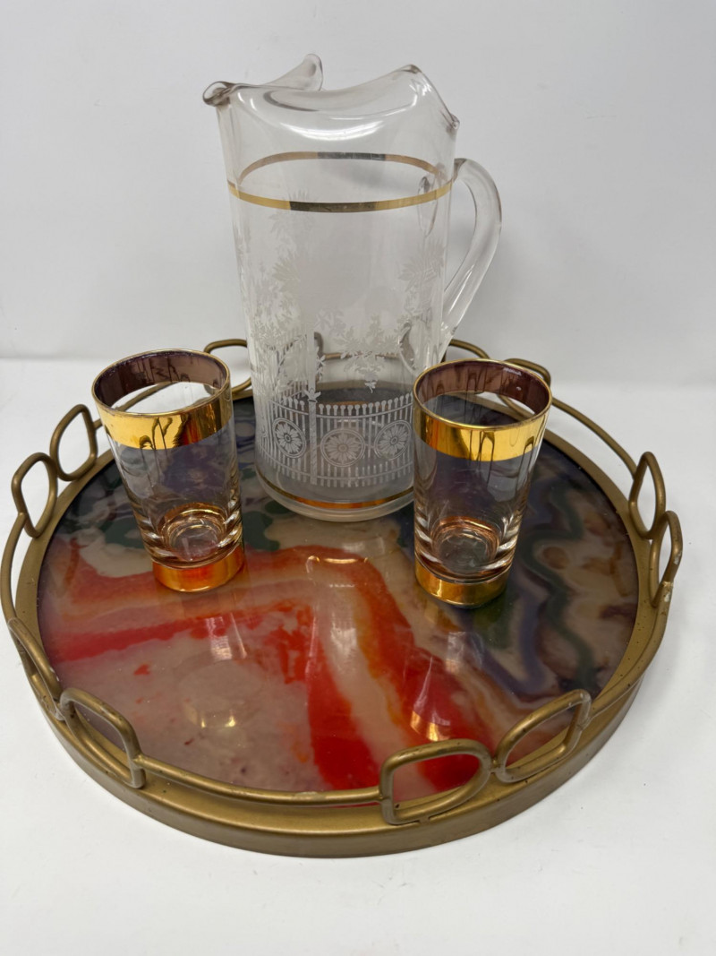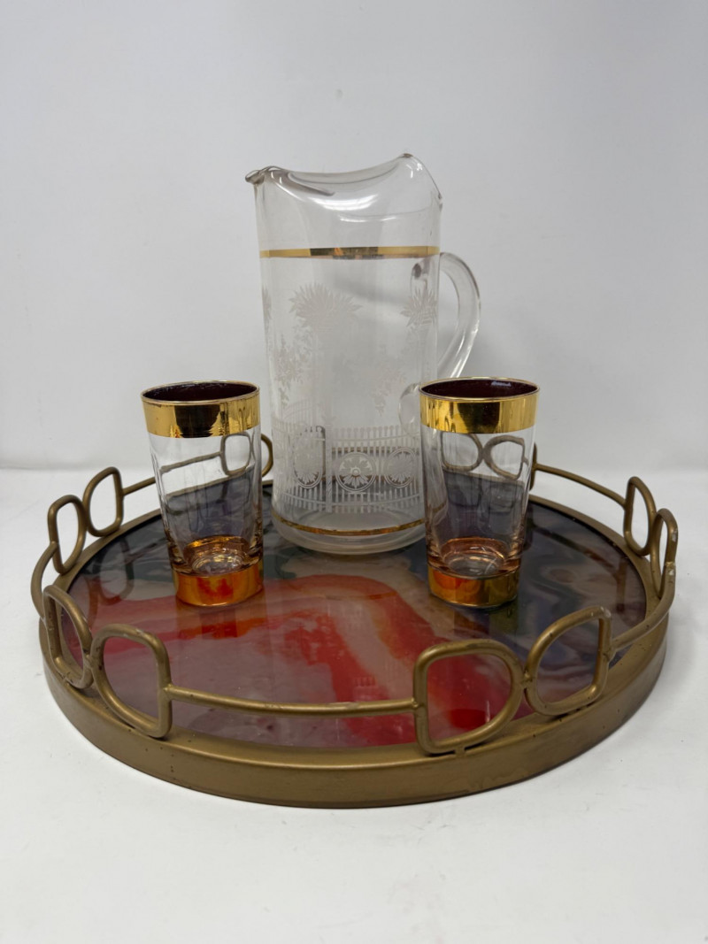Vintage Acrylic Bar Tray Pitcher & Glasses Anchor Hocking Gold Rim Glasses 5.25” Etched glass and gold accent pitcher 10.5” Tray is 16x3 metal frame and acrylic base.