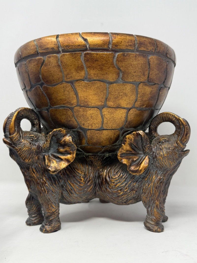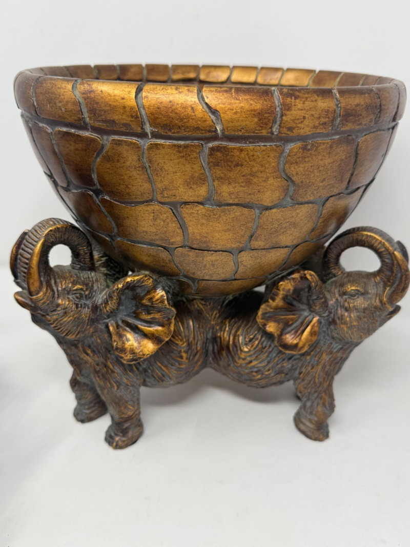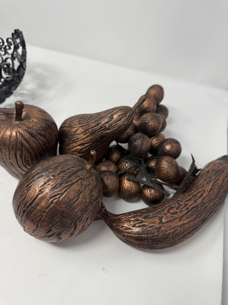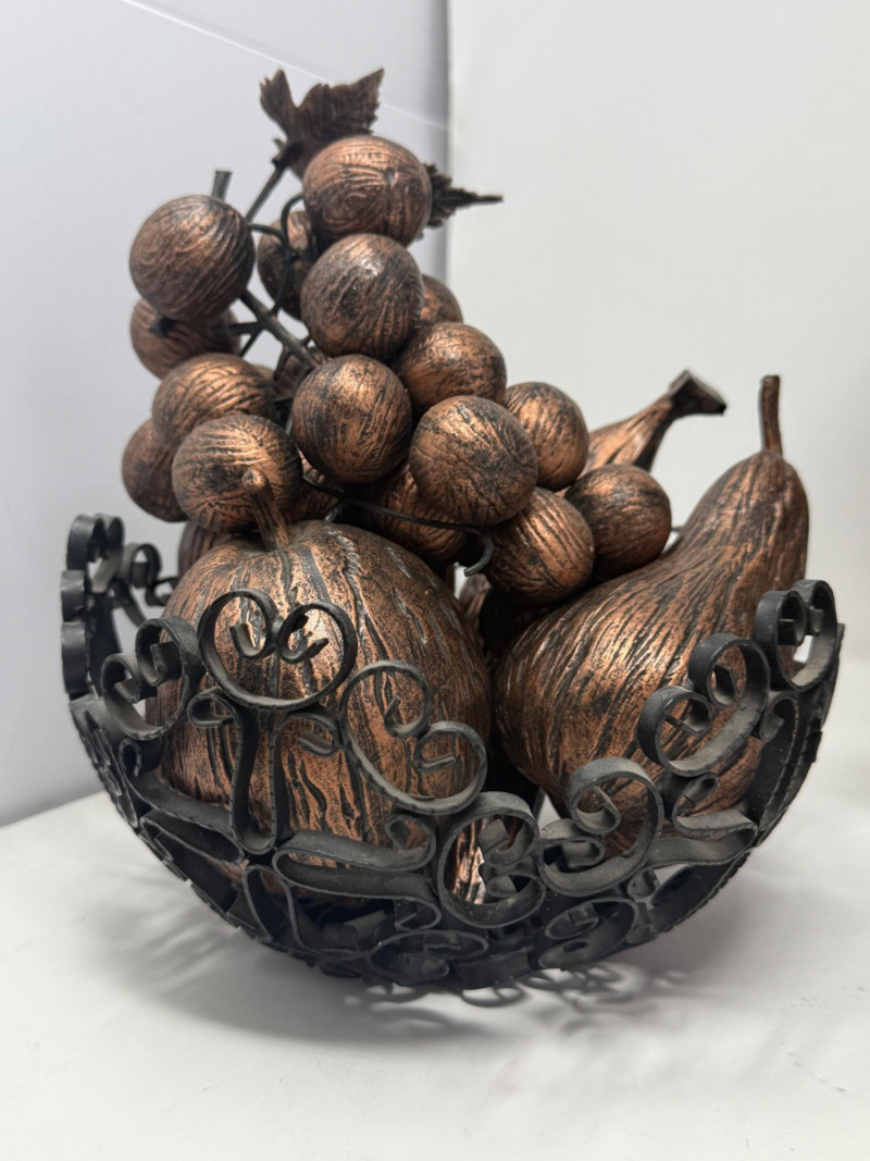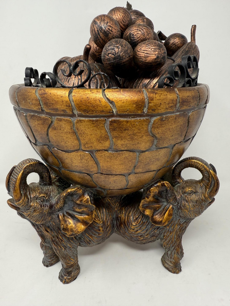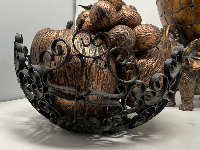 Bronze Pottery Elephant Bowl & Spanish Iron Bowl & Fruit Elephants with bowl is 10.5x9.75” 5 piece Plastic Fruit Spanish iron bowl is 8x4.5”