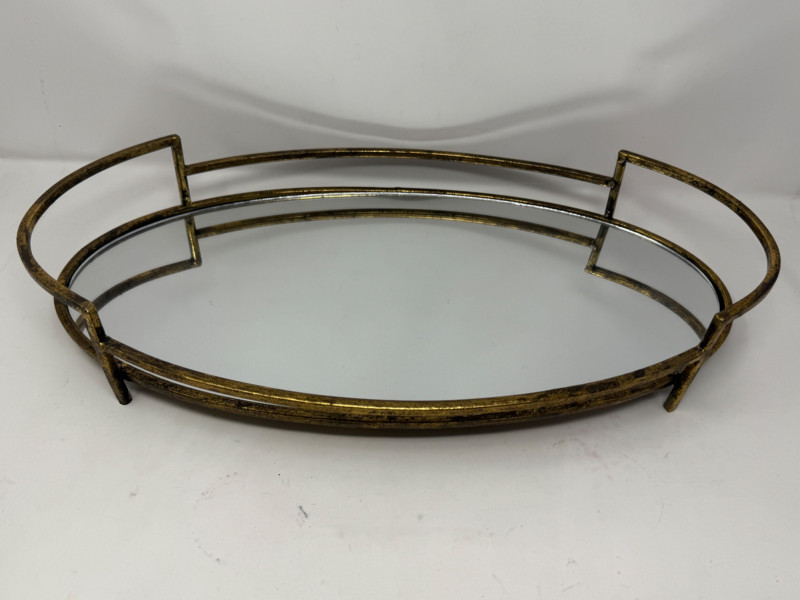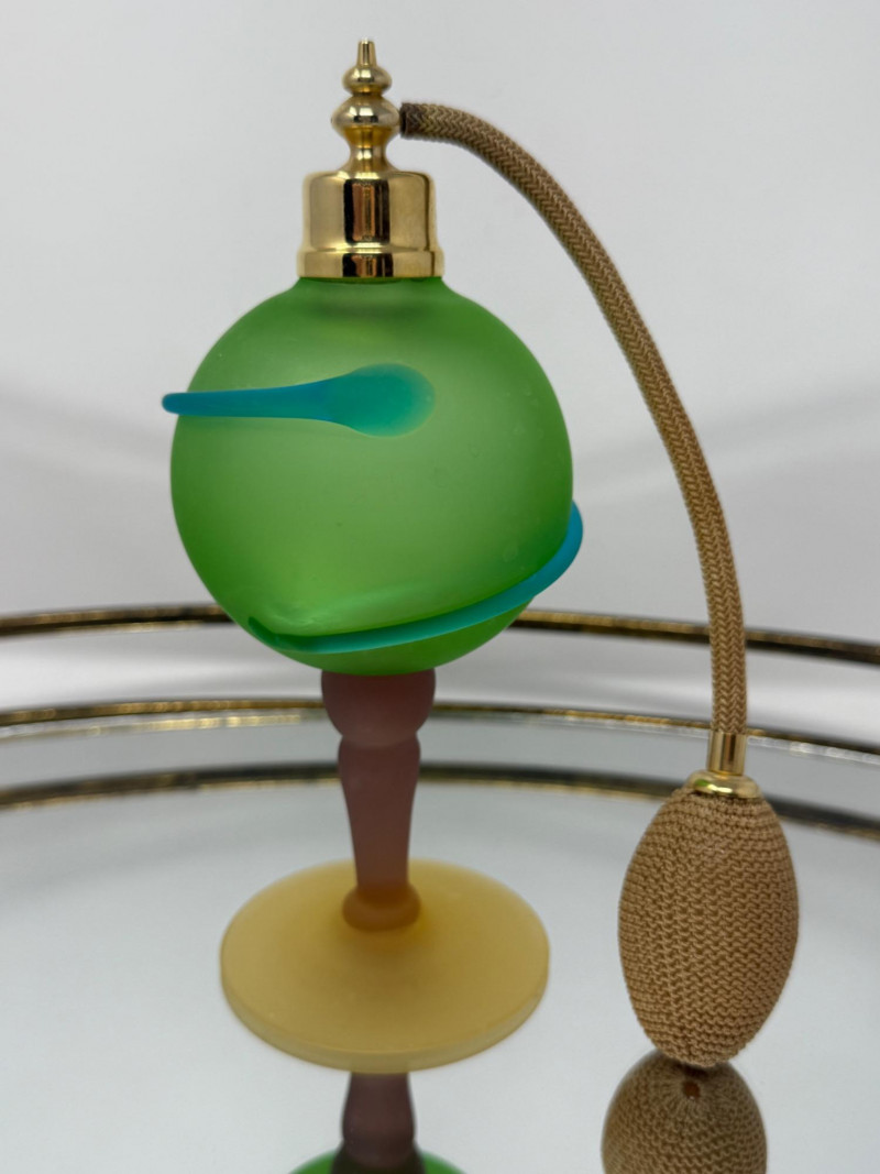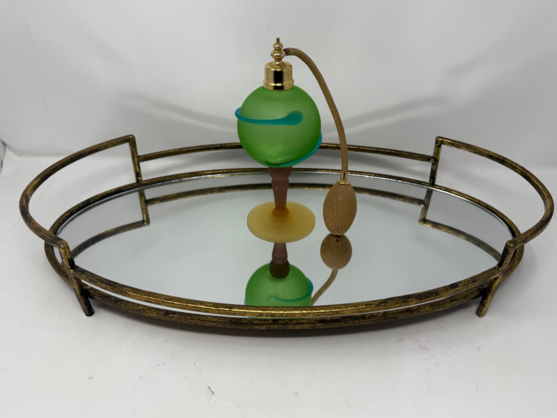 Oval Mirror Tray and Atomizer 19.5x11.5x3.25" mirror tray with metal frame. 7.25x3.25" atomizer with frosted yellow pedestal base, green globe and blue glass wrap and gold tone top.