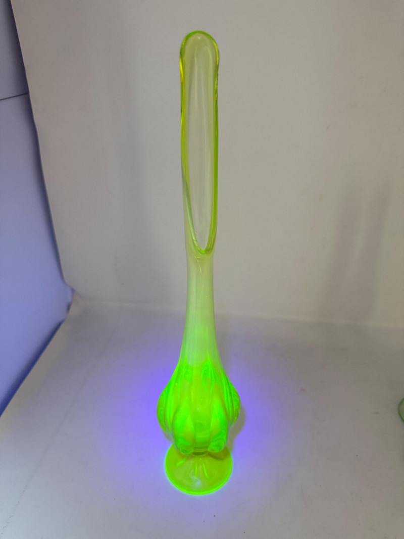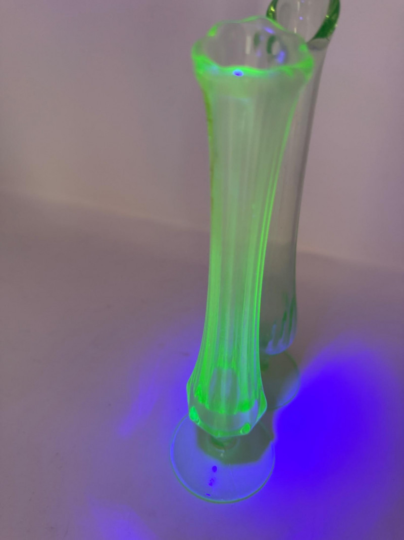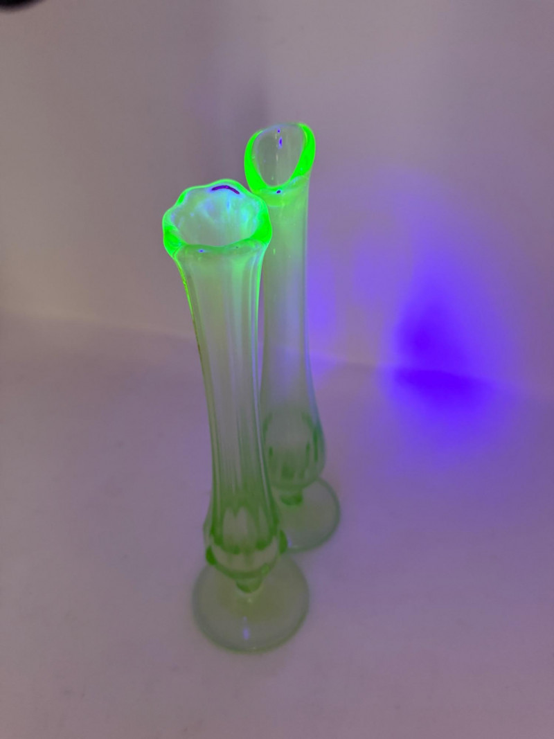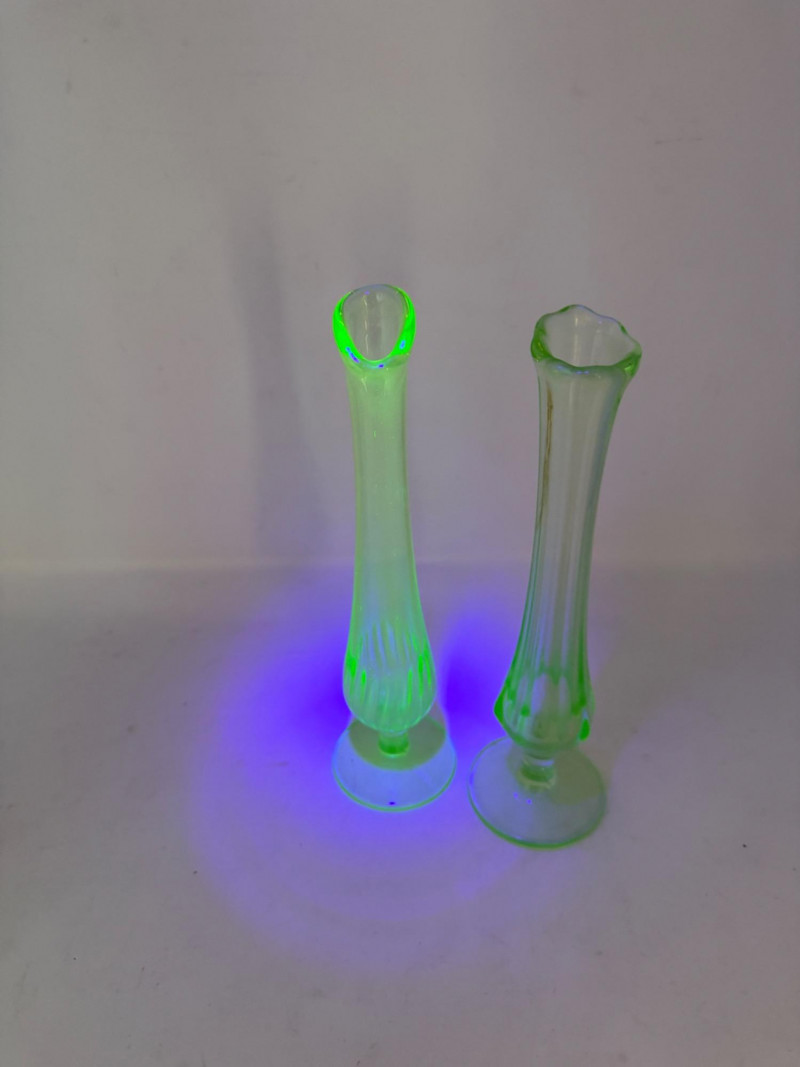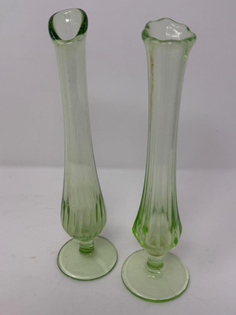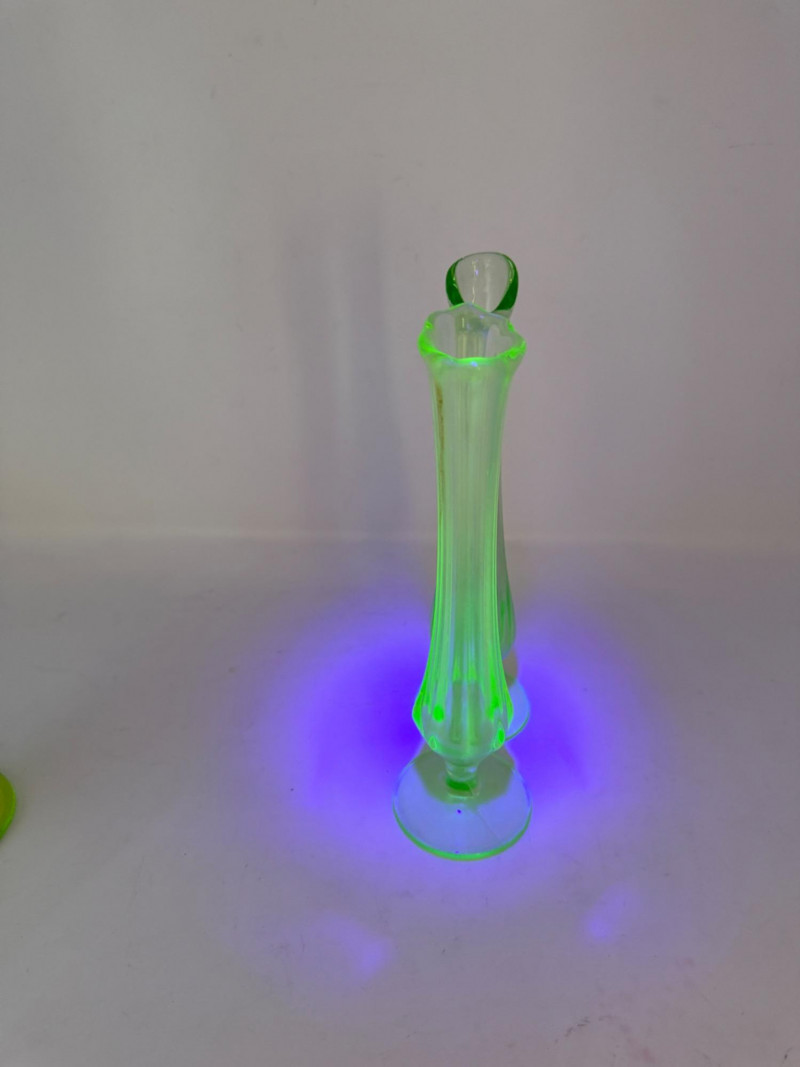 Uranium Vaseline Glass Slung Vases & Hocking Sugar Bowl 8x2.5” Small green uranium glass vases