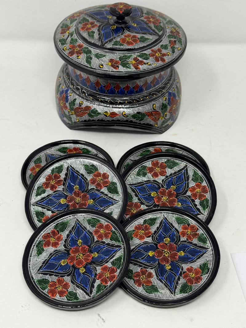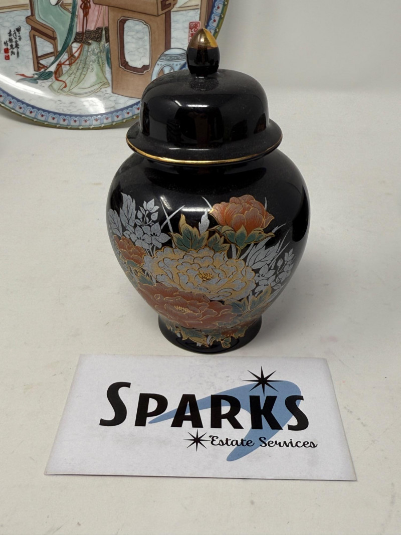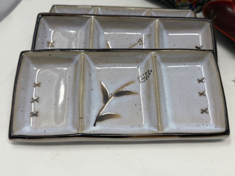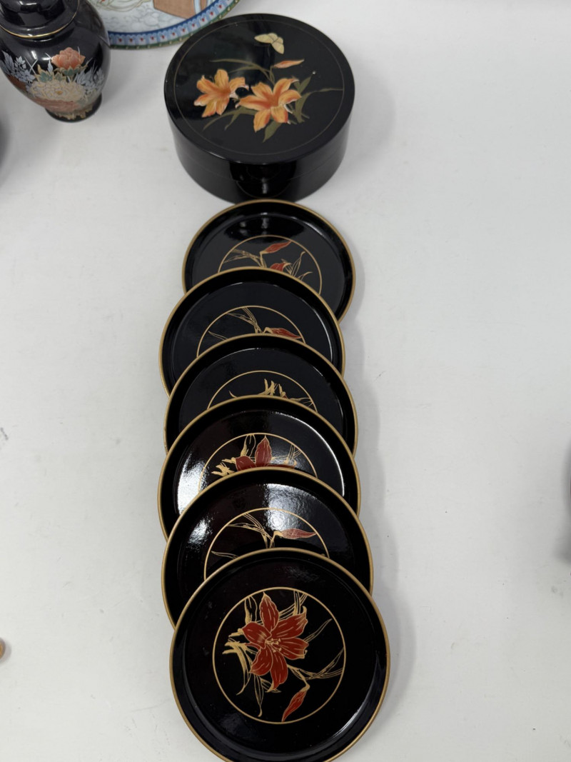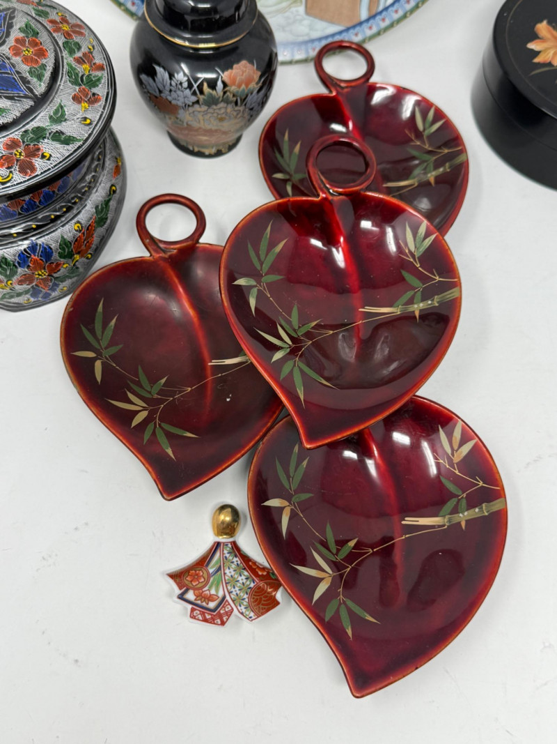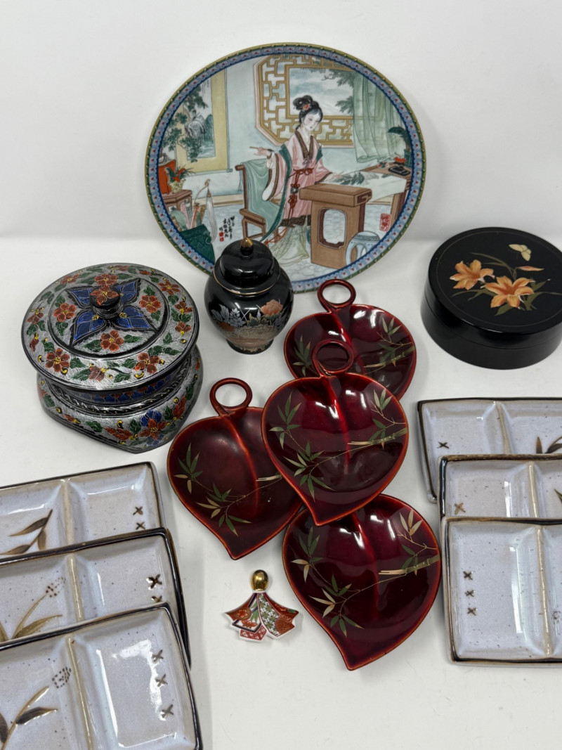 Asian Inspired Collection With Lacquerware (6) 3 Section ceramic dishes 2 Coaster sets Small Ginger jar 1987 “Beauties of the Red Mansion" series by Zhao Huimin Imperial Jingdezhen Porcelain Plate (4) Maruni red lacquerware 2 brass sprays
