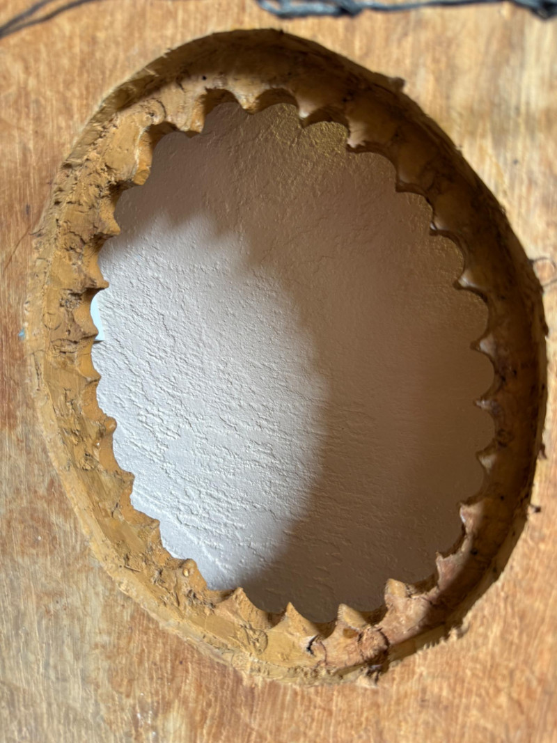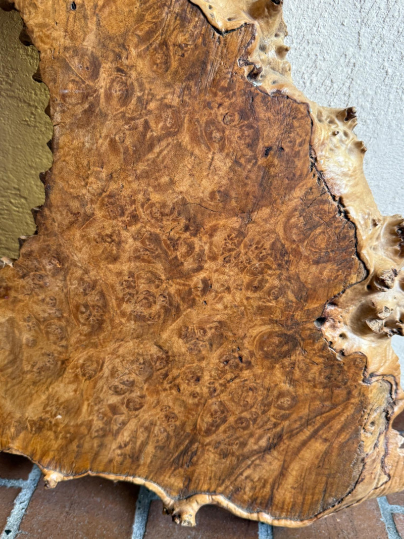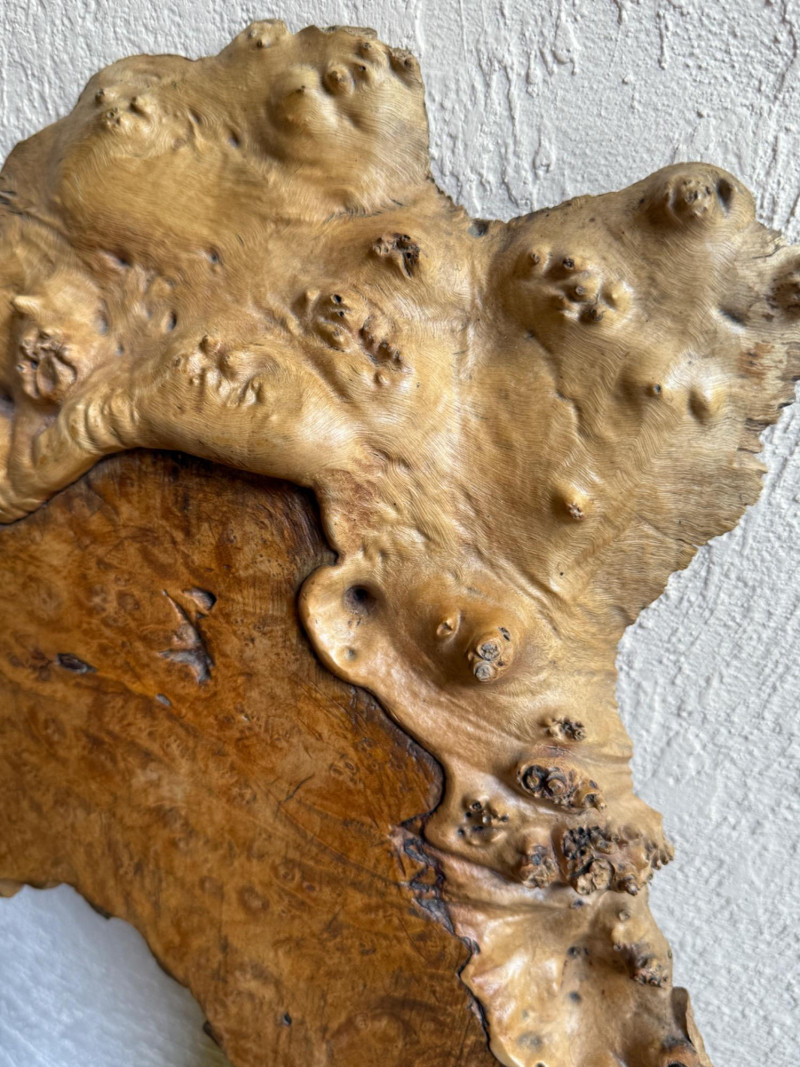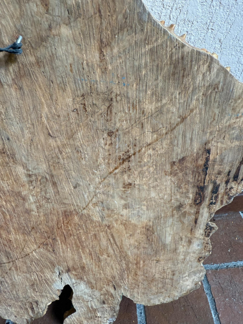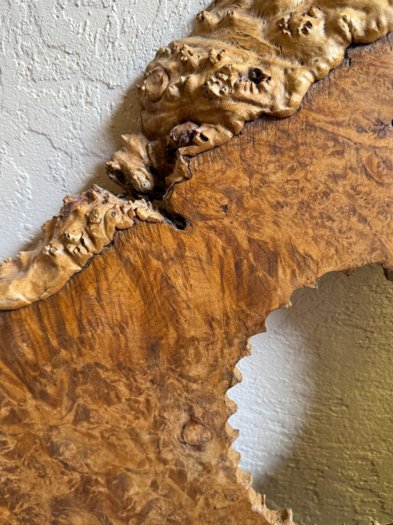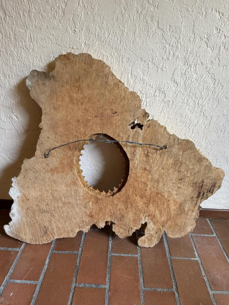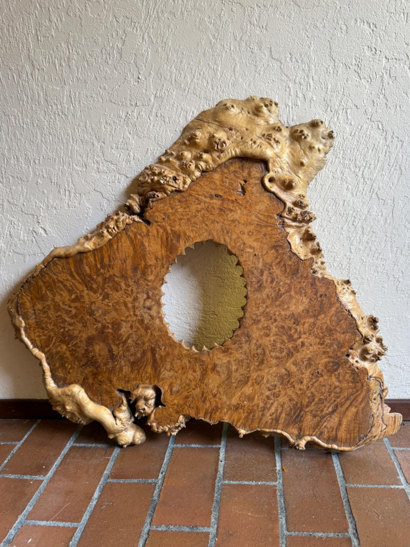 Burl Wood Slab with Cut Out and Hanging Wire Largest points are 30x35” Oval cut out 7x8.5” 1.25” thick