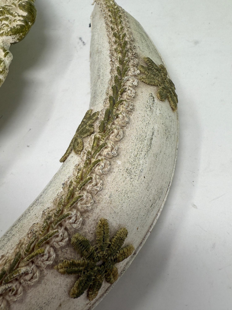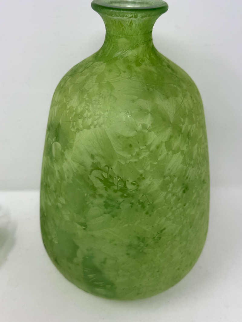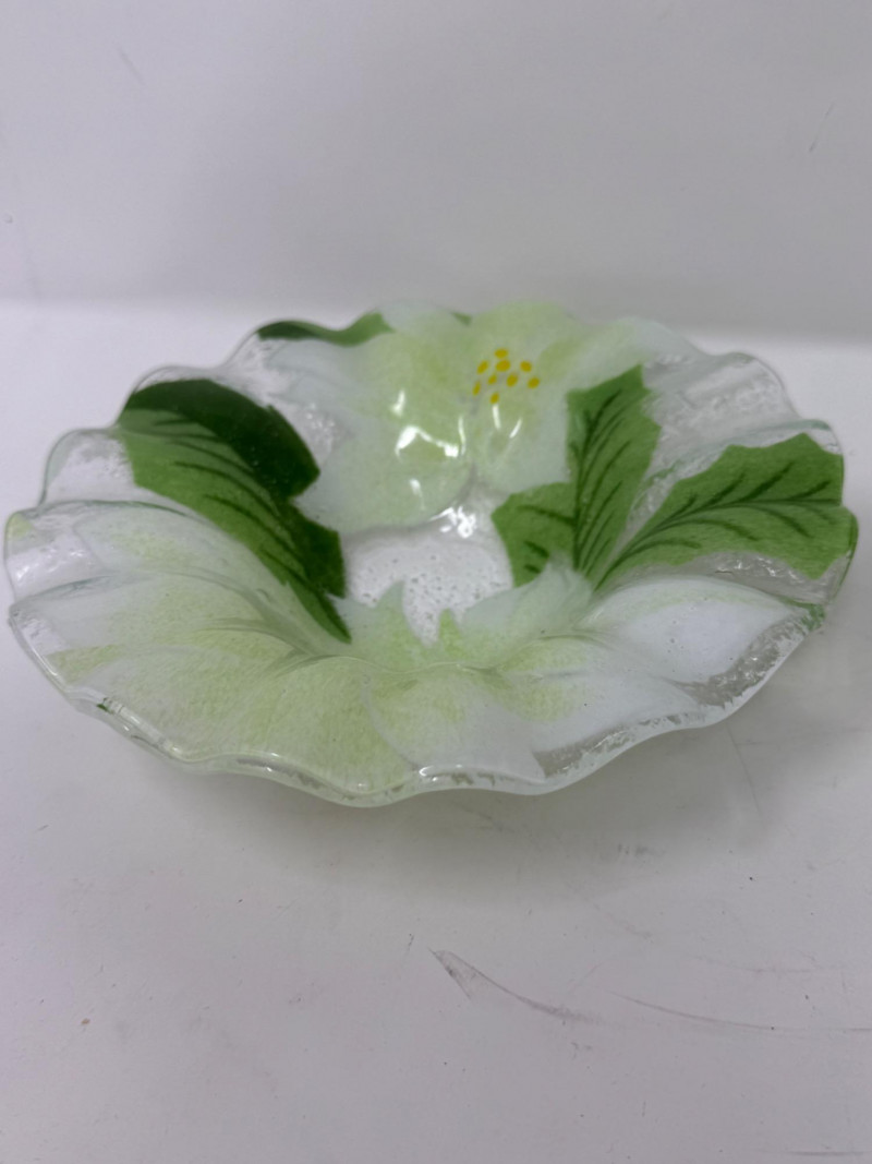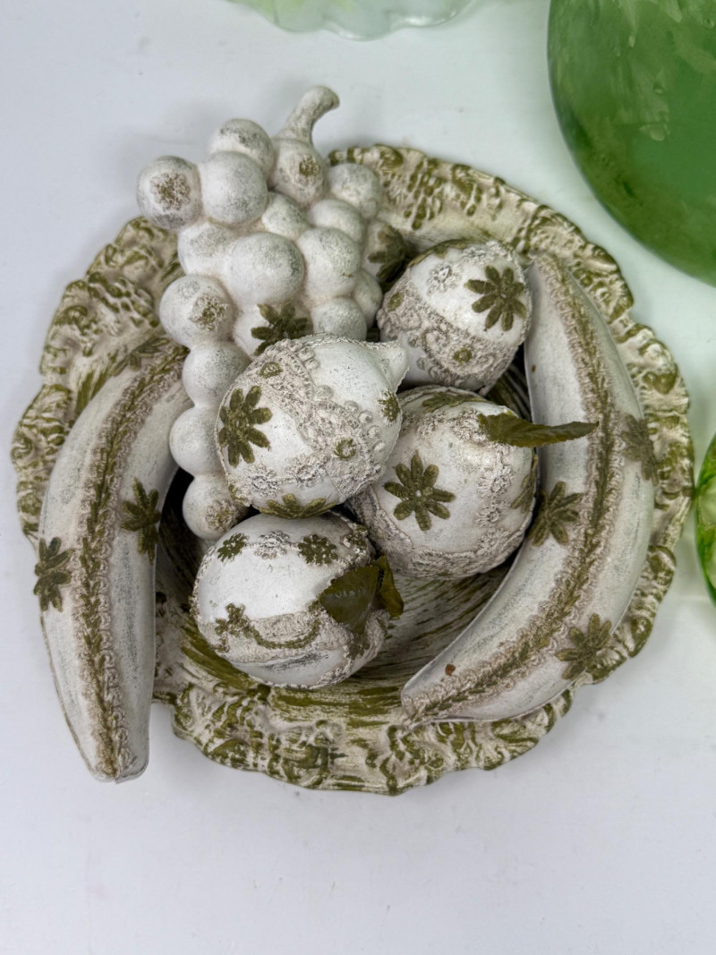 Thick Glass Floor Vase - Unique Fruit Plate + Vase is 7.5x12” Fruit plate is a light pottery feel with fabric adorning. 11”