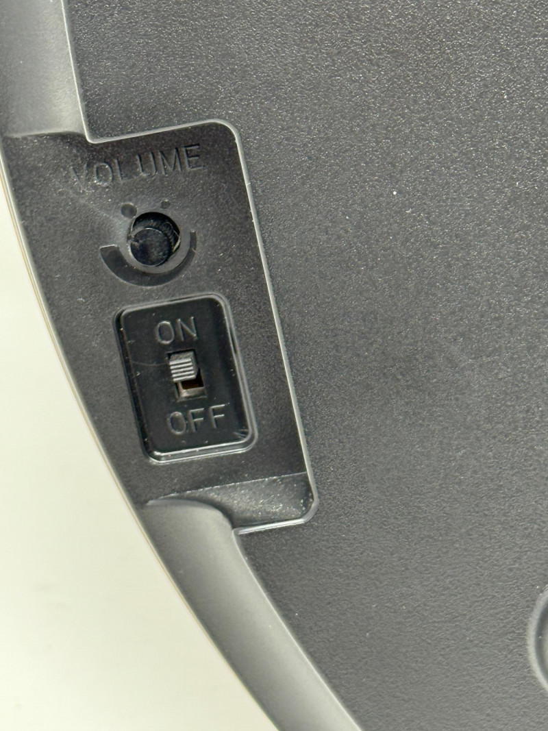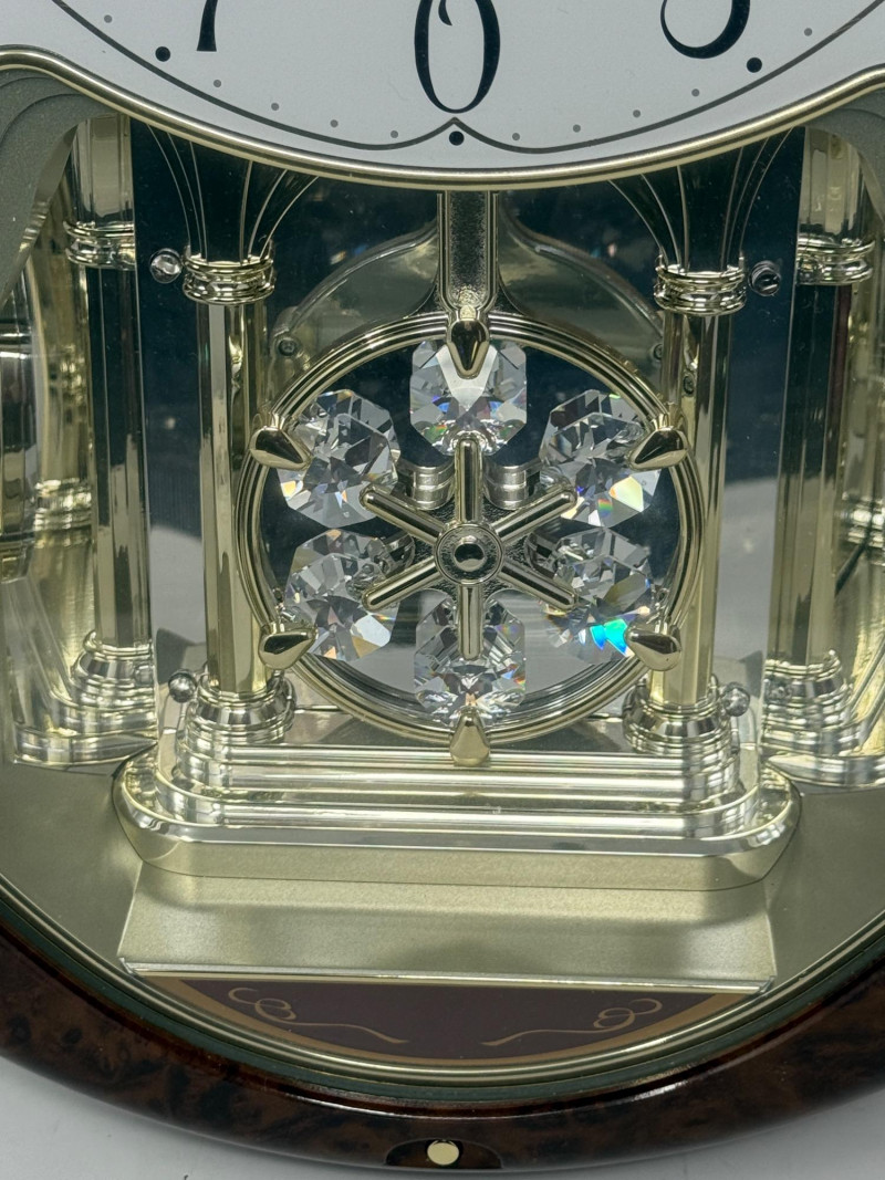 Acrylic burl wood frame and face with crystal pendulum. Battery operated with on/off and volume control.