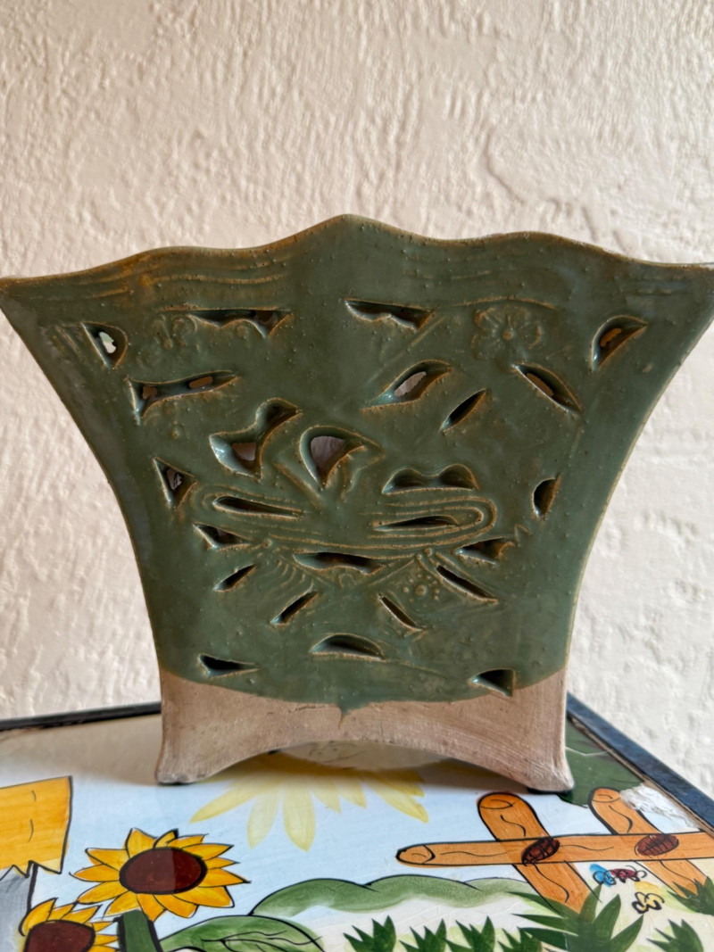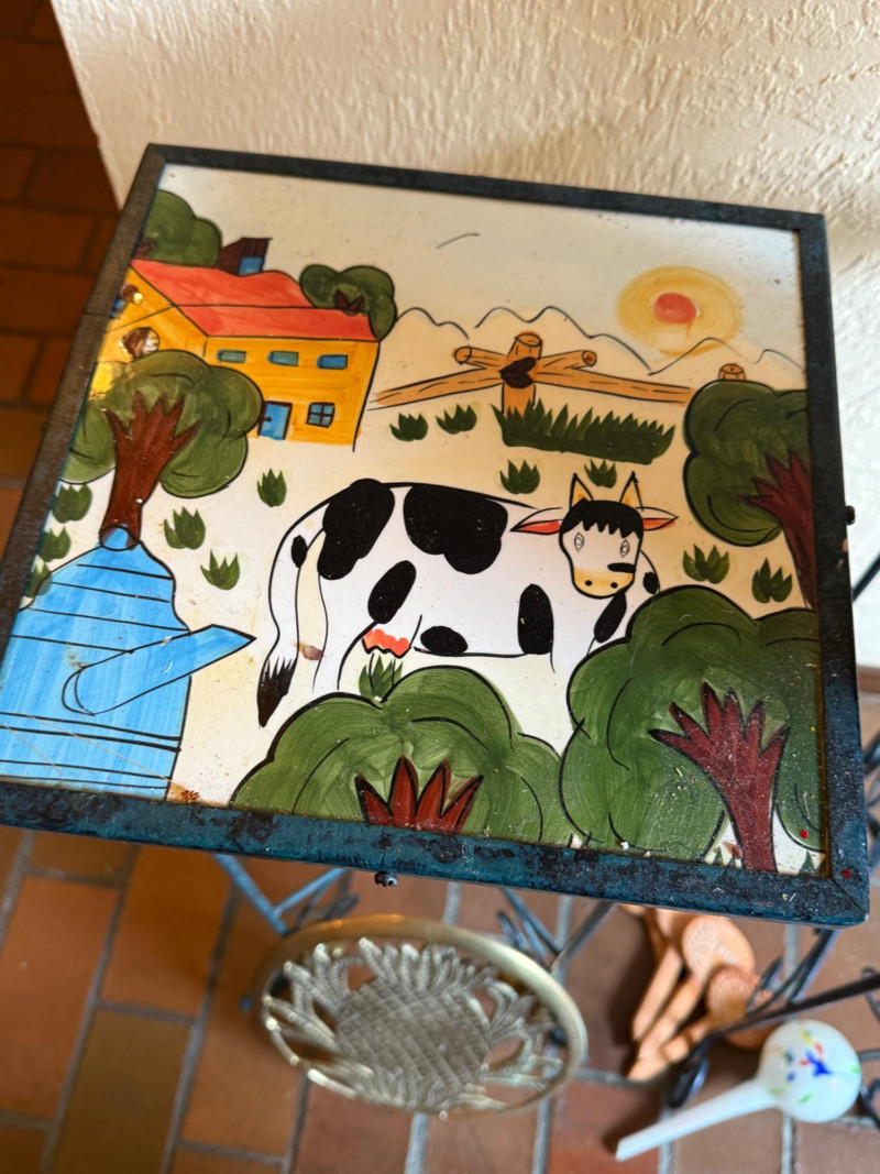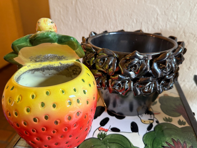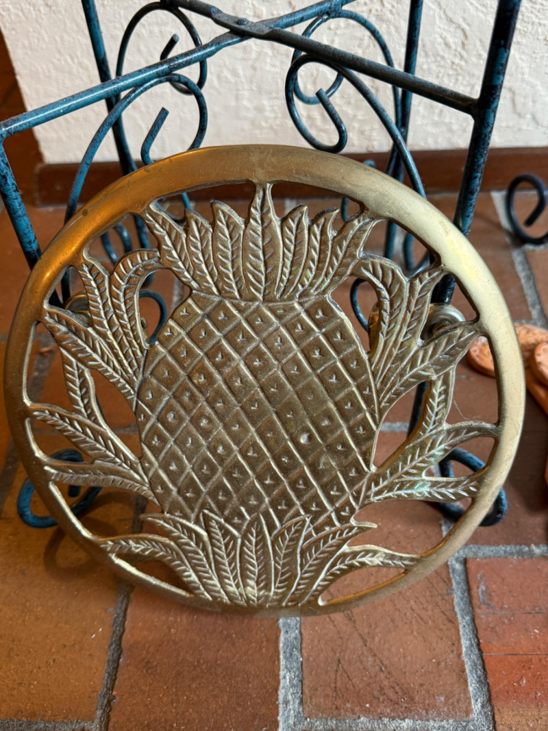 2 Metal stands with glass tops 10.5x10.5x27” Brass pineapple plant stand on wheels 9.75” 4 pots Self waterer Garden ID sticks
