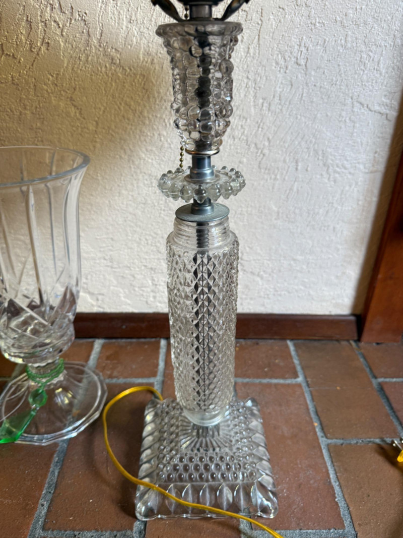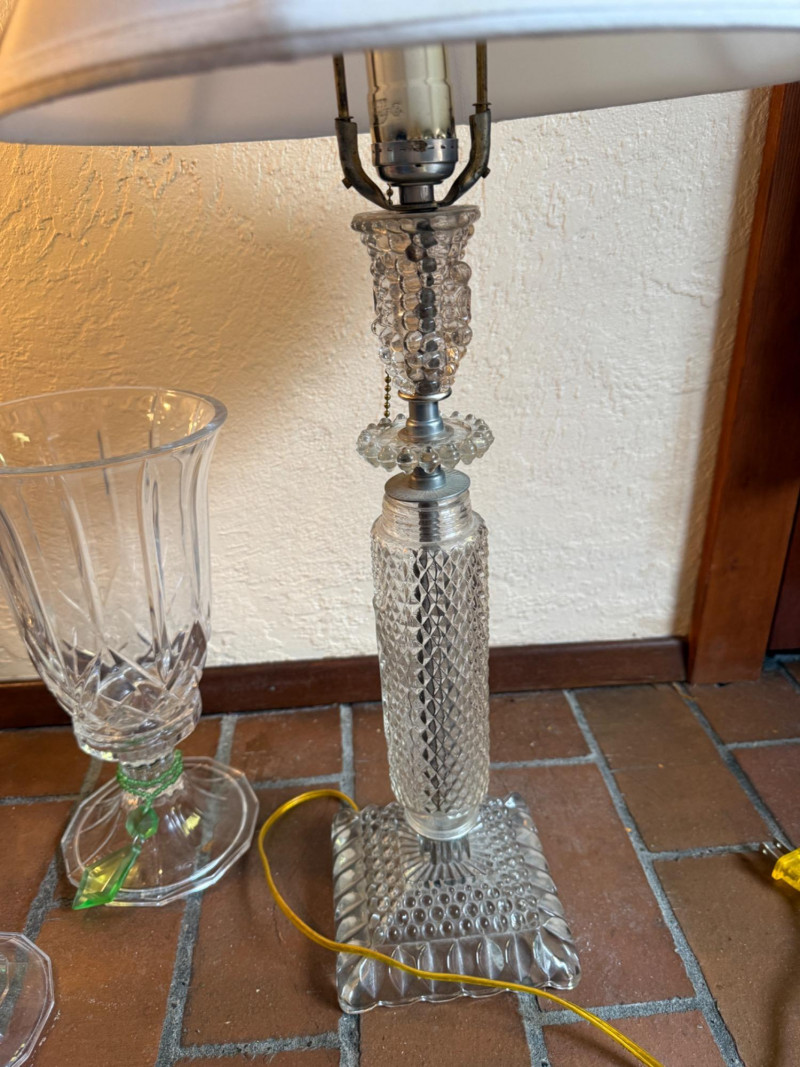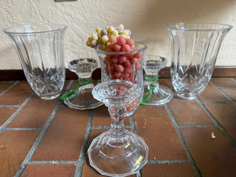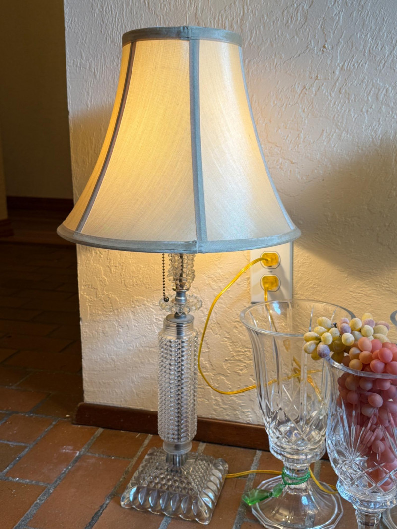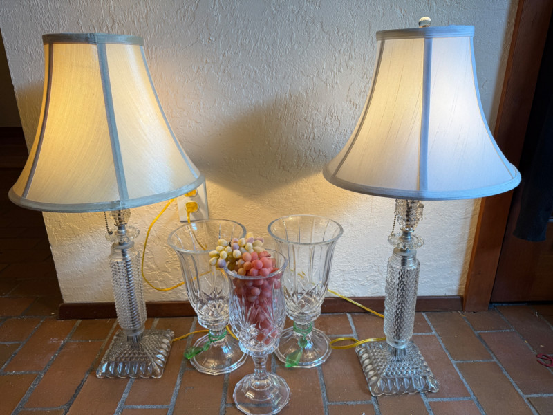 Crystal Footed Candleholders & Beaded Glass Lamps 2 Matching candleholders are 6x12” Candleholder with grapes is 4.5x12” lamps are 26.5” tall with 12” shade. One finial missing.