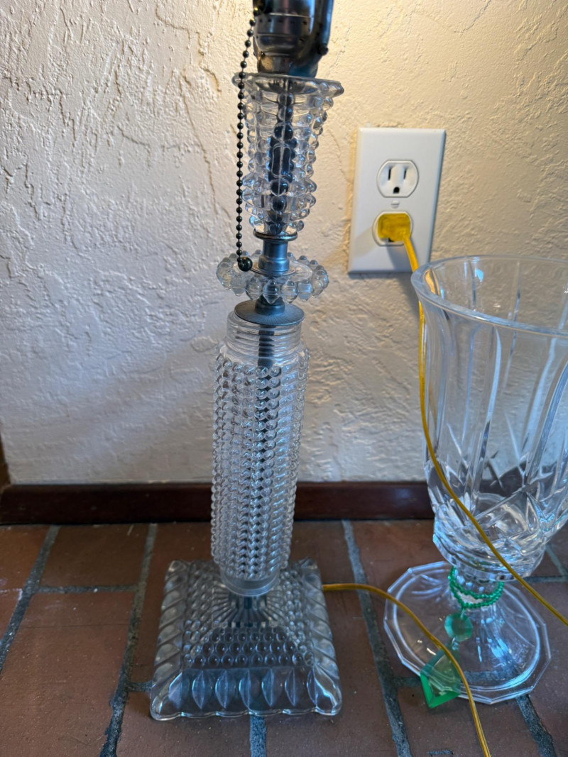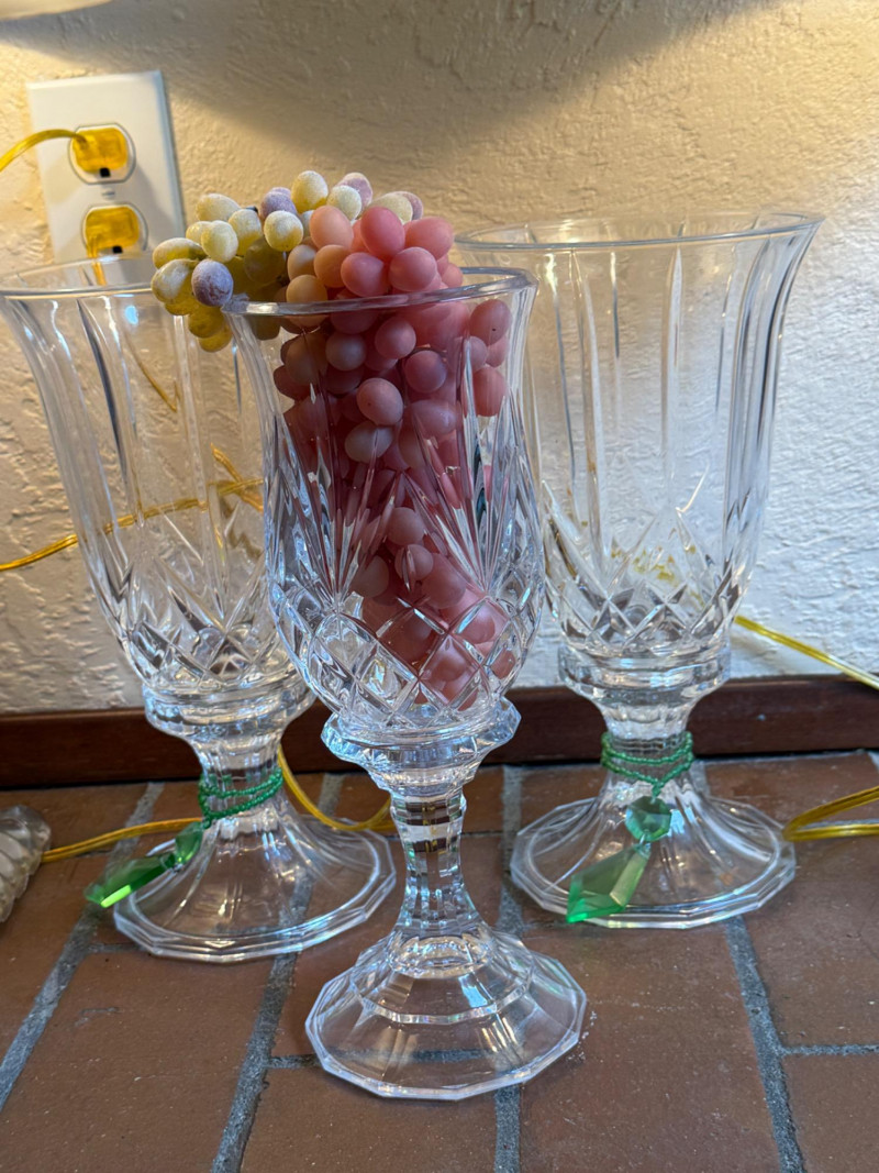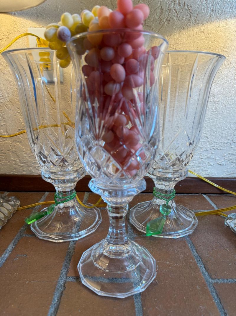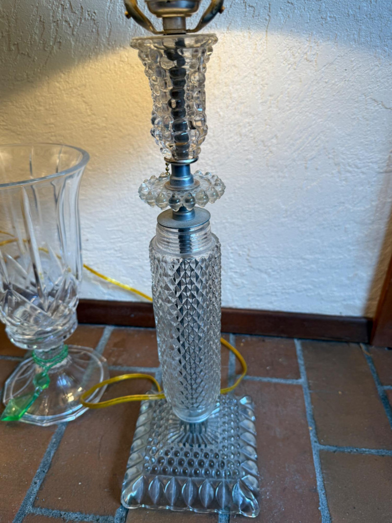 Crystal Footed Candleholders & Beaded Glass Lamps 2 Matching candleholders are 6x12” Candleholder with grapes is 4.5x12” lamps are 26.5” tall with 12” shade. One finial missing.
