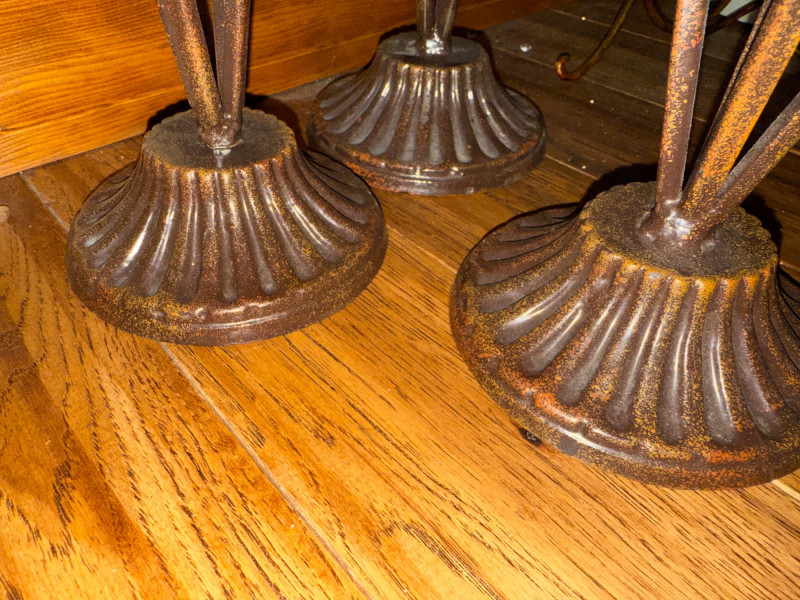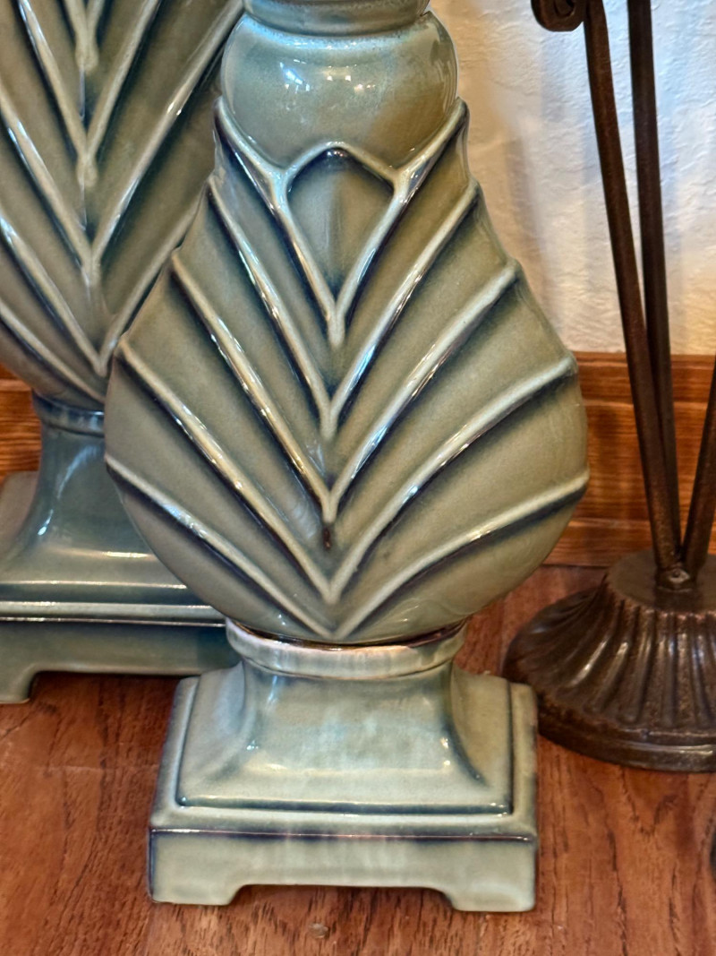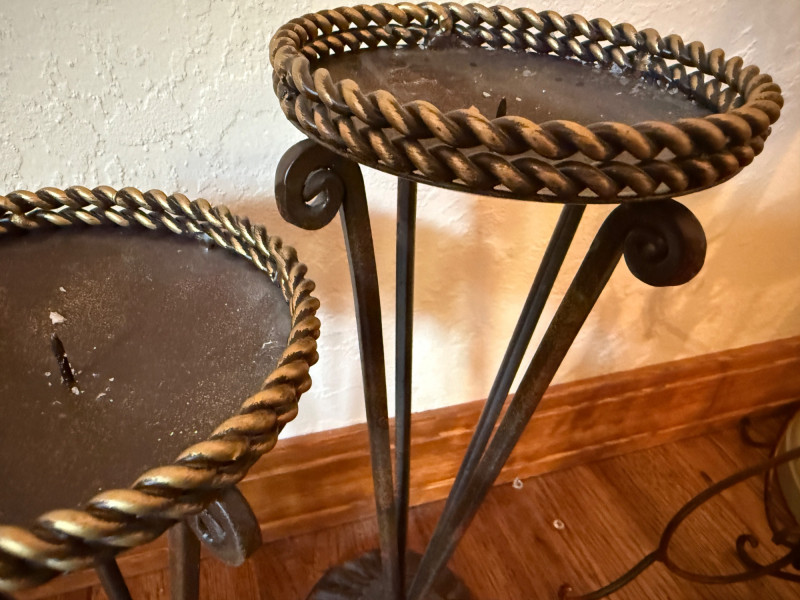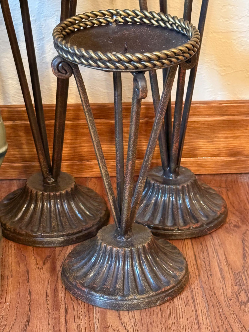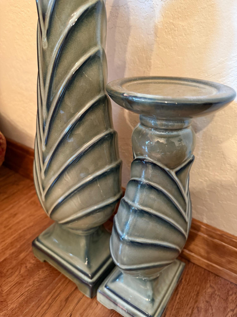(2) Glazed Ceramic and Metal Candle Holder Sets Tallest of 2 green with dark green accents glazed ceramic holders is 5.5x20” Tallest of 3 rope edge metal holders with brown ceramic base is 13”x5”