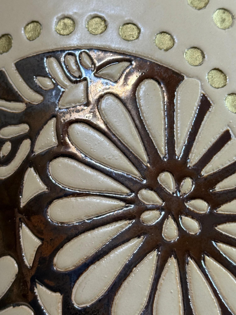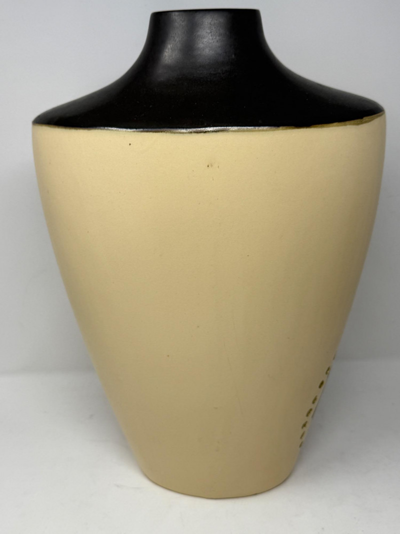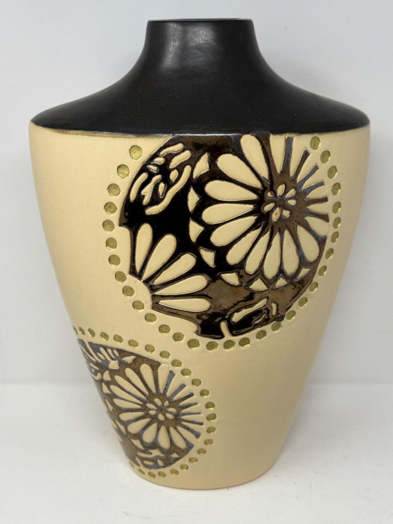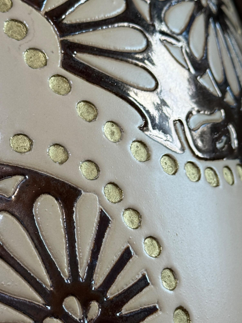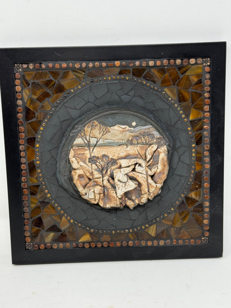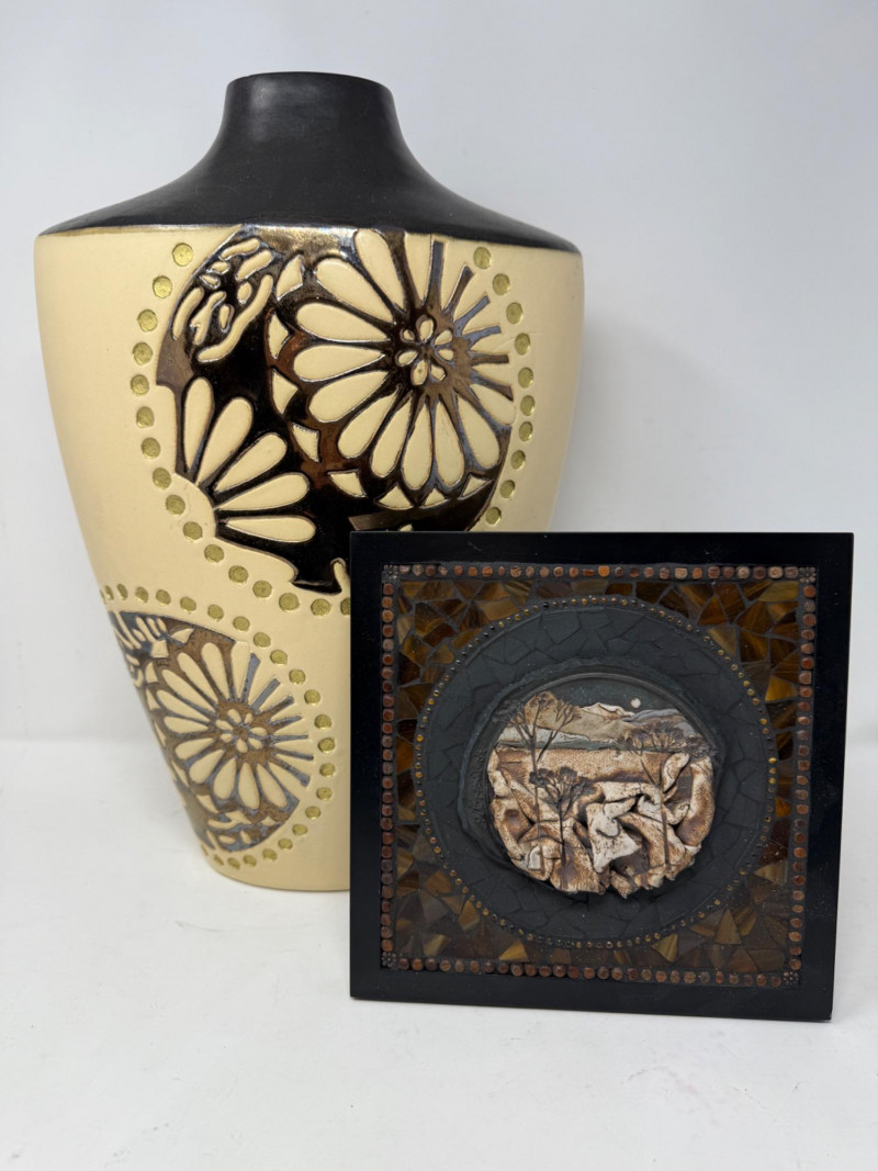 Large Floor Vase & Mosaic Art by Rebecca Bowden Vase is 12x6x17” Tan and brown with a shiny gold accent.