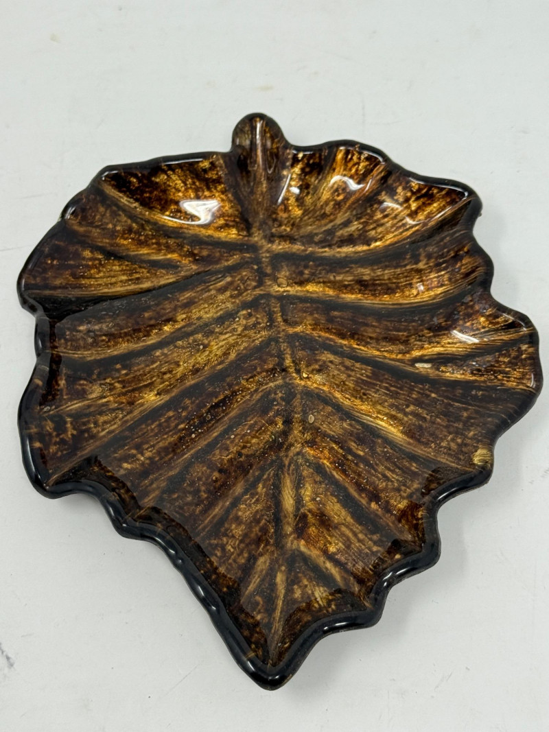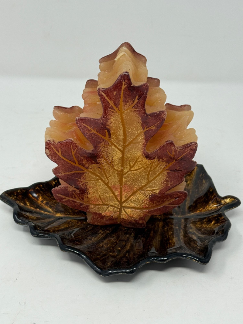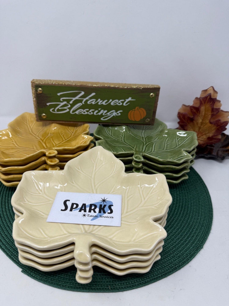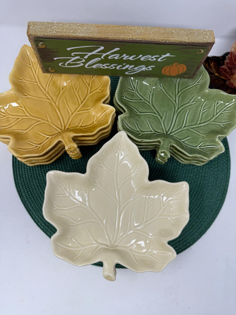 Set of 12 8” Ceramic Maple Leaf Appetizer Plates Harvest Blessing sign Brown and gold leaf plate and maple leaf candle.