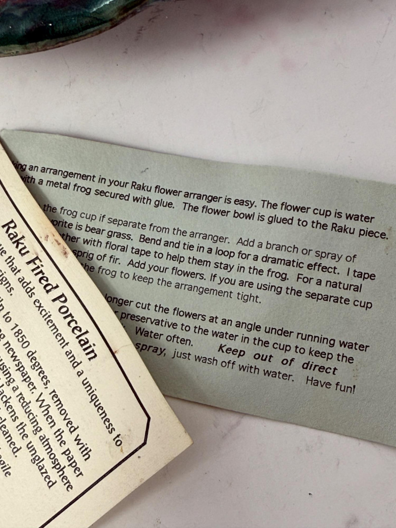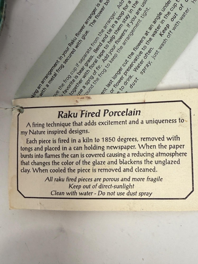 Raku fired porcelain vase with removable frog. See pics for description. 9x1.5”