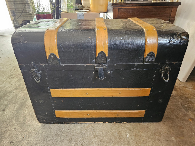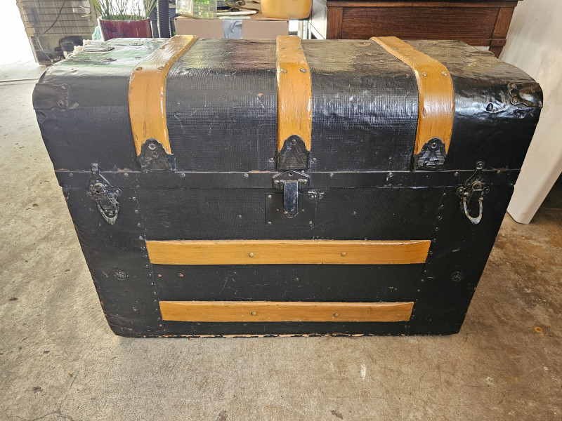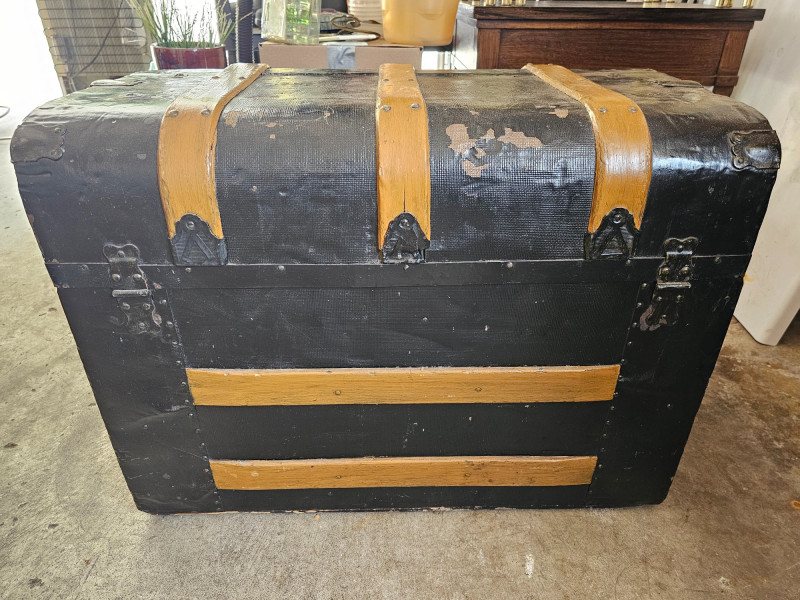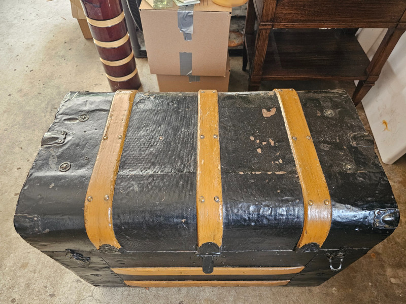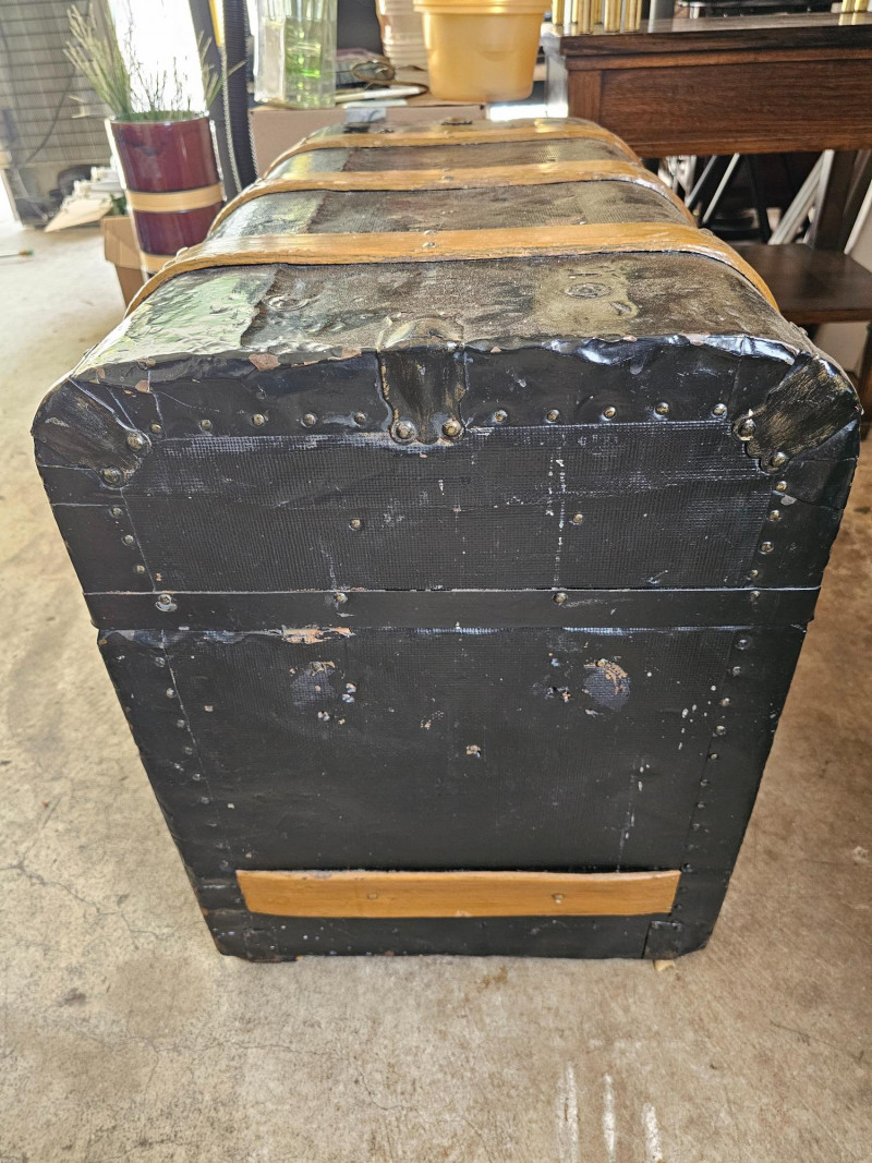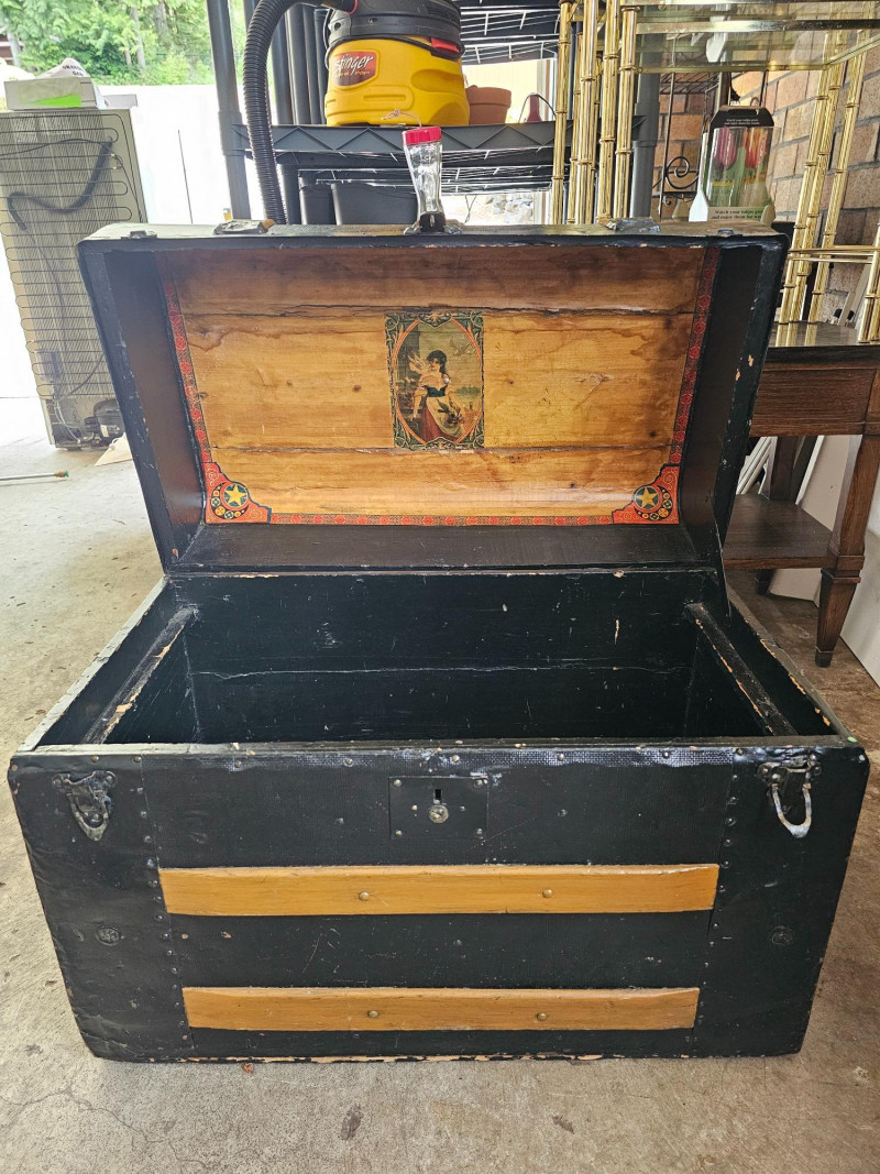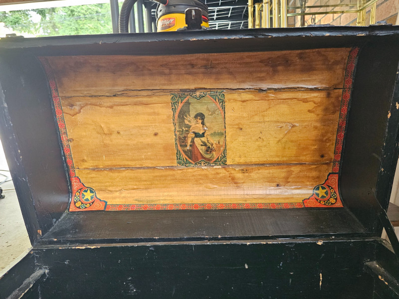 Vintage Hand-Made Painted Wood Trunk Painted wood body and lid with metal corners, clasps, and lockplate (no key) Has a picture of a Victorian woman on the underside of the lid with a red border Tiny metal wheels on the bottom Both handles are missing, and it has dents and dings all over. Missing paint is areas. Probably in fair condition. It doesn't take away from the vintage and well-worn look! 21"T x 28"W x 16"D