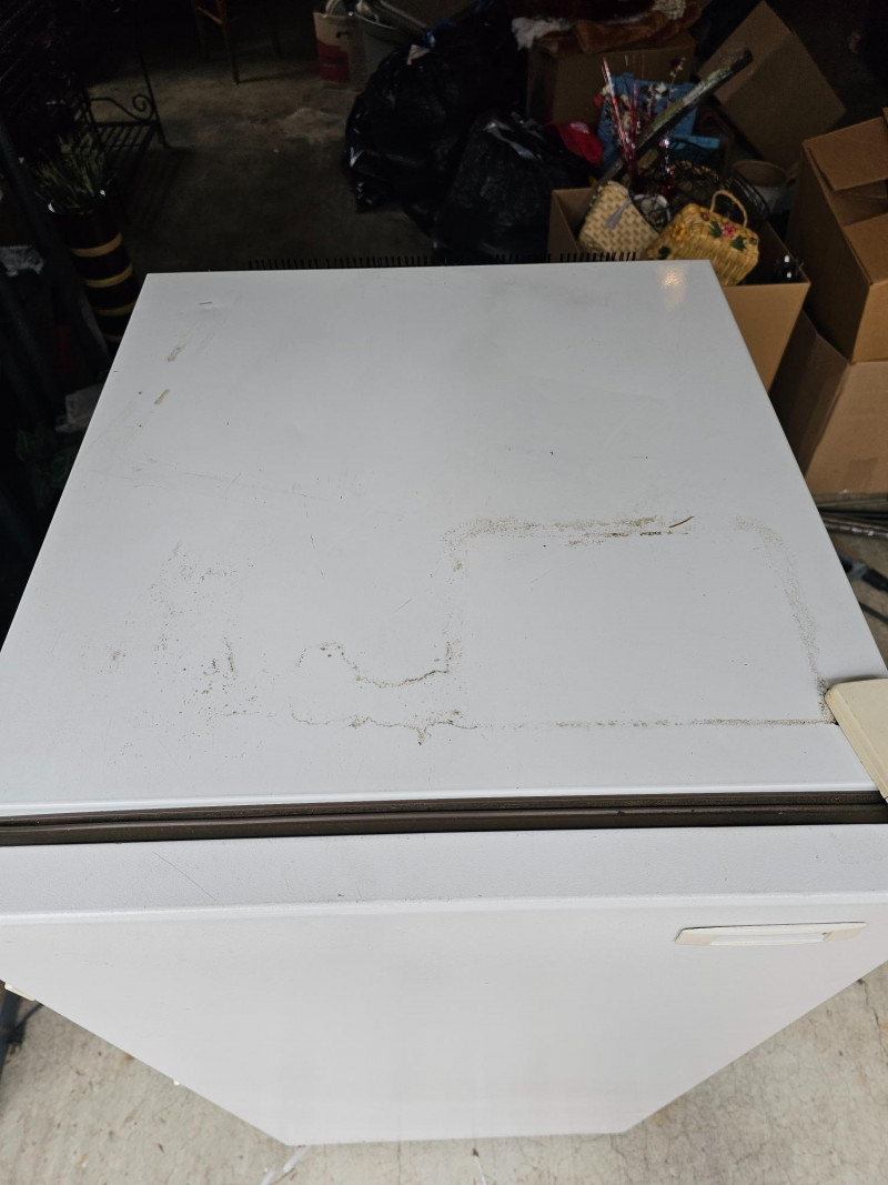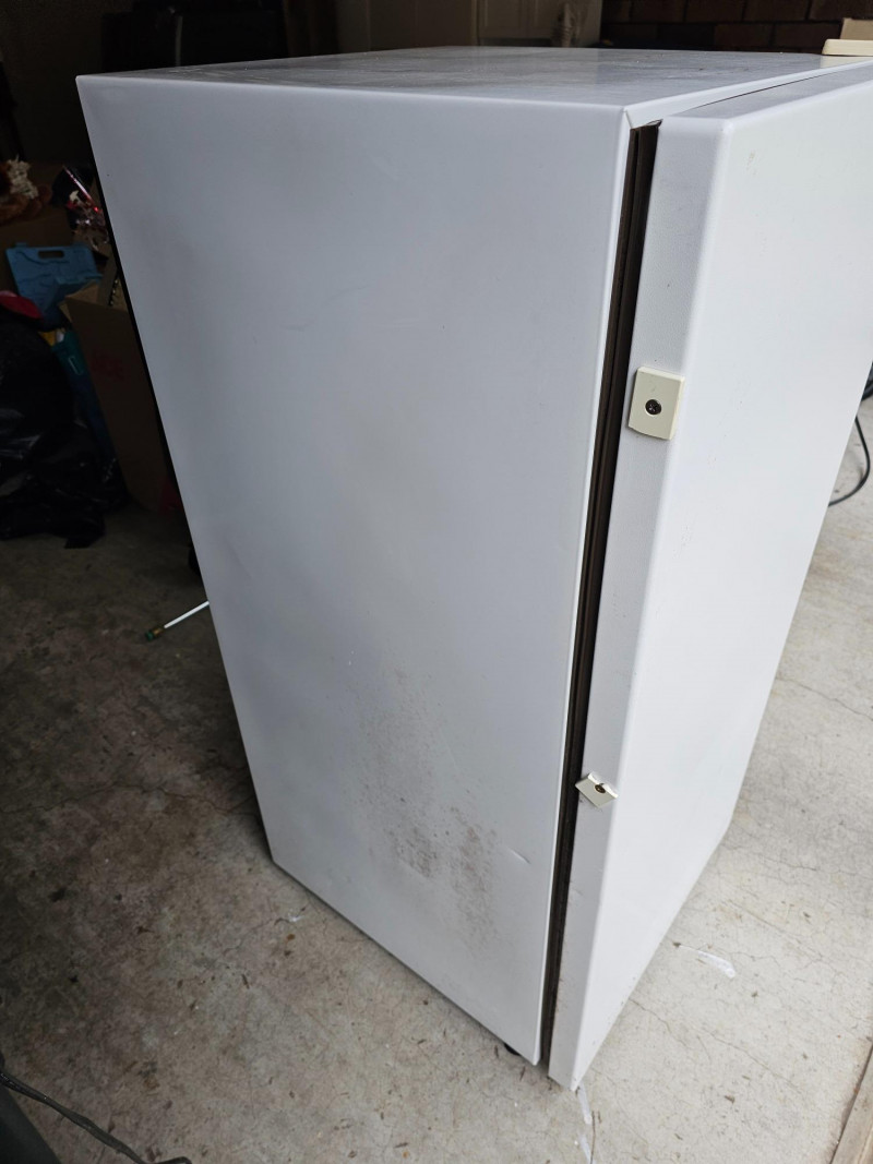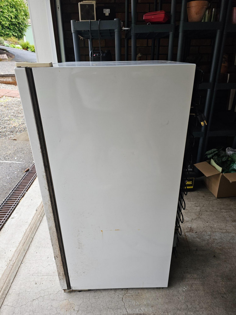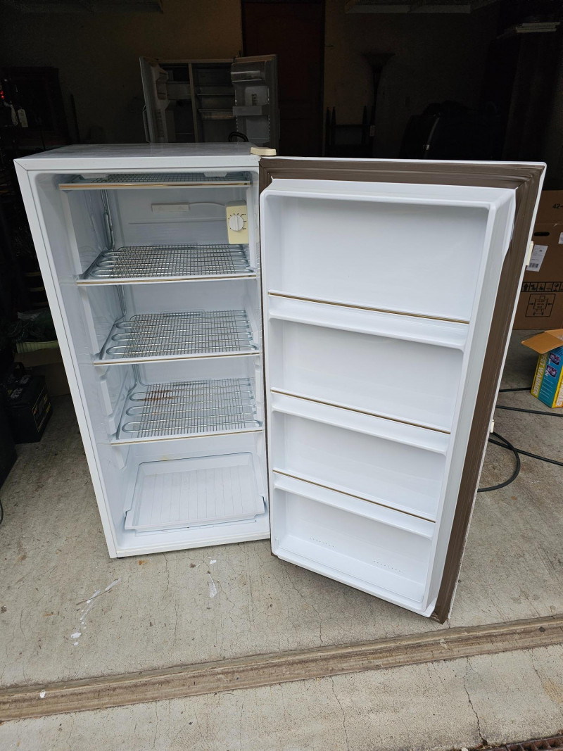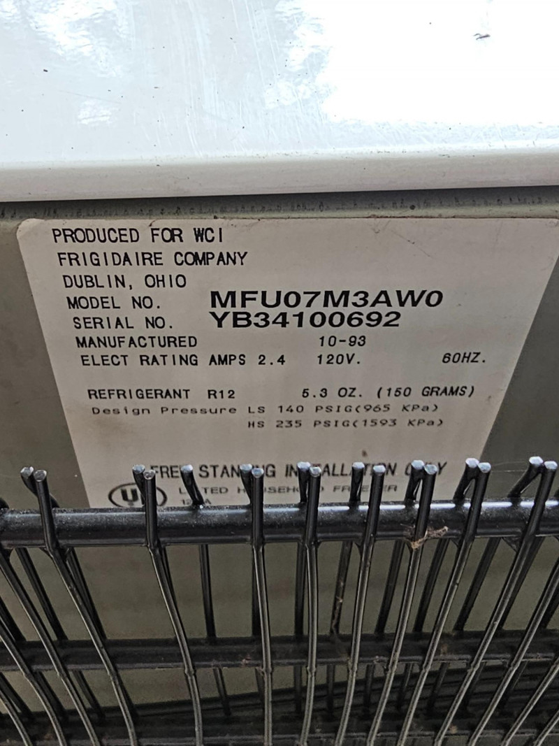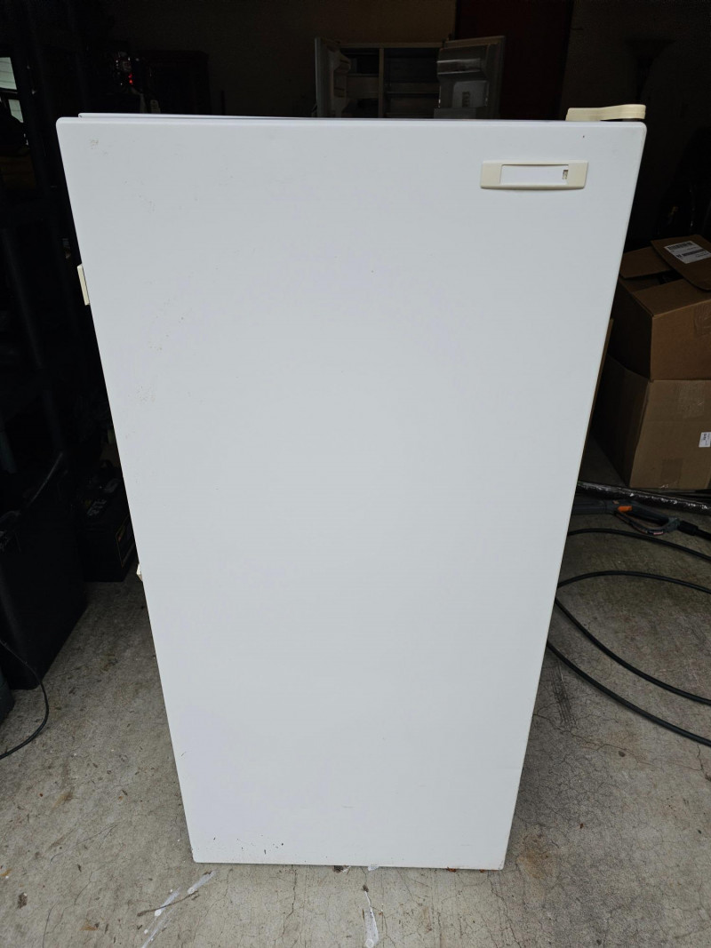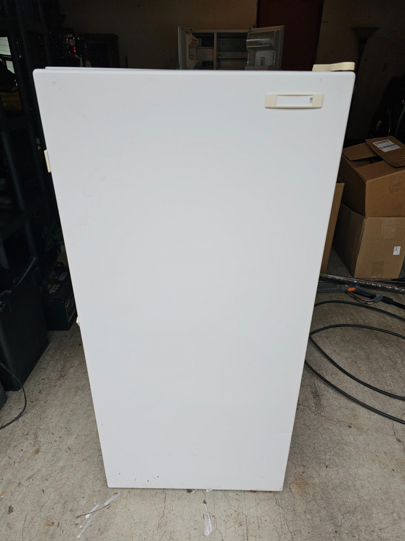 Frigidaire Compact Upright Freezer Model #MFU07M3AW0 8.4 cu ft capacity Mfg 10/1993 46"T x 21"W x 25"D Clean Door handle is missing Tested - Works!
