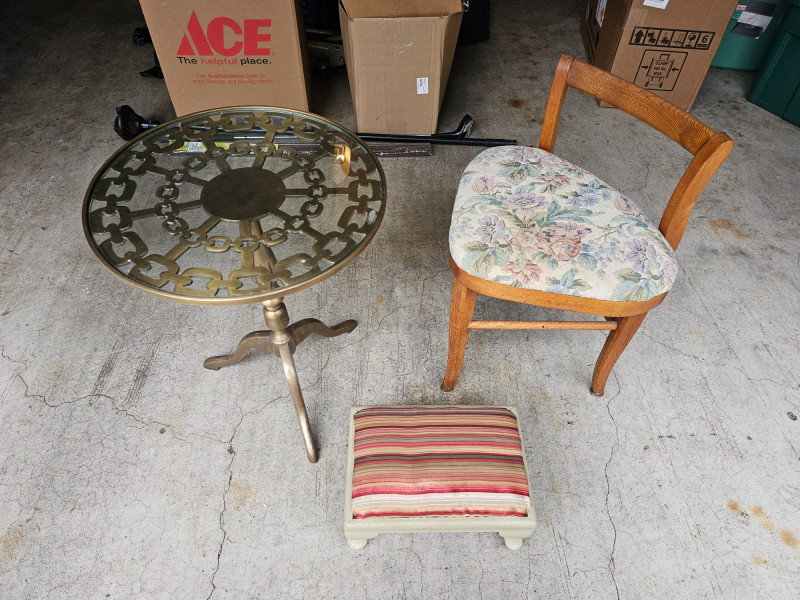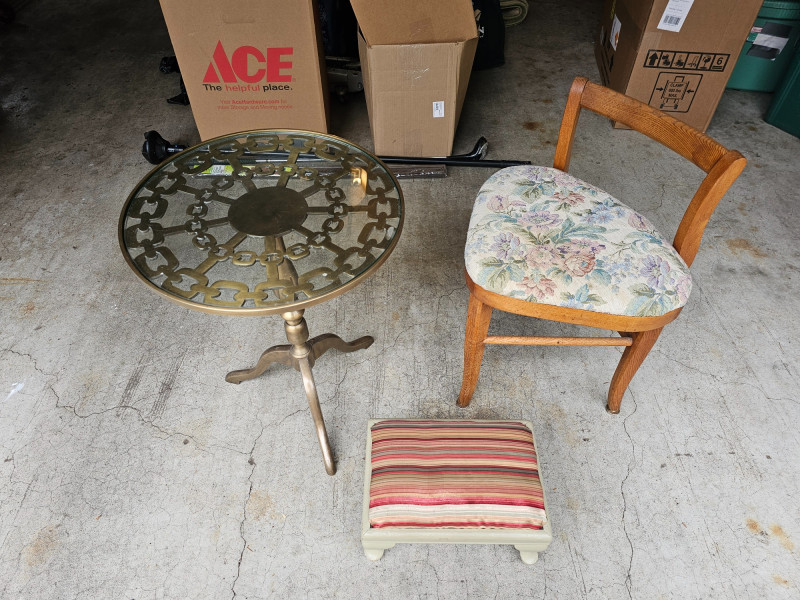 Lot # 160 - Small Glass-Tap Metal Table, Vanity Stool, Foot Stool