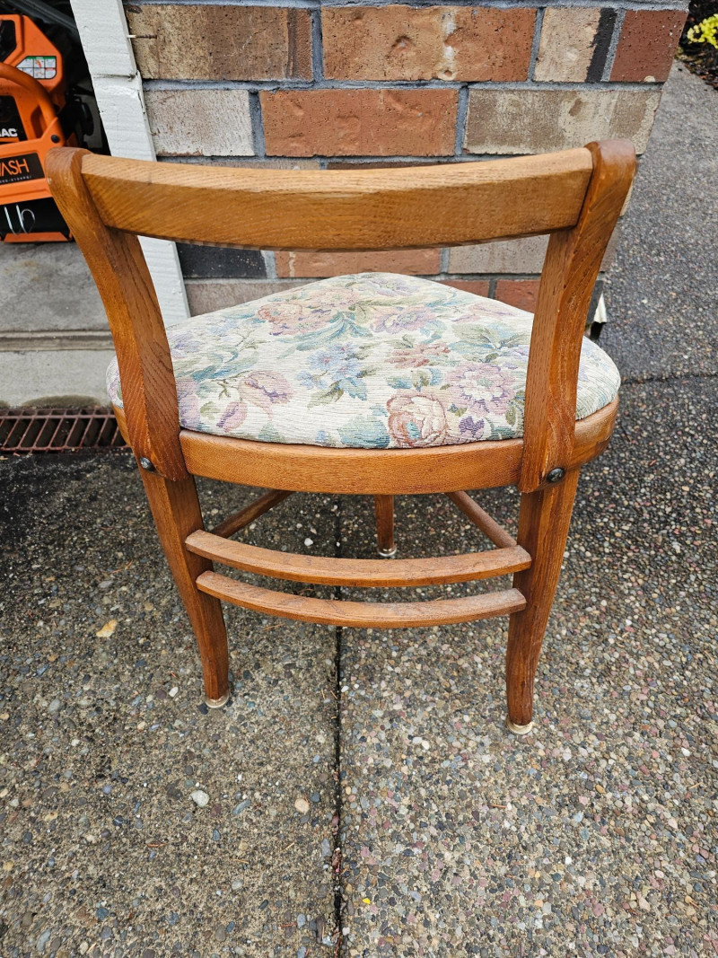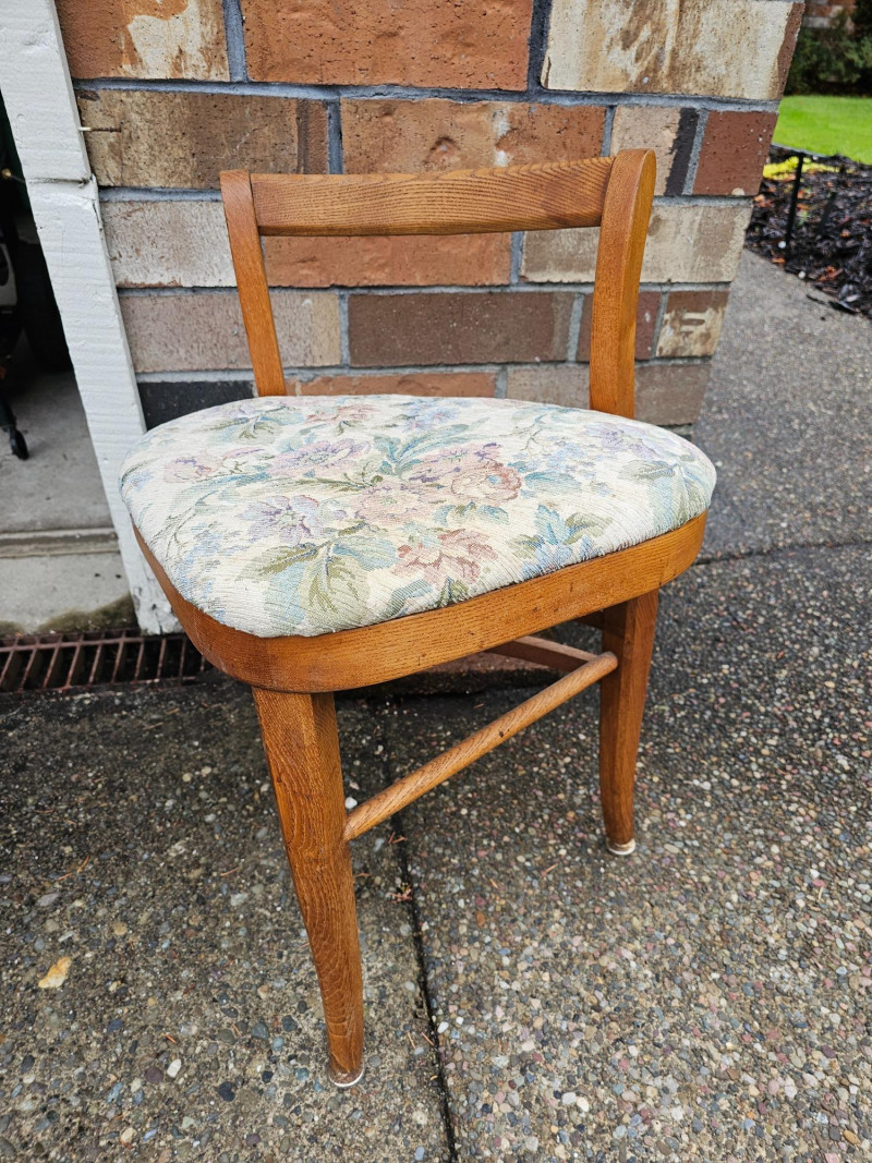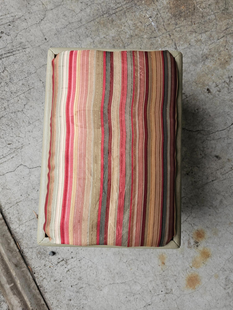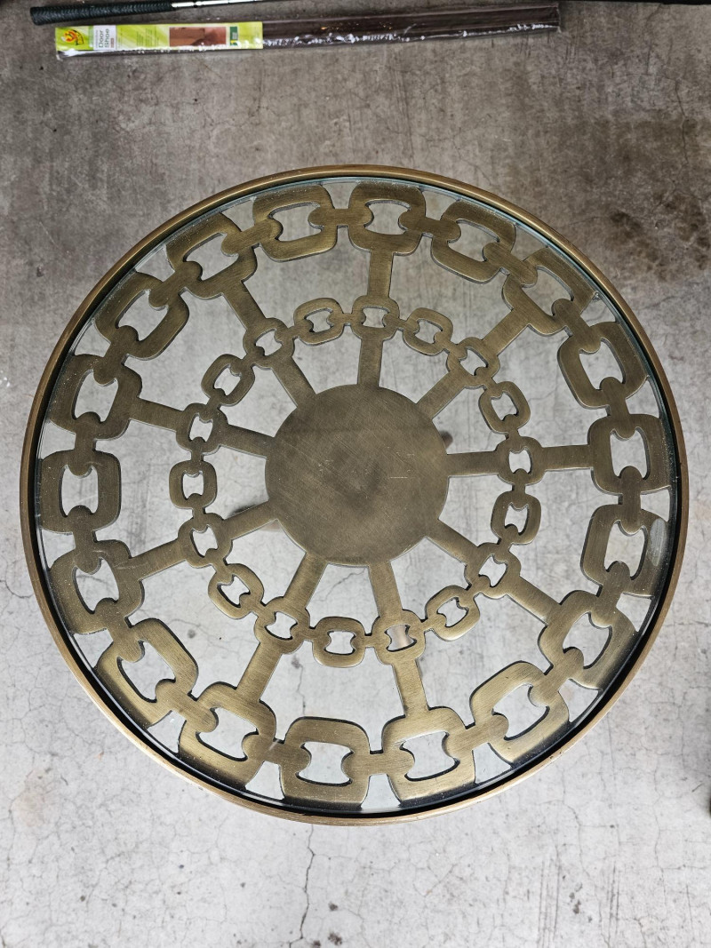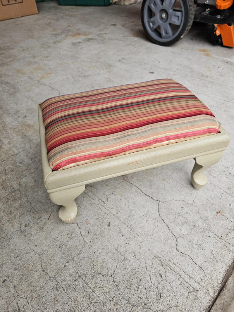 Small Glass-Tap Metal Table, Vanity Stool, Foot Stool Small glass-top table with metal base has a chain-style decorative look on top 23"T x 18.5"W Wood vanity stool with floral upholstery 25.5"T x 19"W x 16"D Small wooden foot stool with padded top 8"T x 13.5"W x 9.5"D