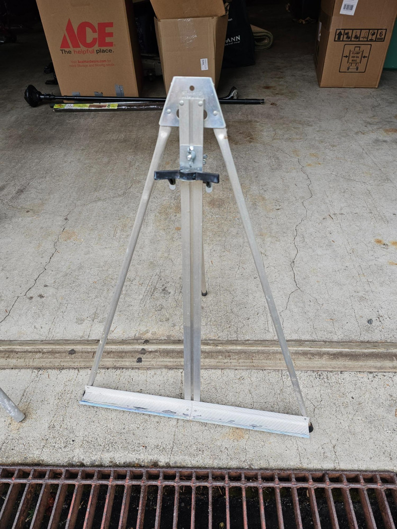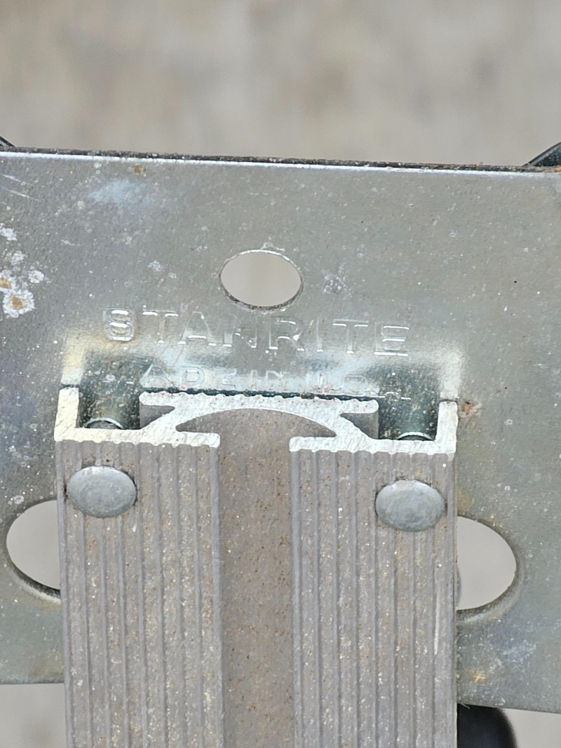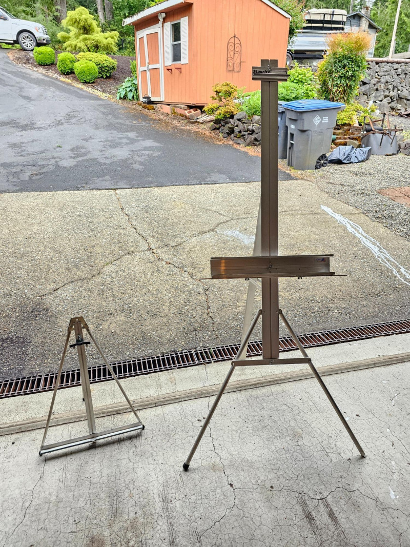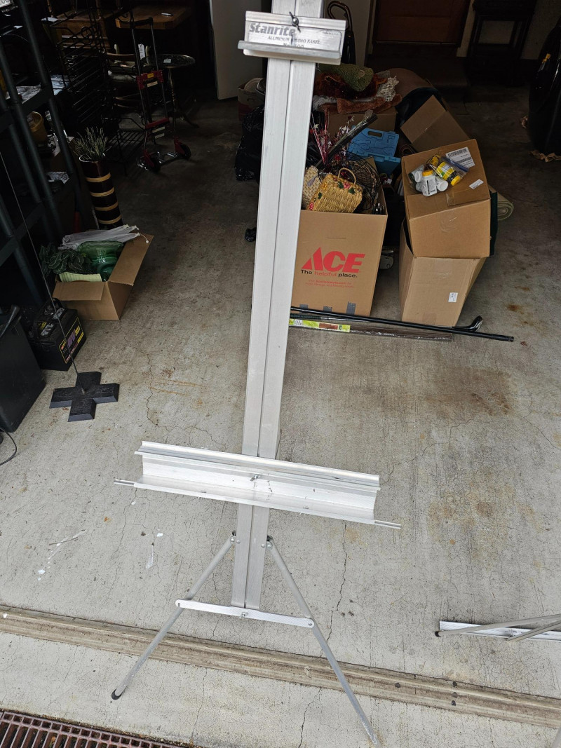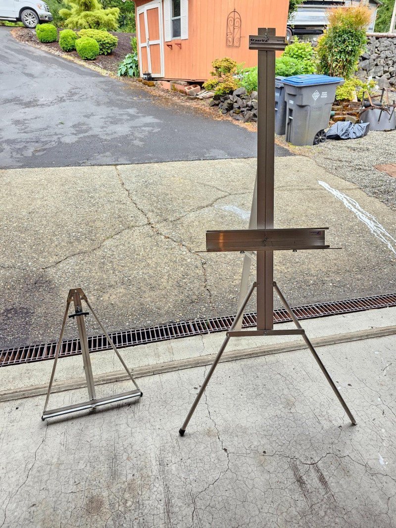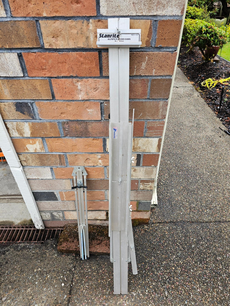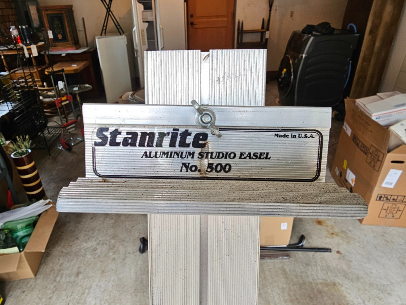 Pair Of Stanrite Aluminum Easels (1) Large Stanrite Aluminum Studio Easel No. 500 (Fully Adjustable) 65"T x 32"W x 29"D (1) Small Stanrite Aluminum Tabletop Easel (Fully Adjustable) 24"T x 18"W x 14"D Studio Easel is missing a pin on the leg and a rubber leg pad (see pics) Both fold up for easy storage!