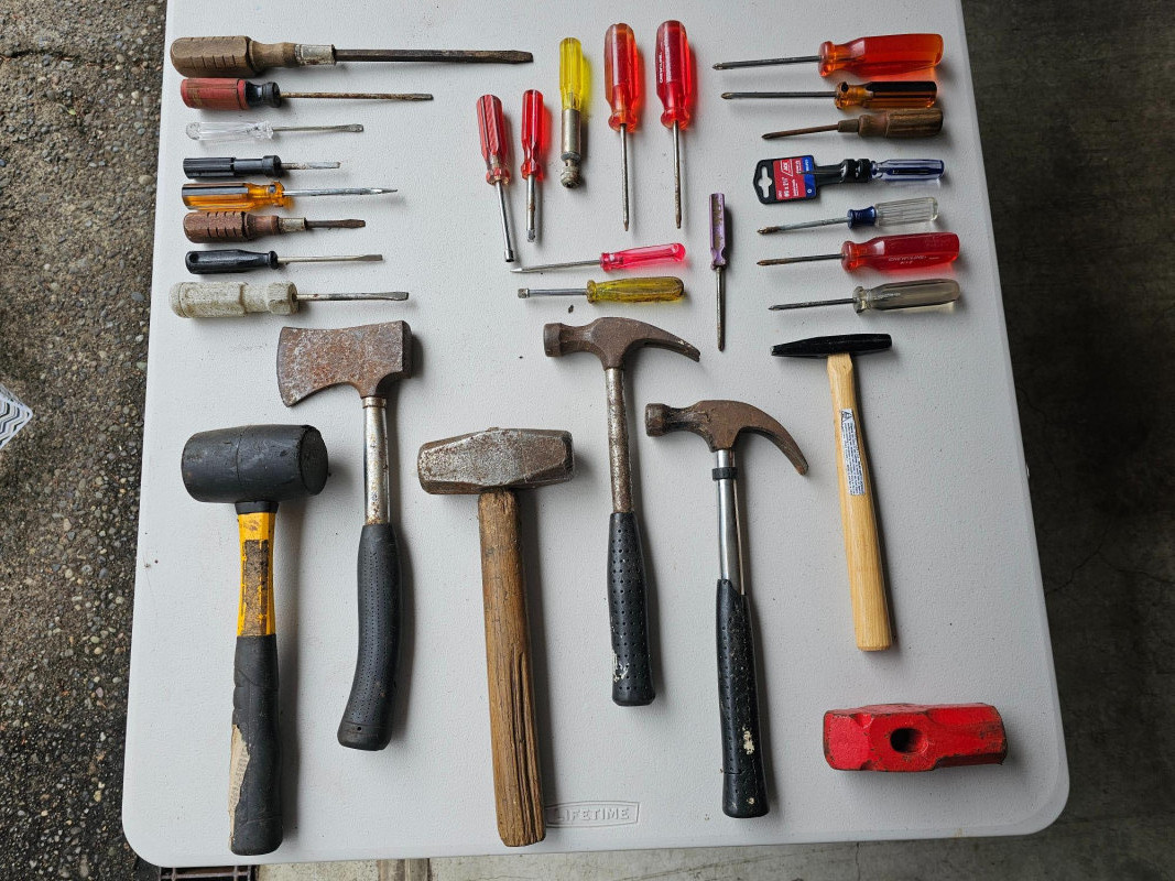 Hammers & Screwdrivers Hammers and screwdrivers of all shapes and sizes Hatchet, small sledge, Mallet Phillips, standard, star tip Over 30 tools!