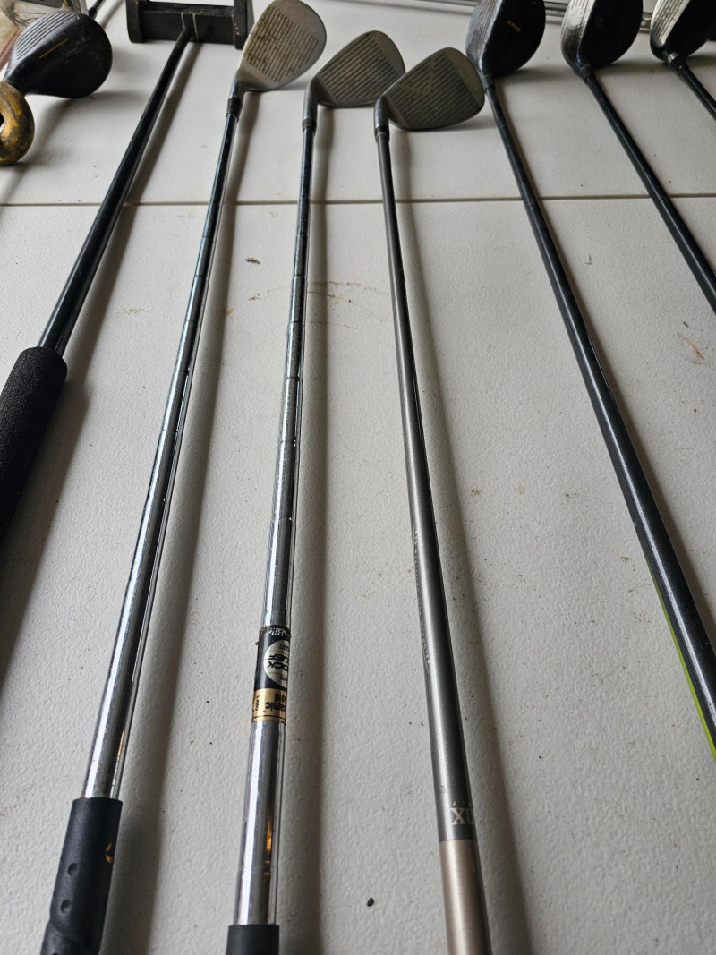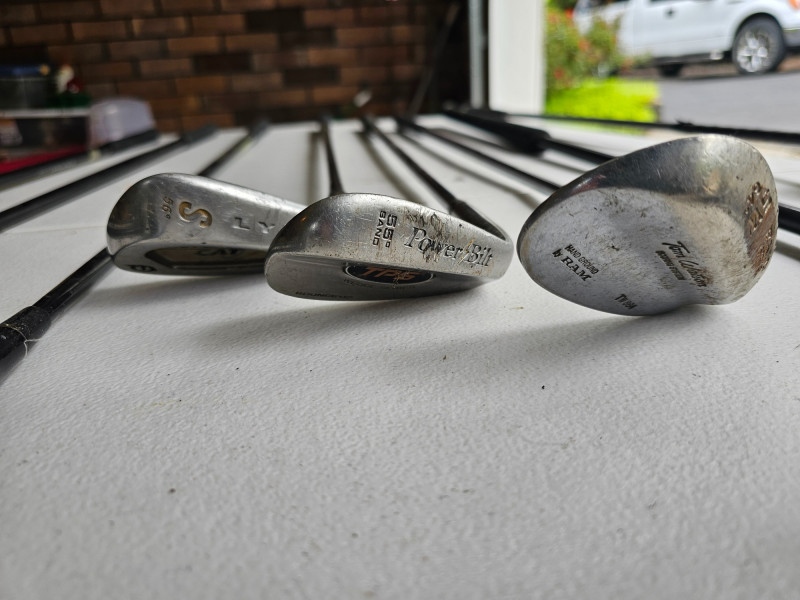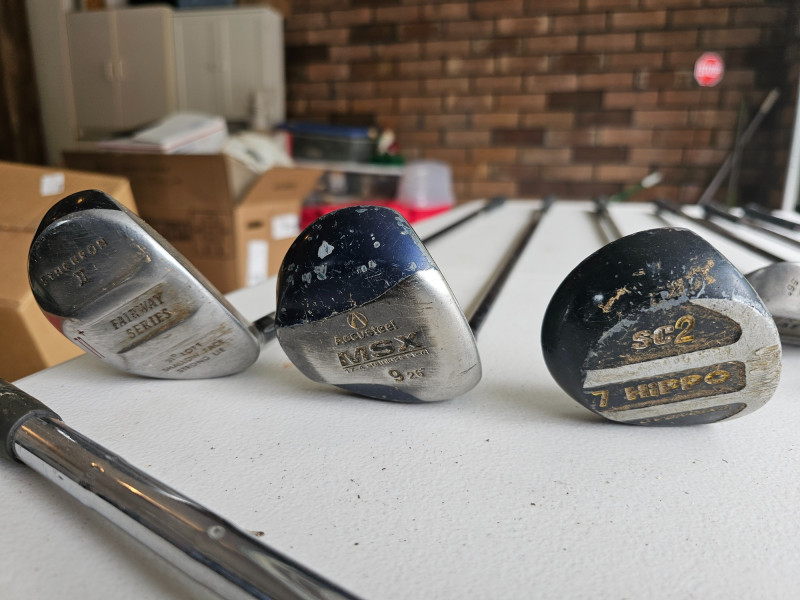 Golf Clubs: Misc Wedges & Woods, Putter, Swing Trainers Lynx Silvercat 15-5 56° SW With Graphite Senior Flex Shaft TPS Powerbuilt 55° SW With Steel Shaft RAM Tom Watson 64° SW With Steel Shaft Synchron II Fairway Wood 31° Loft With Graphite Aldila VX Shaft Accusteel MSX Fairway Wood 26° With ACD Graphite 4.5° Torque Flex Shaft Hippo SC2 7 Wood With Graphite EasyFlex 78 Shaft Long "Belly" Putter Small 747 XL Fairway Wood With Swing Weight Medicus 10.5° Driver With Hinged Steel Shaft Swing Trainer For Right-Handed Players These clubs vary from fair to good used condition (see pics)