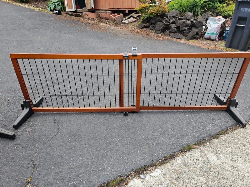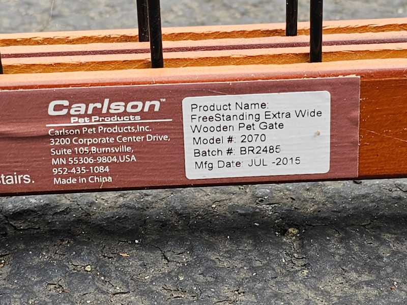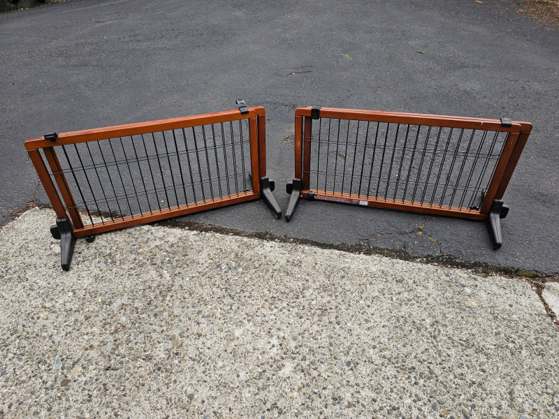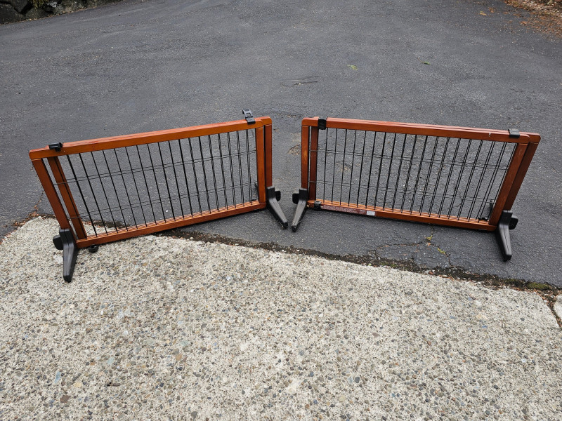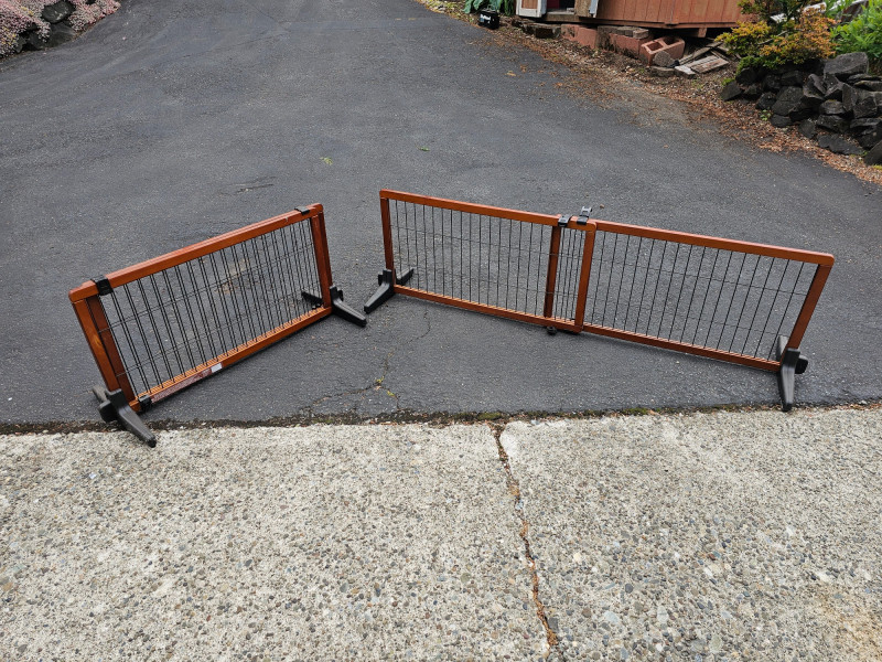 (2) Freestanding Extra Wide Wooden Pet Gates Carlson Model #2070 20.5"T x 40.5"W x 17"D (smallest) 20.5"T x 71"W x 17"D (expanded) Wood frame, metal gate, plastic base 4 locks keep gate secure and wide 17" base keep it stable Both in good working condition