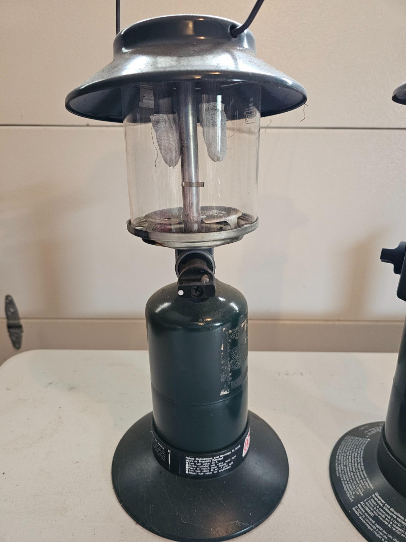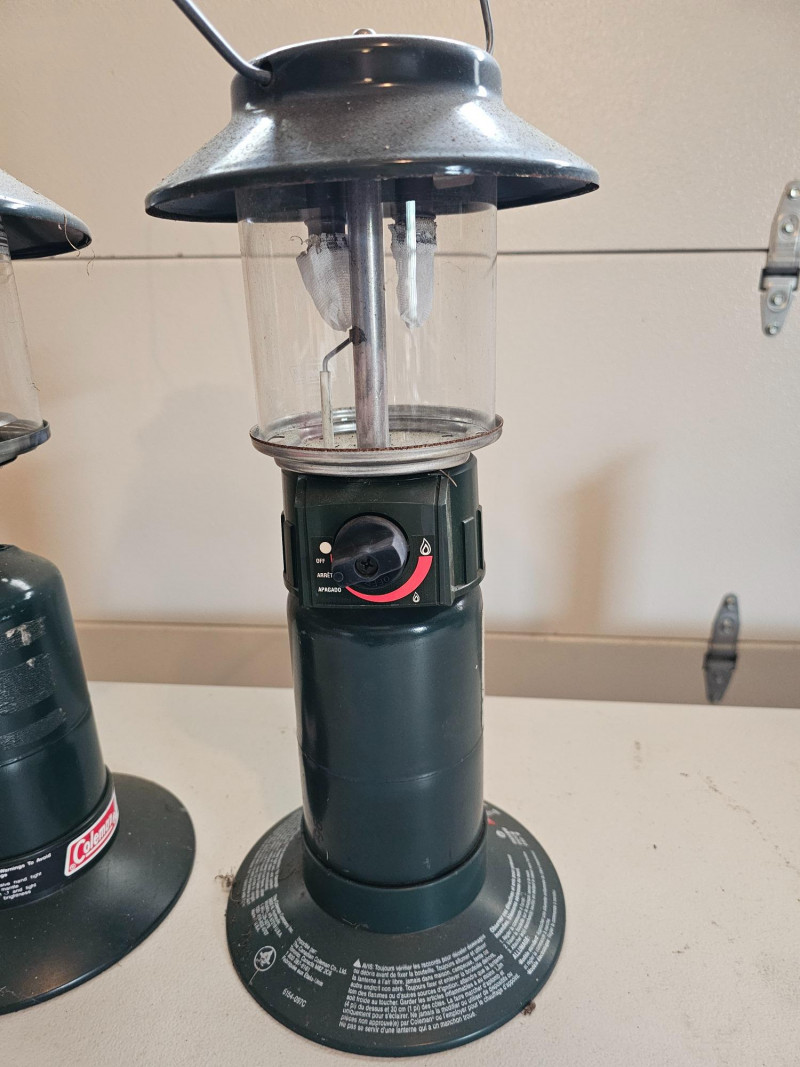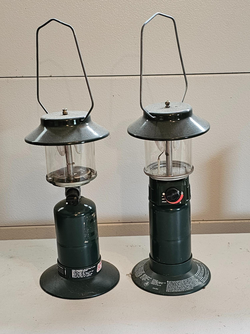(2) Coleman Dual-Mantle Propane Lanterns (1) Coleman 5154B Dual Mantle Electronic Ignition (1) Coleman Dual Mantle Matchlight Lantern Untested, but each one has an installed fuel bottle