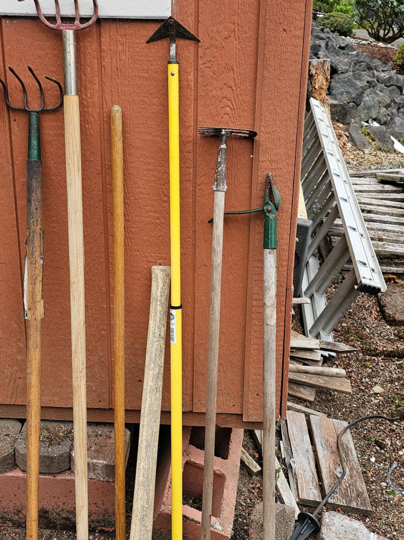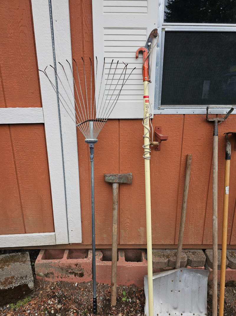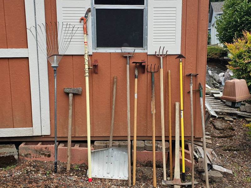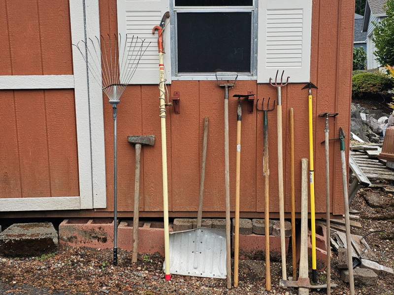 (12) Garden Tools Snow shovel, pruner, rake, hoe, weeder, pick axe (needs attached to handle), axe and more! 12 tools in all!
