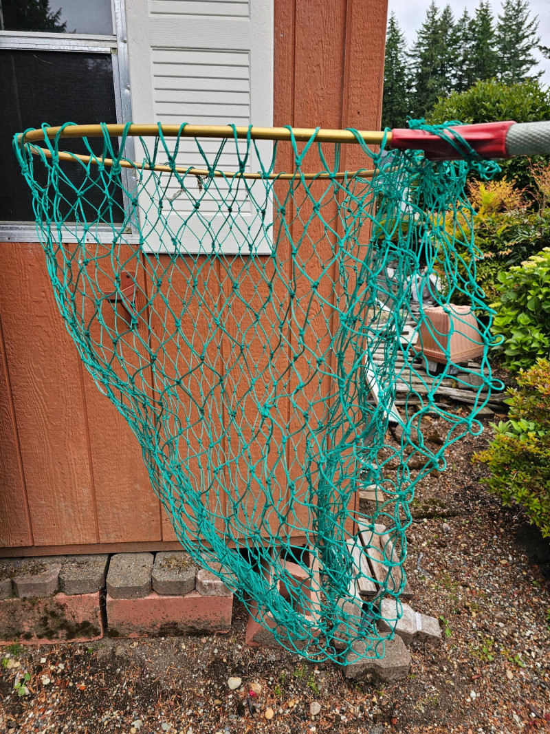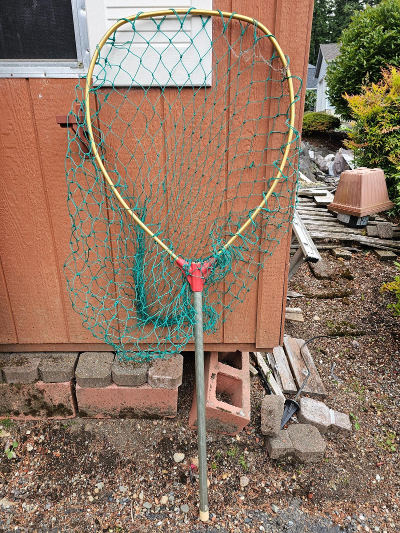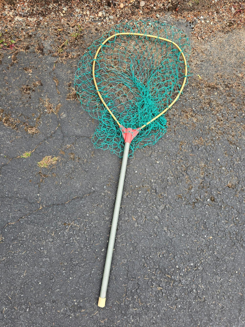 Large Fishing Or Landing Net Large fishing or landing net used for securing fish after they have been caught on a line Landing nets like this are essential for safely bringing fish into a boat or onto shore, especially larger or more active fish, preventing them from escaping Aluminum handle 64.5"T x 24"W Net ring is 28" x 24"