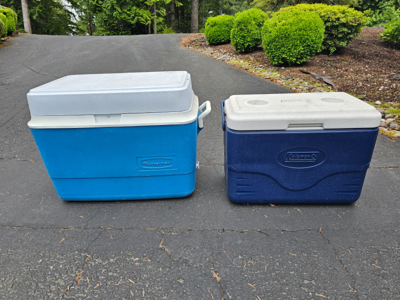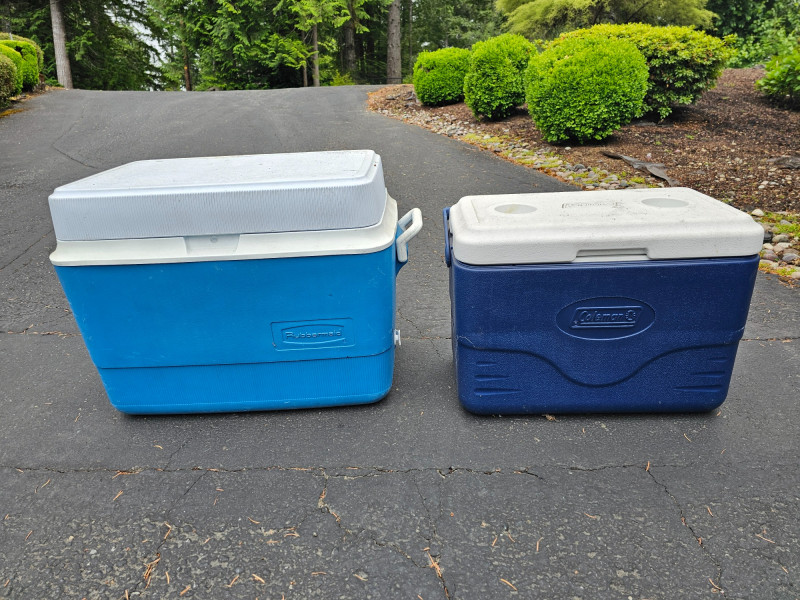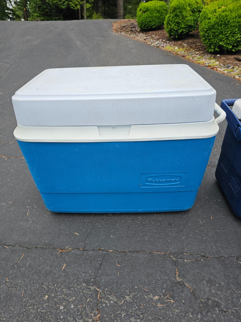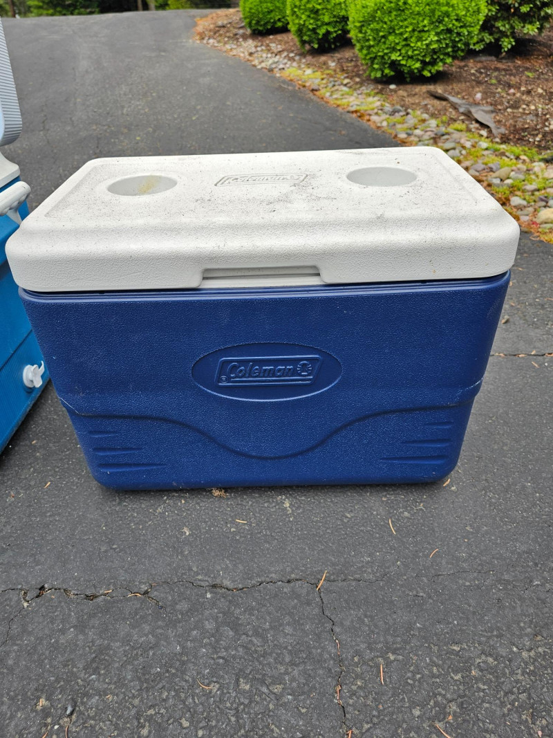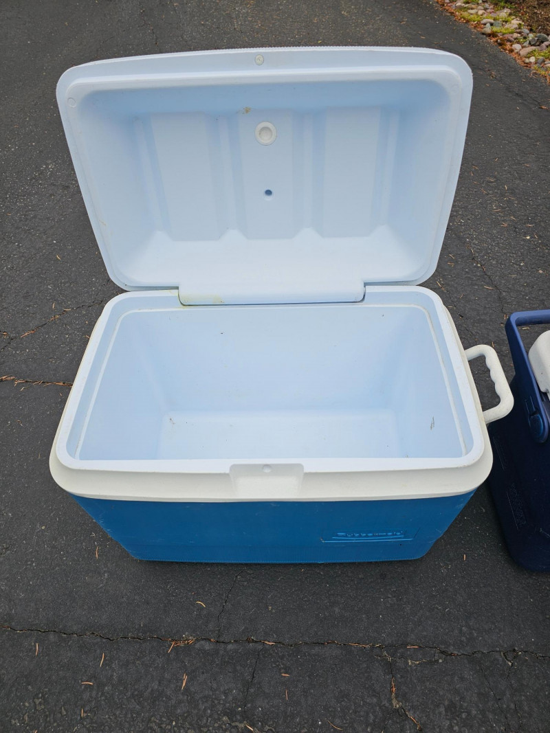 (2) Party Coolers (1) Rubbermaid blue large cooler 18"T x 21"W x 13"D (1) Coleman dark blue cooler 13.5"T x 19"W x 11"D Both could use a cleanup from storage