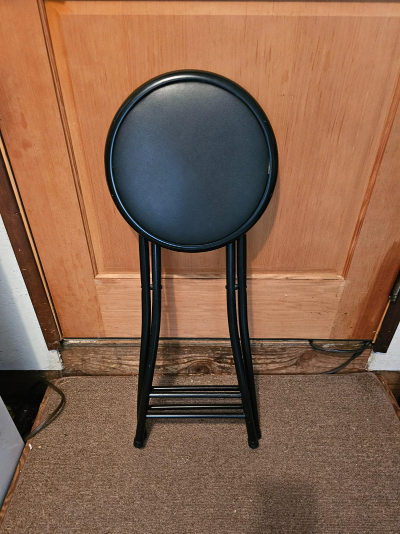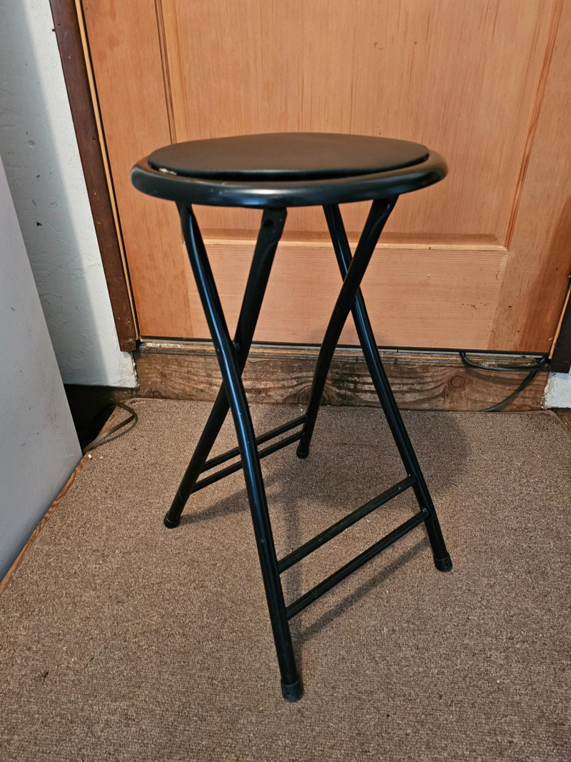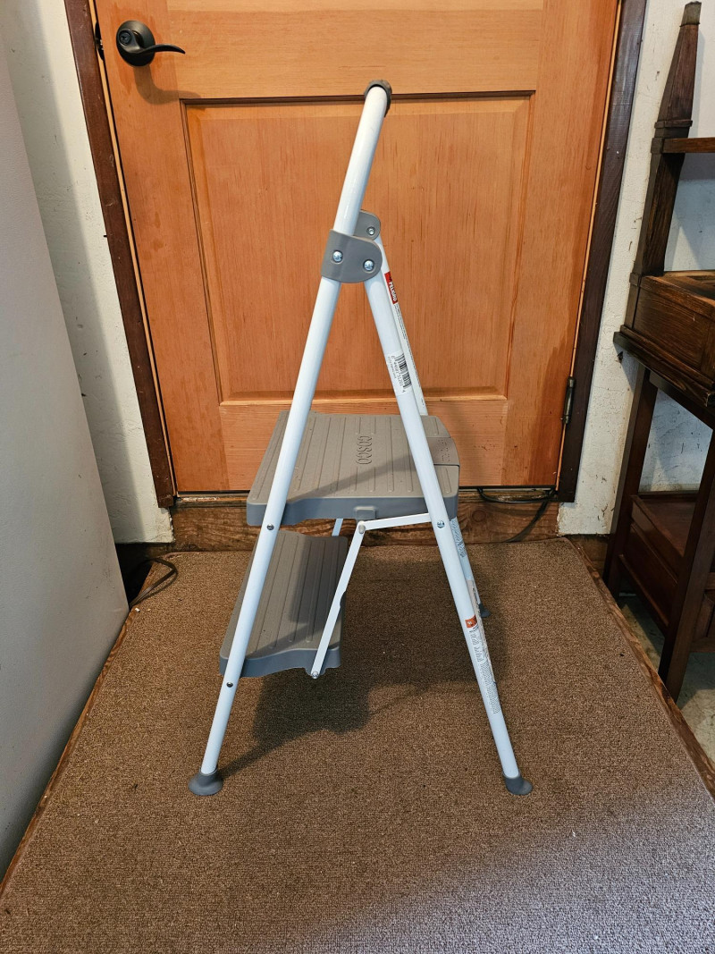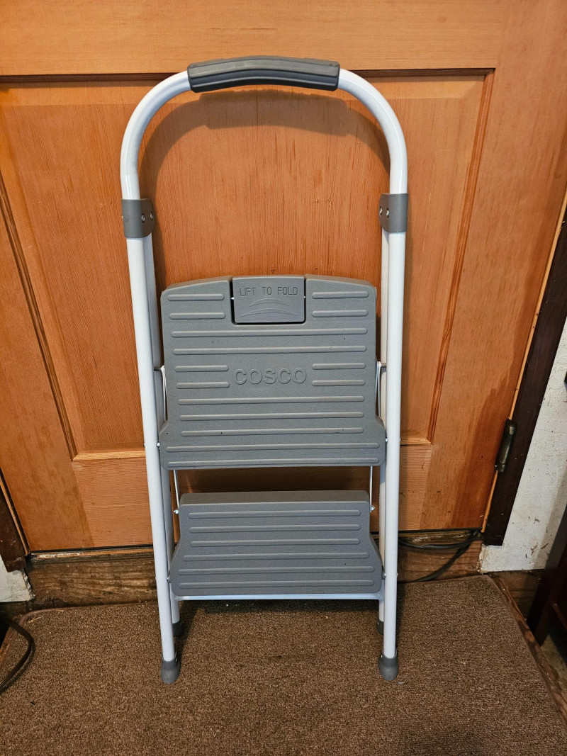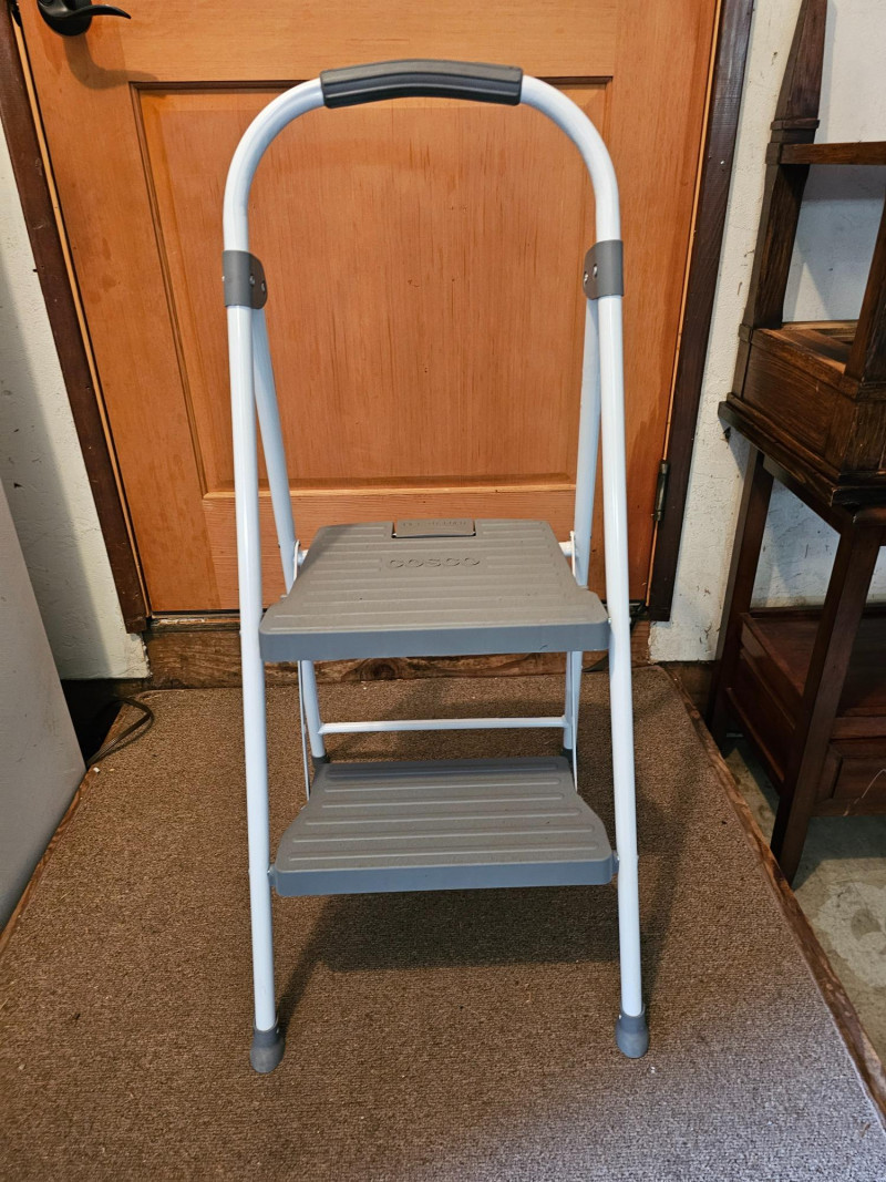 Cosco 2-Step Ladder & Folding Stool White Cosco 2-step ladder has gray plastic steps and padded rubber handle Locks in position 33"T x 18"W x 20"D Second step is 19" off the ground Black folding stool Seat locks in position 24"T x 14"W