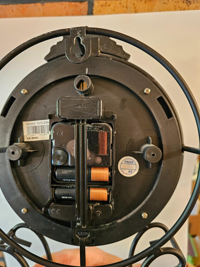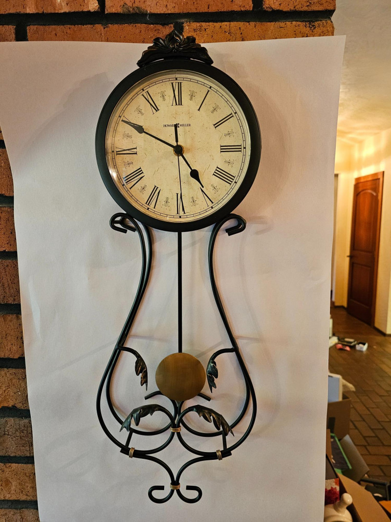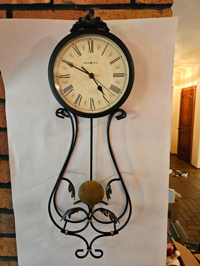 Howard Miller Pendulum Wall Clock Model #625-296 Commonly known as the "Paulina Wall Clock" Black iron & gold with patina gold Pendulum Tested - Works (with 2 AA batteries) 24"T x 8.5"W x 2"D