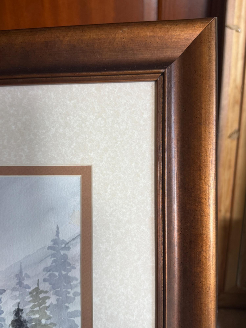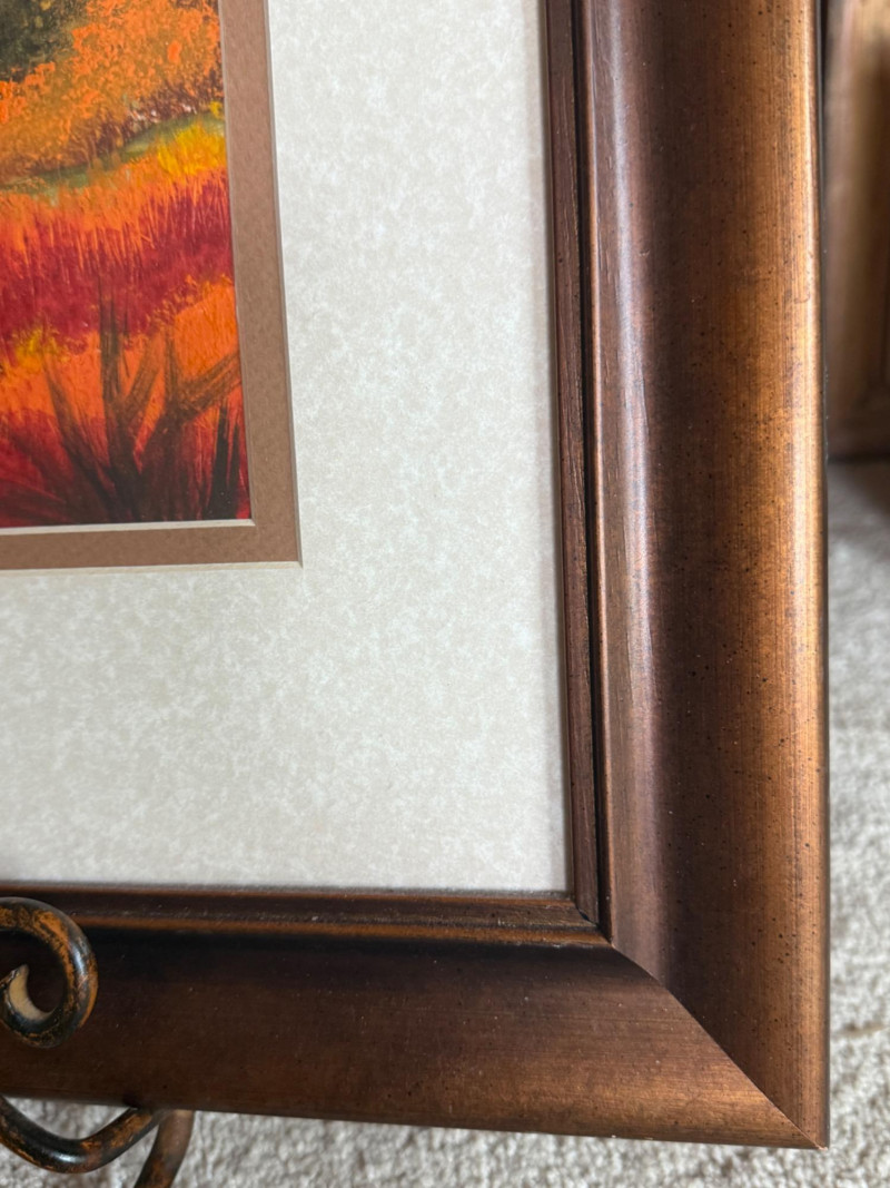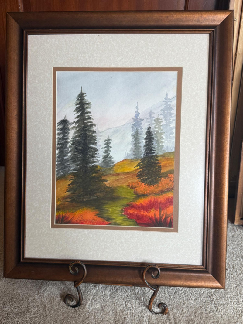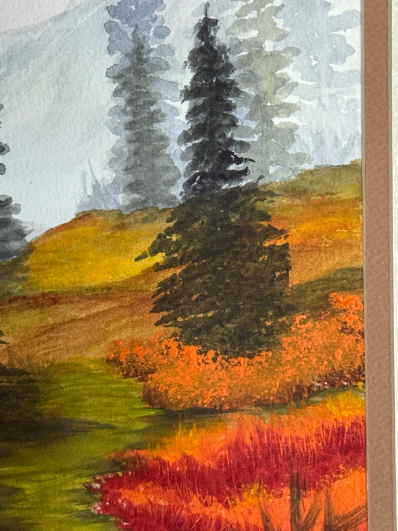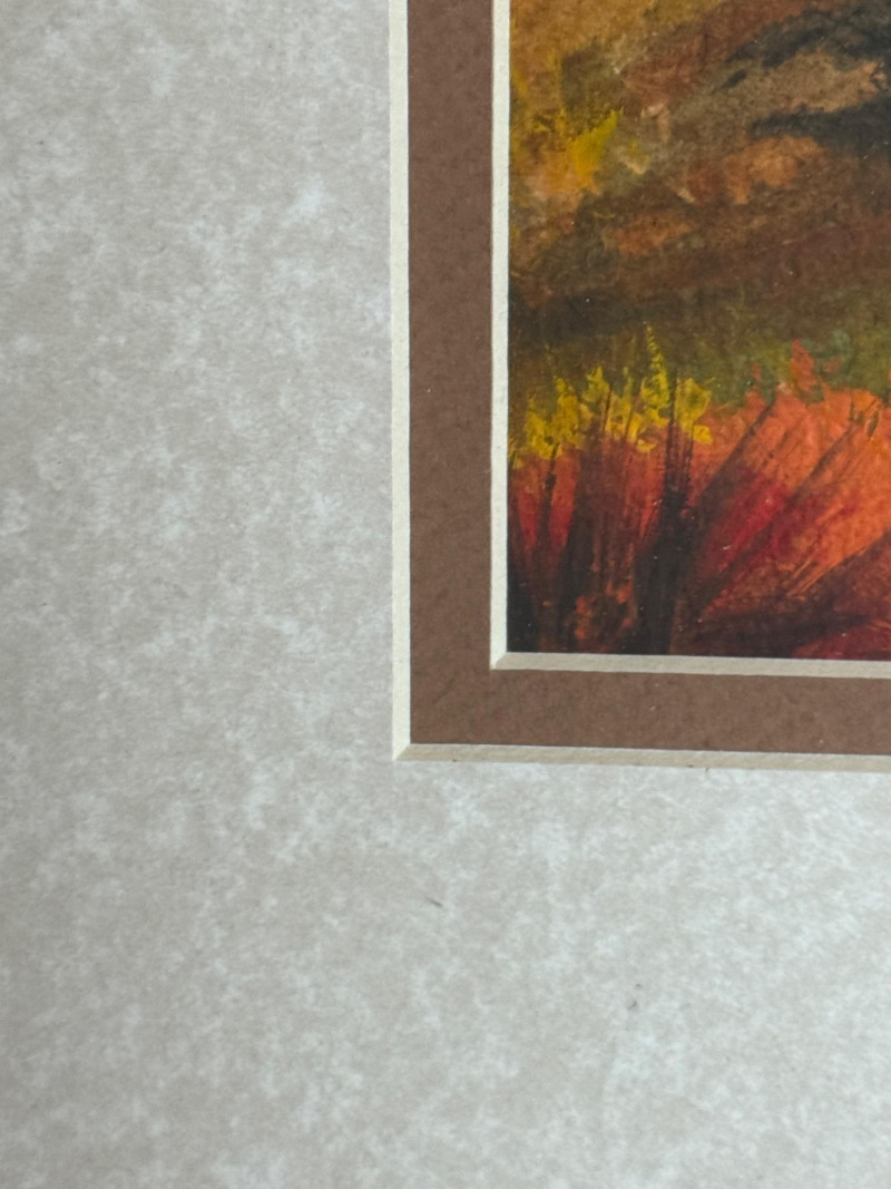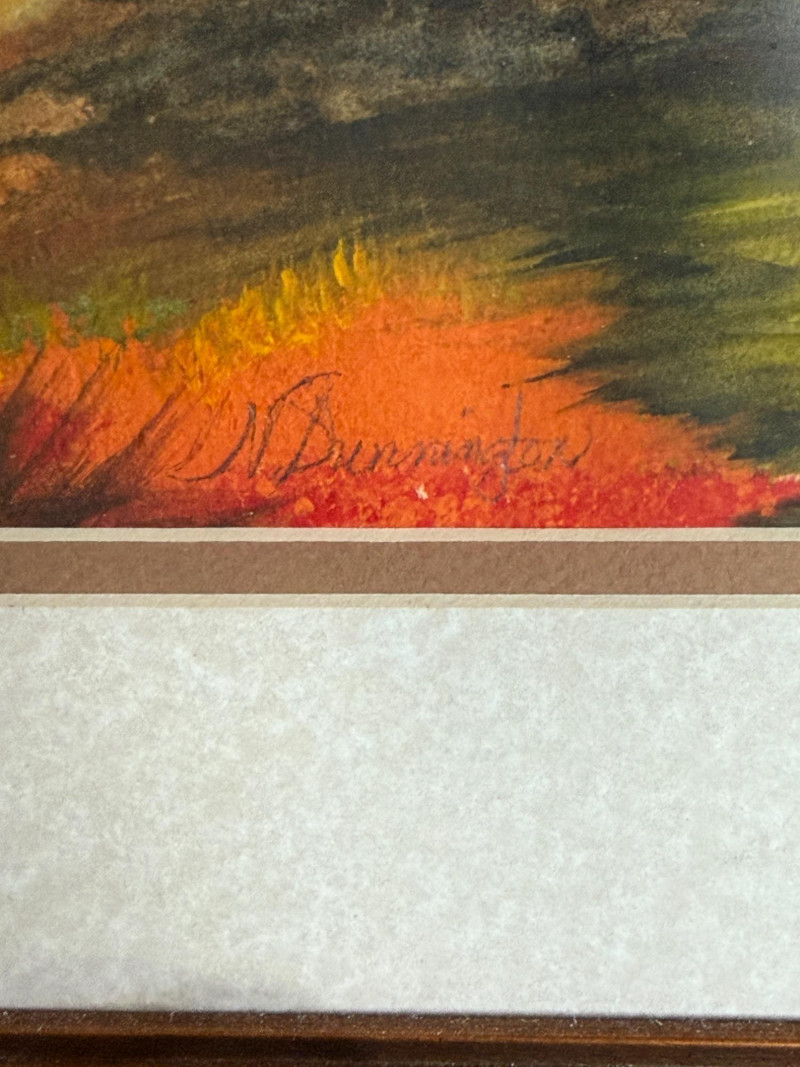 Original Watercolor by N Dunnington. Professionally framed in a bronze wood frame and double matted, under glass. Signed N Dunnington Rich orange and deep green