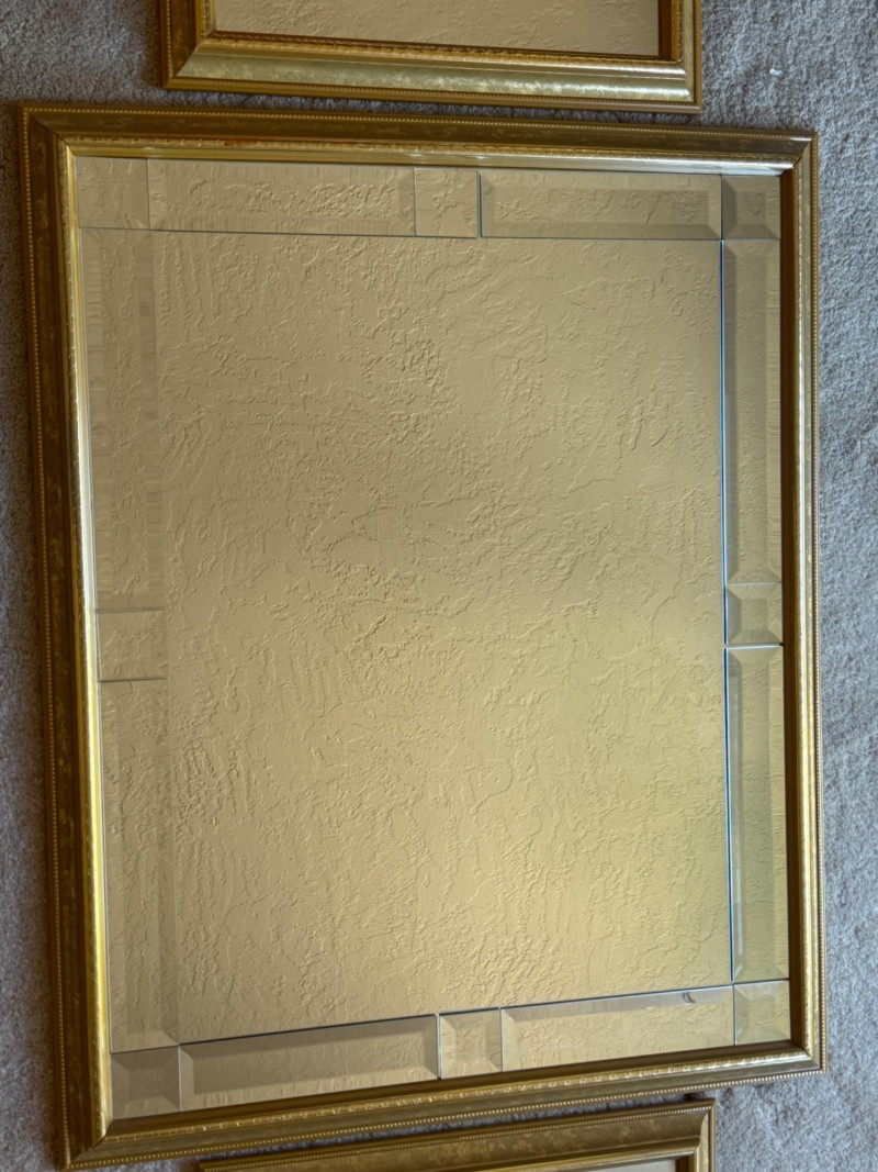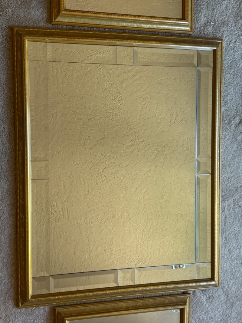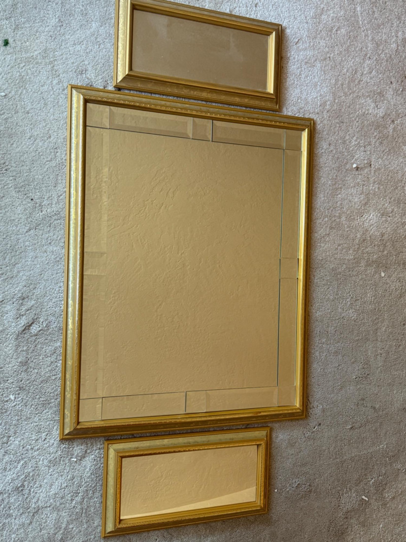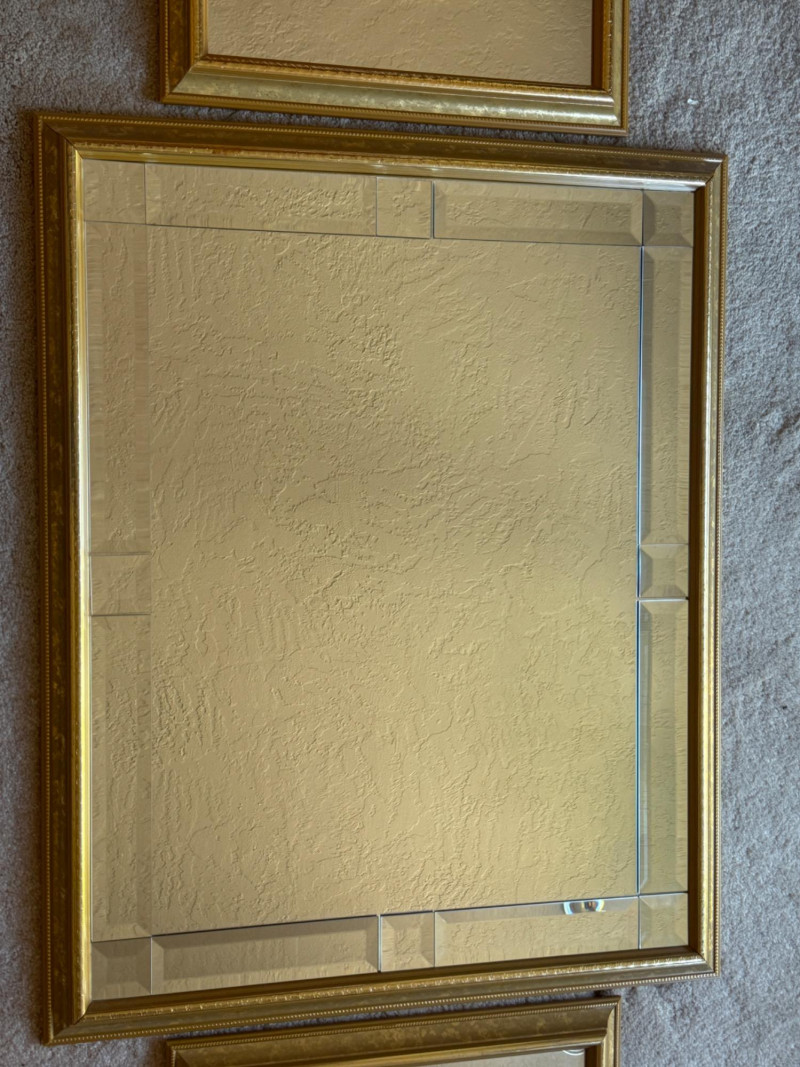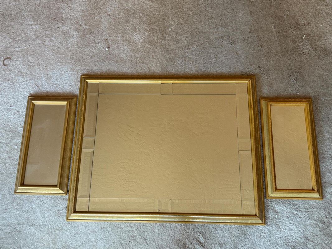 Three Piece Mirror Set Gold framed mirror with bevel accents 30.5x24.5”. 2 Side mirrors are 16.5x8.5” each. No bevels.