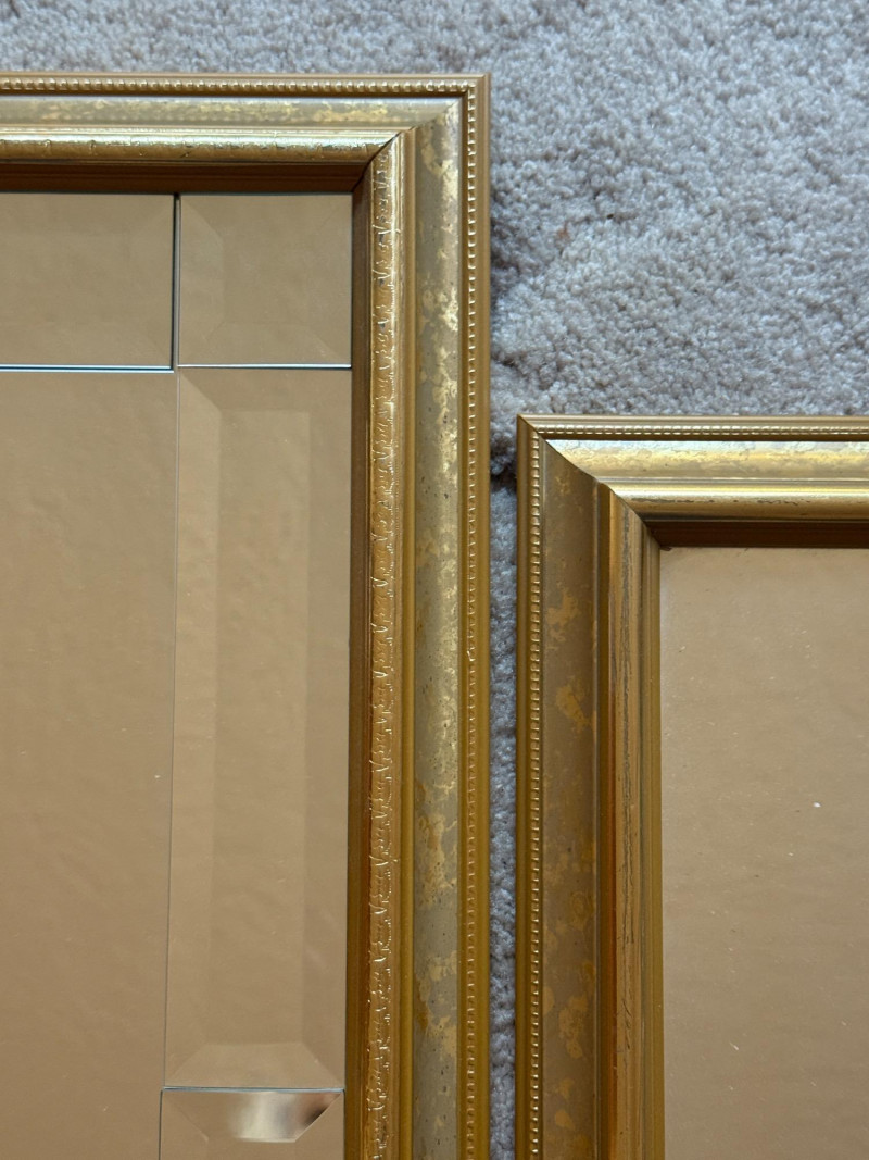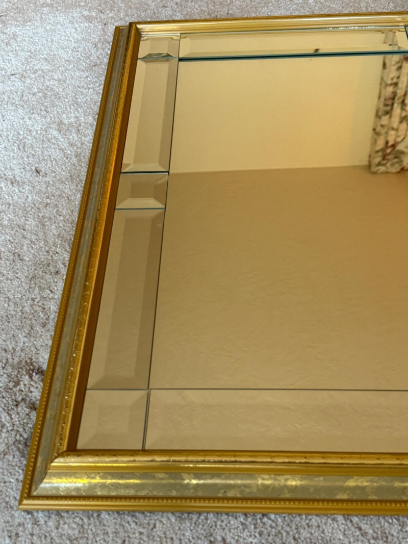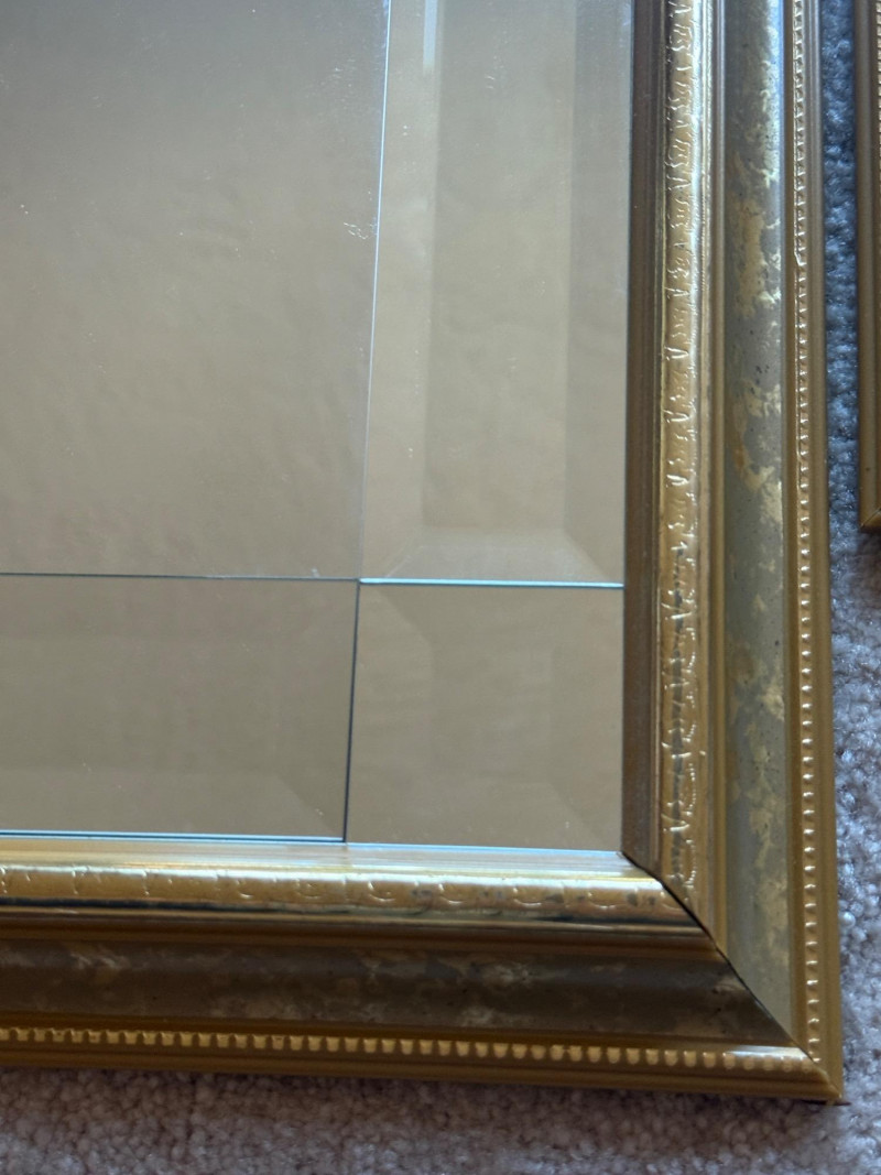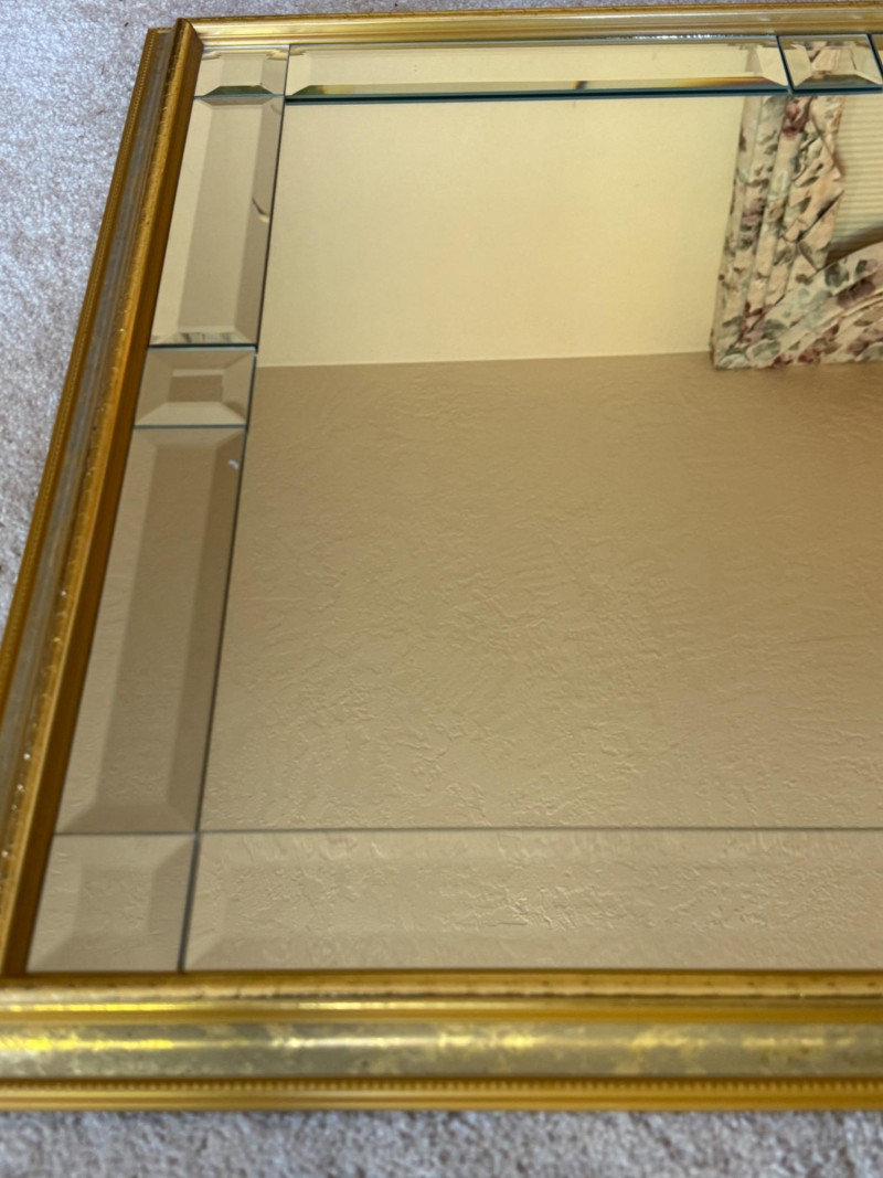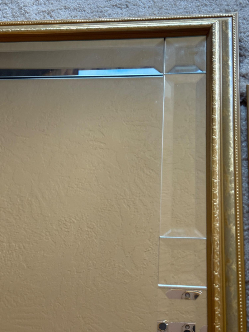 Three Piece Mirror Set Gold framed mirror with bevel accents 30.5x24.5”. 2 Side mirrors are 16.5x8.5” each. No bevels.