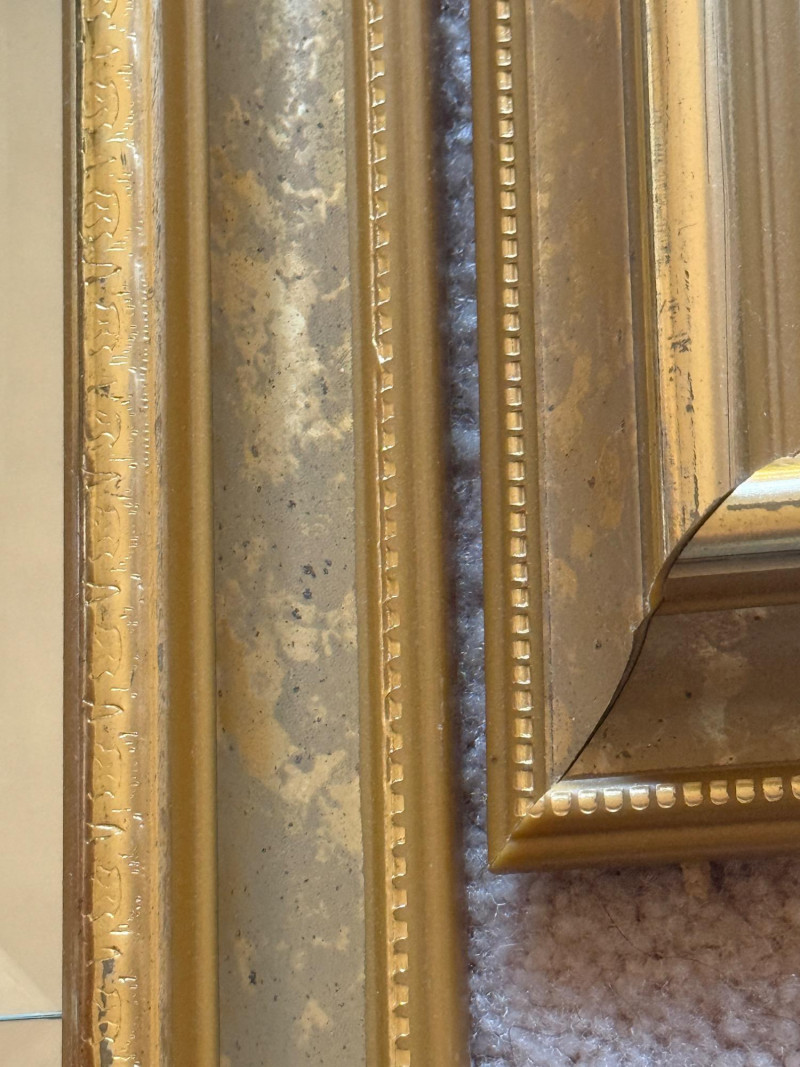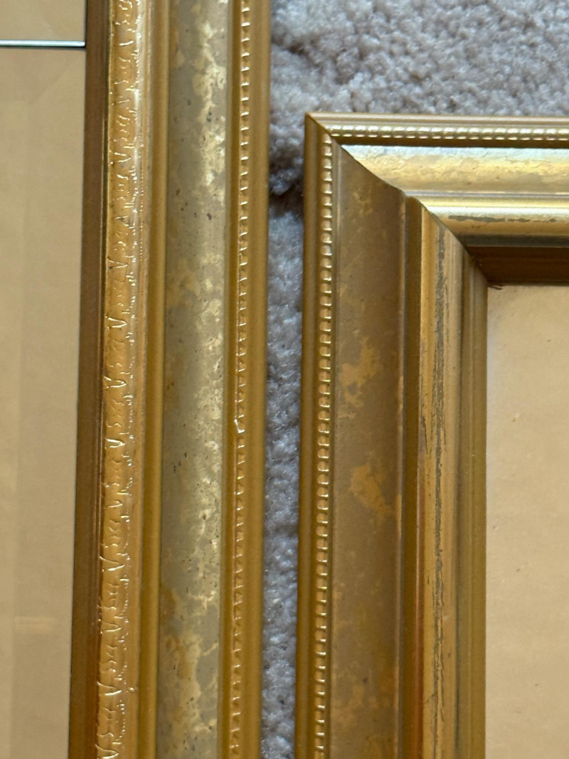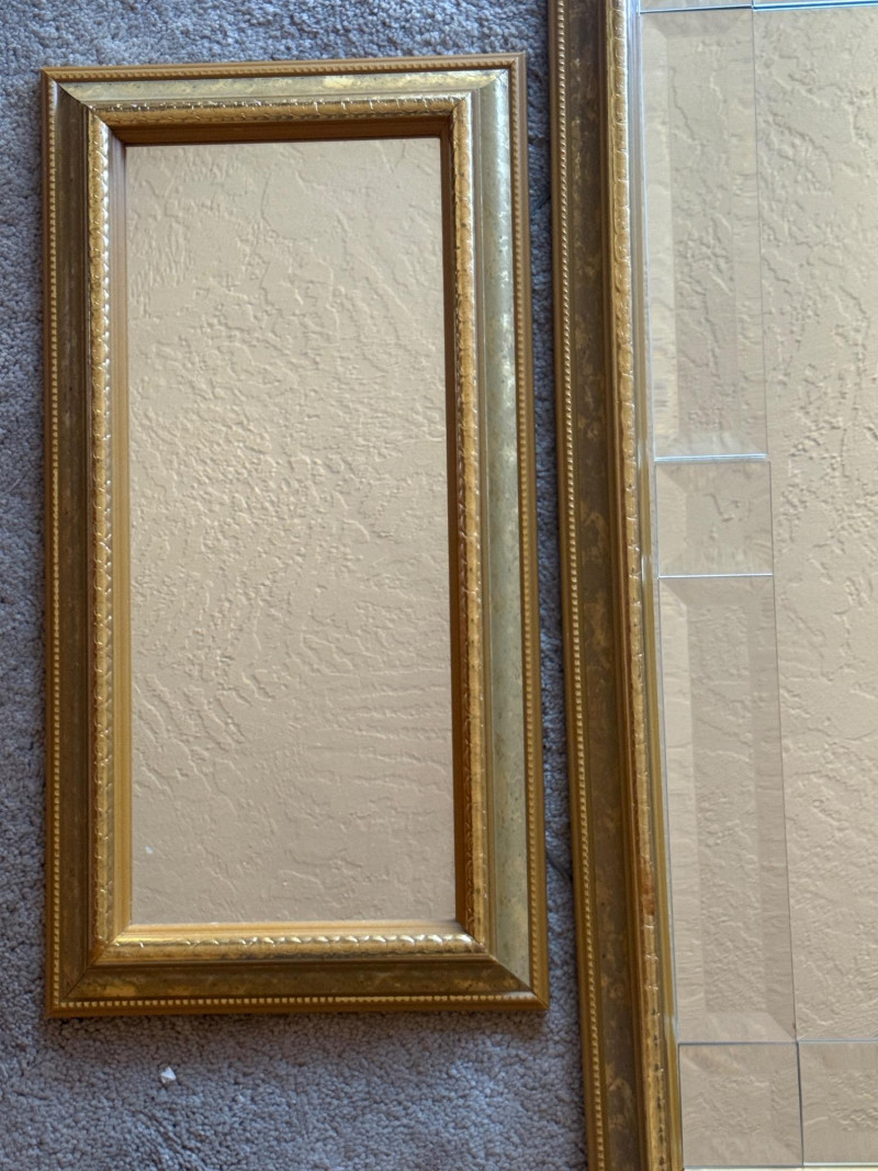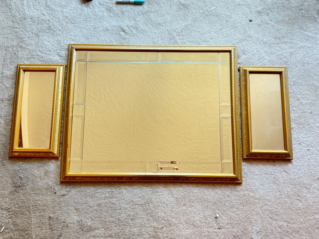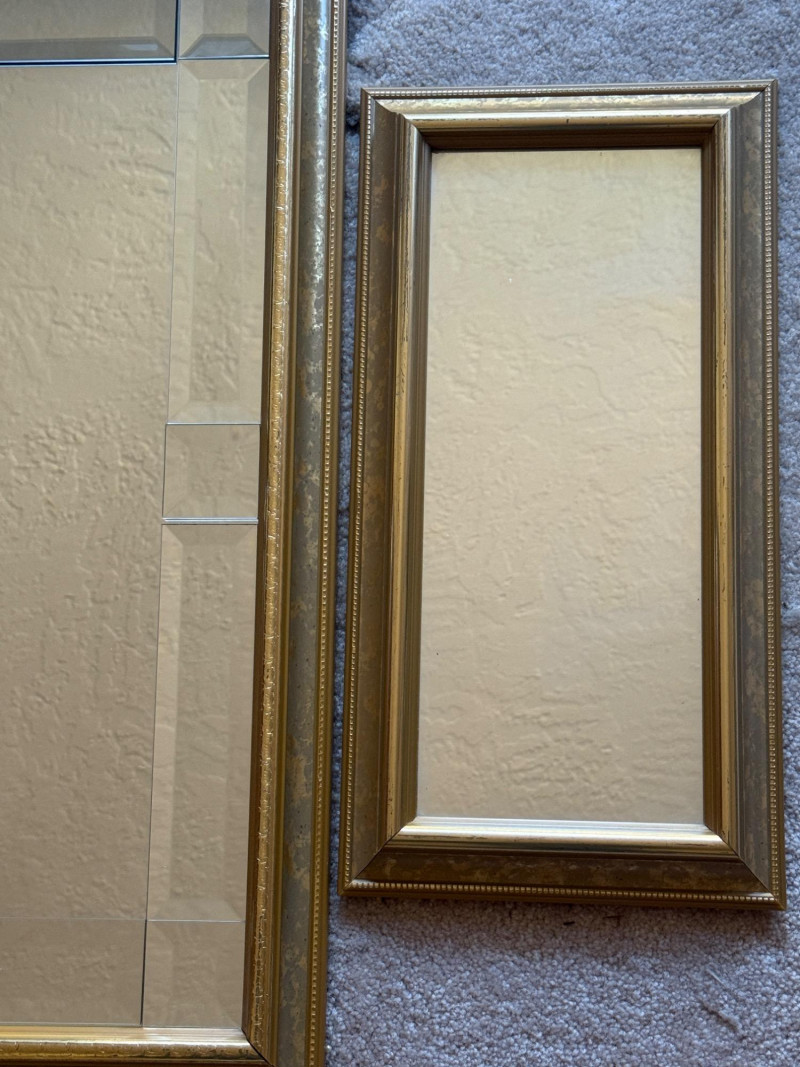 Three Piece Mirror Set Gold framed mirror with bevel accents 30.5x24.5”. 2 Side mirrors are 16.5x8.5” each. No bevels.